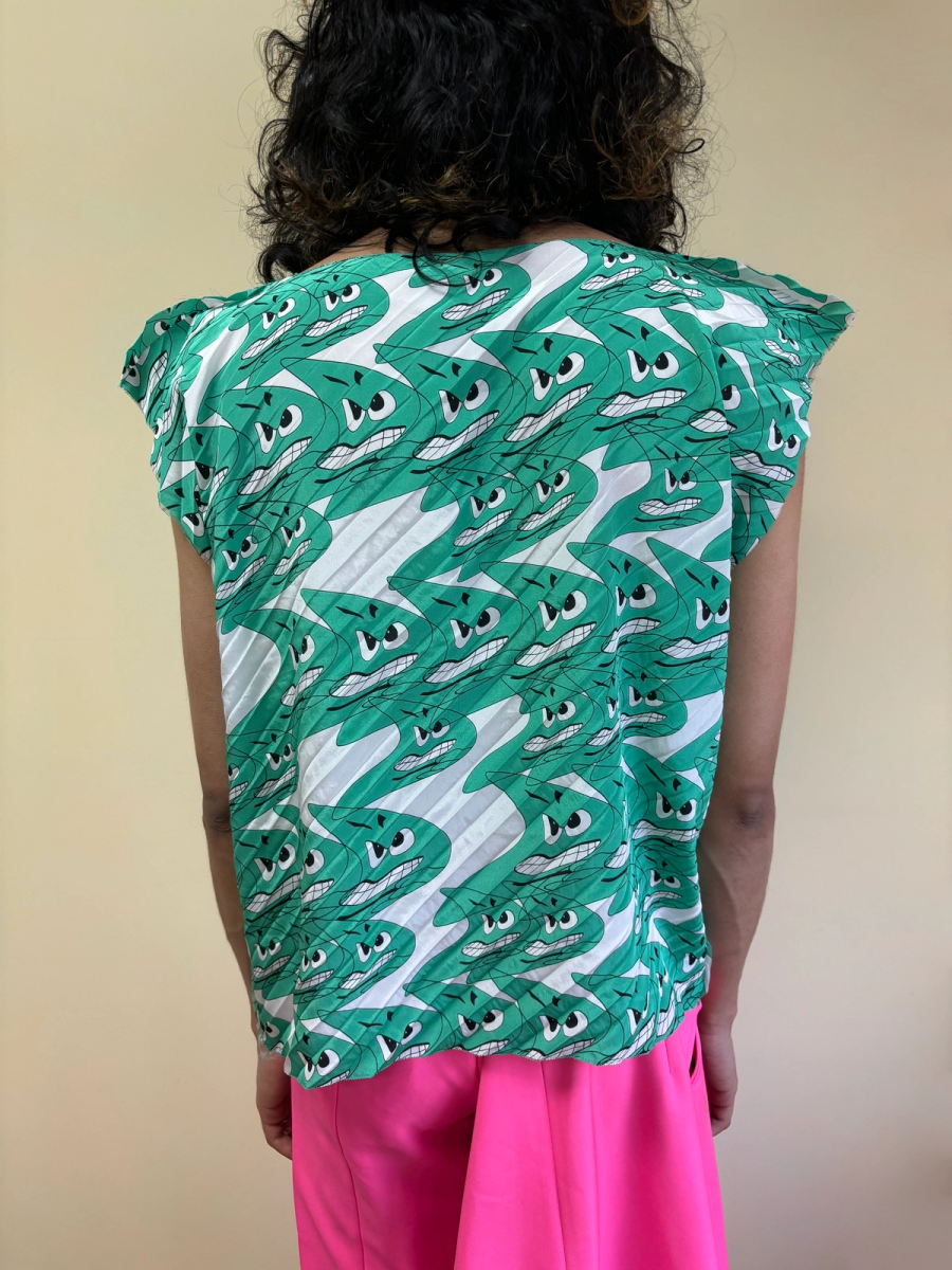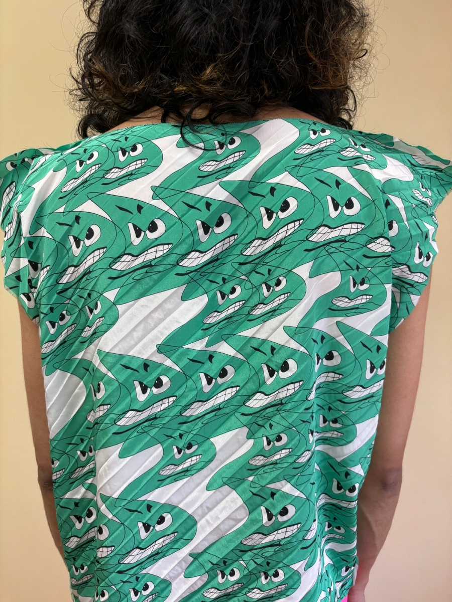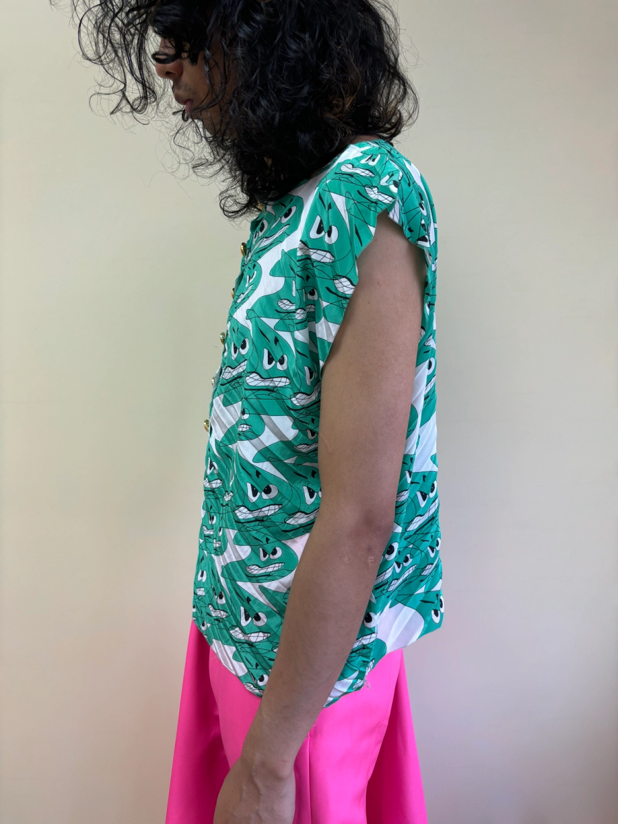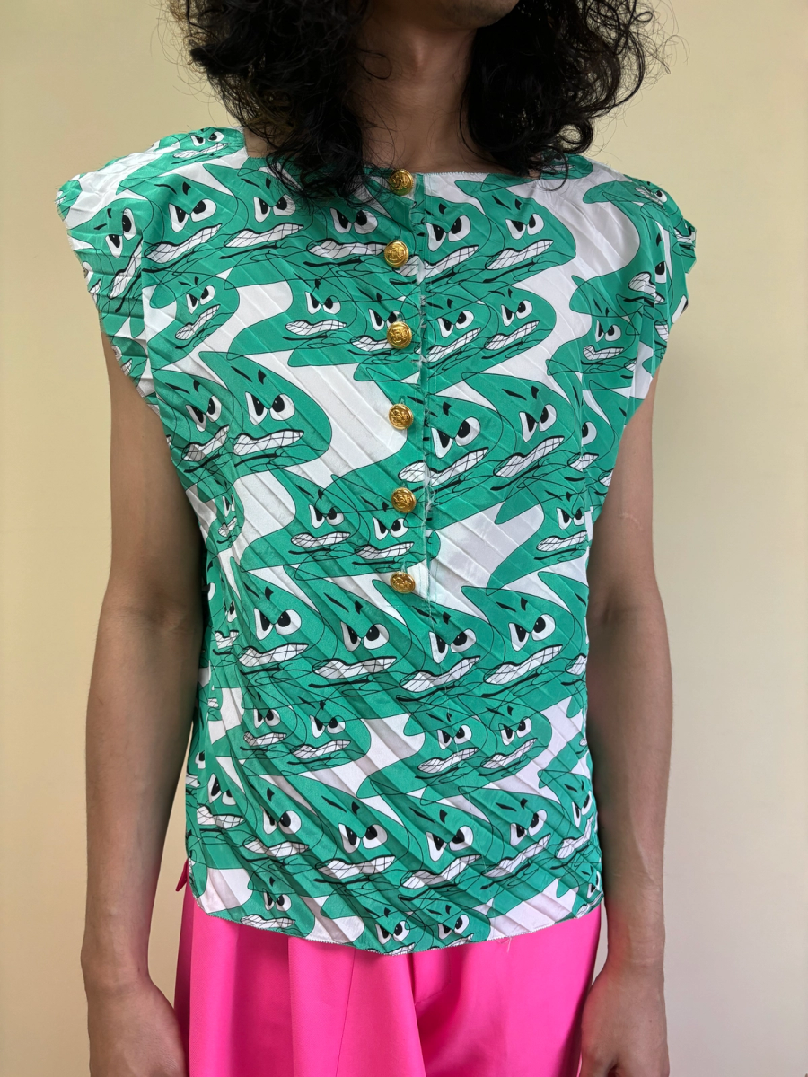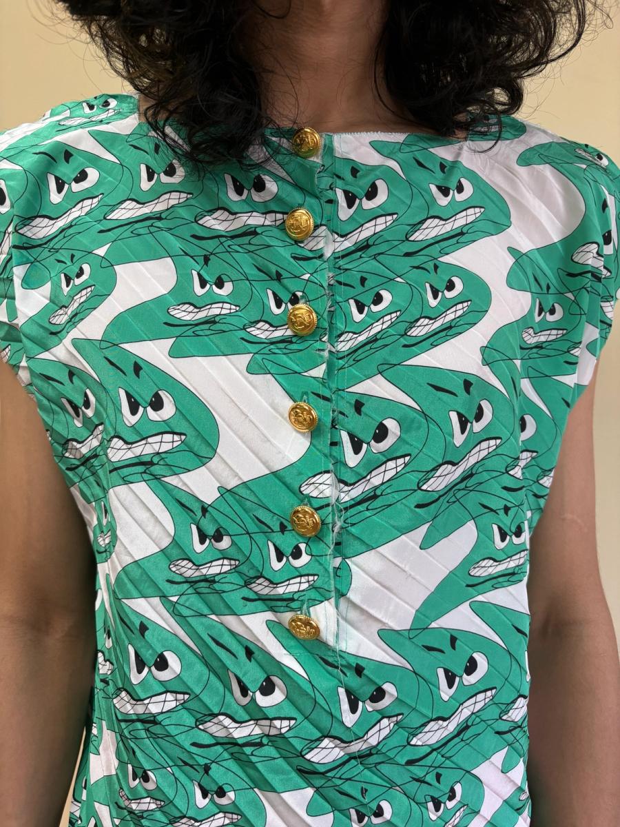 Bernhard Willhelm slightly pleated blouse with animated green tears. There are faux gold buttons along the front of the top with anchors on them. Unisex.