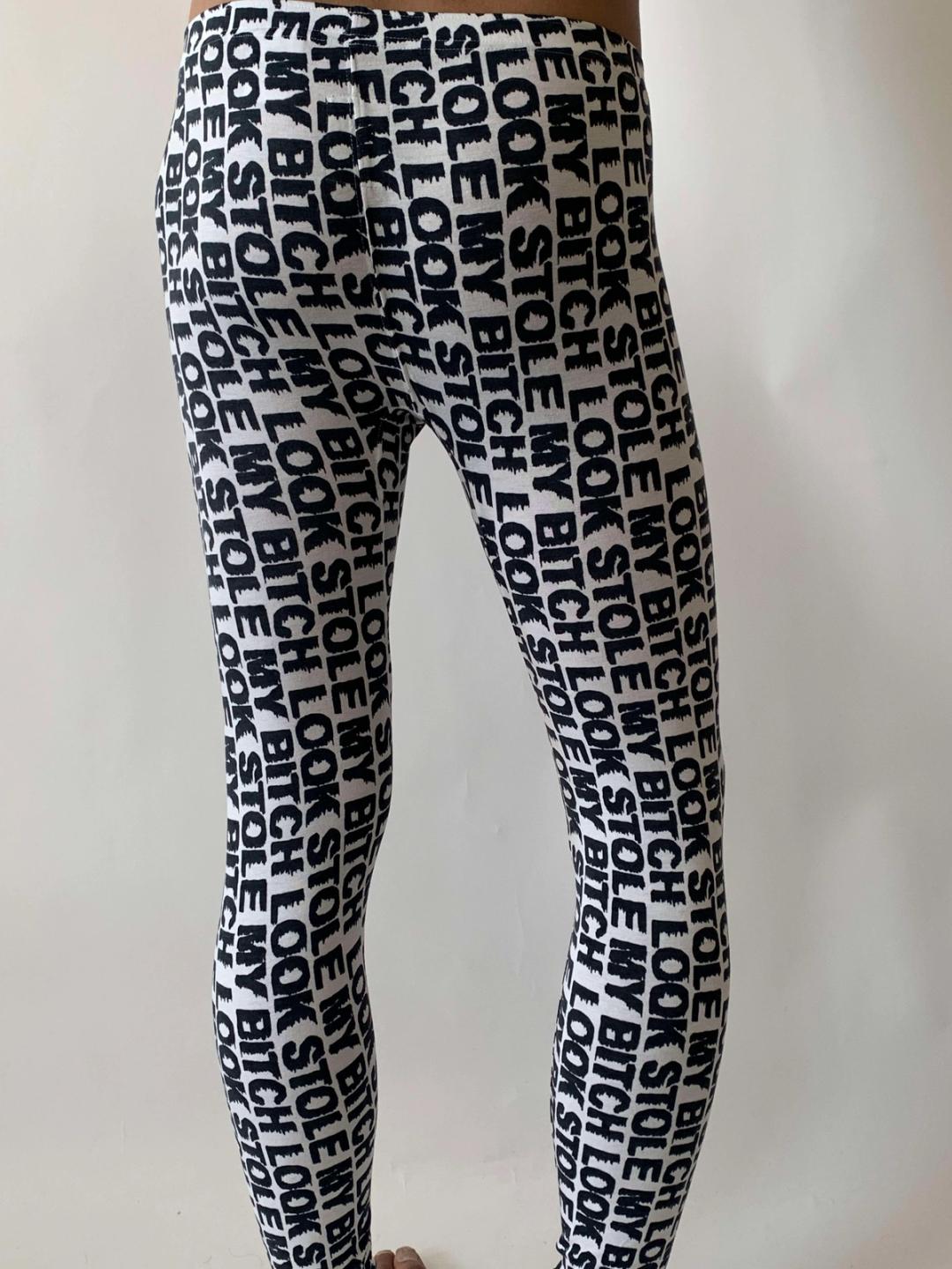 Vintage Bernhard Willhelm "Look Stole My Bitch" leggings. The leggings are made of a stretch cotton and have an all-over text print. They're quite stretchy.