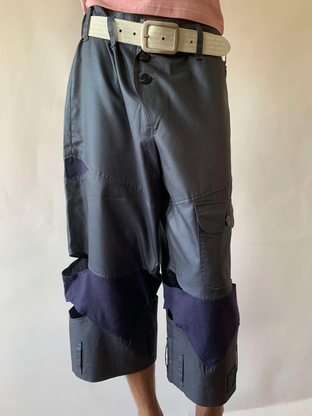 Baggy flooded pants by rare label Bio Politics. They have a loose oversized silhouette with an asymmetrical button fly. Beltloops around the ankles can be used to cinch if so desired. Grey with alternating mauve contrasting details.