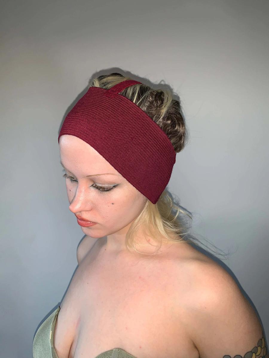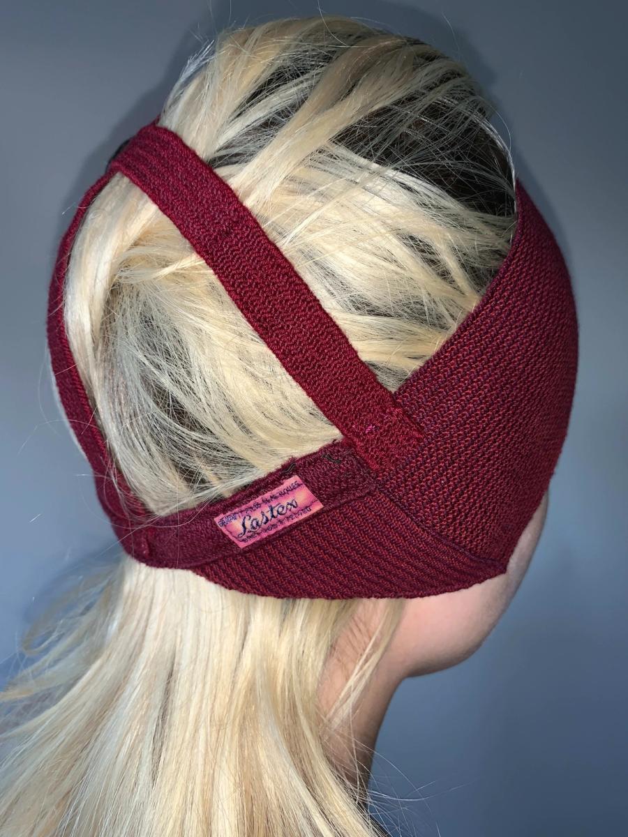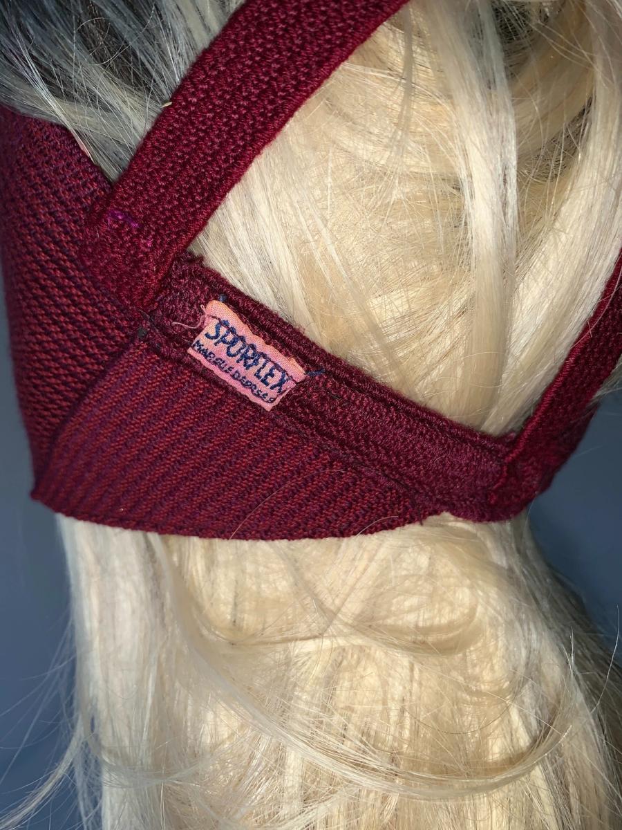 Art Deco knit cage cap/headband in burgundy. Tag says it's made by "Lastex" and is called a "Sporflex" hat. Endless styling possibilities -- chic and avant garde! The hat is in perfect condition without signs of age, seemingly unused. Stretchy, one size fits most.