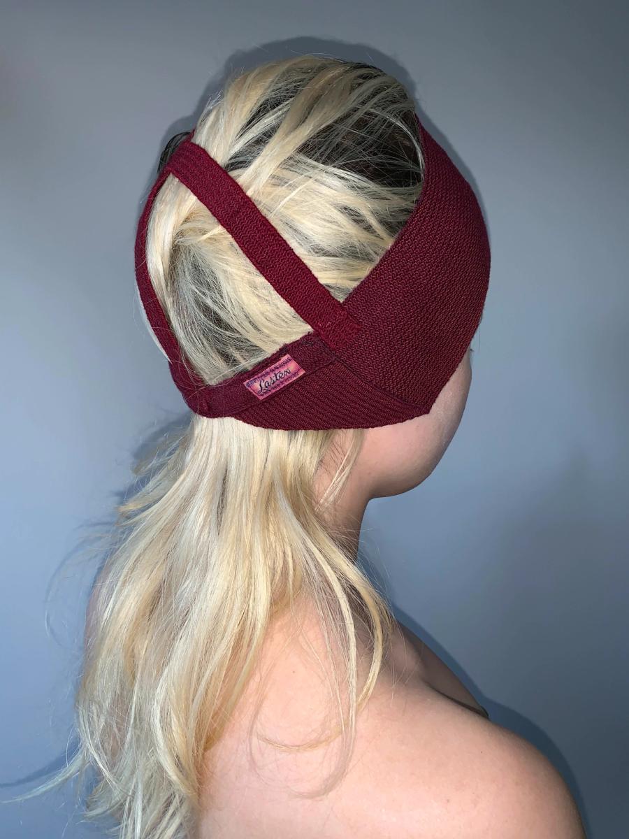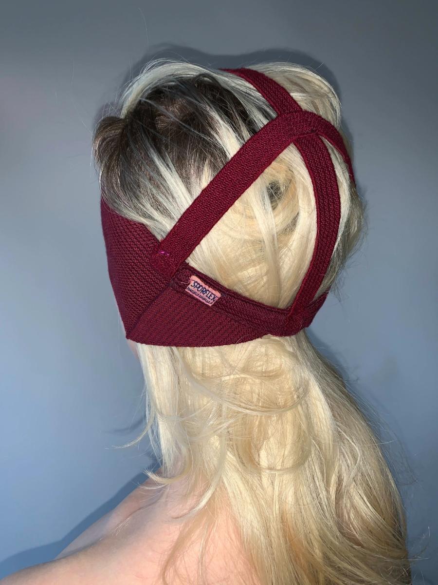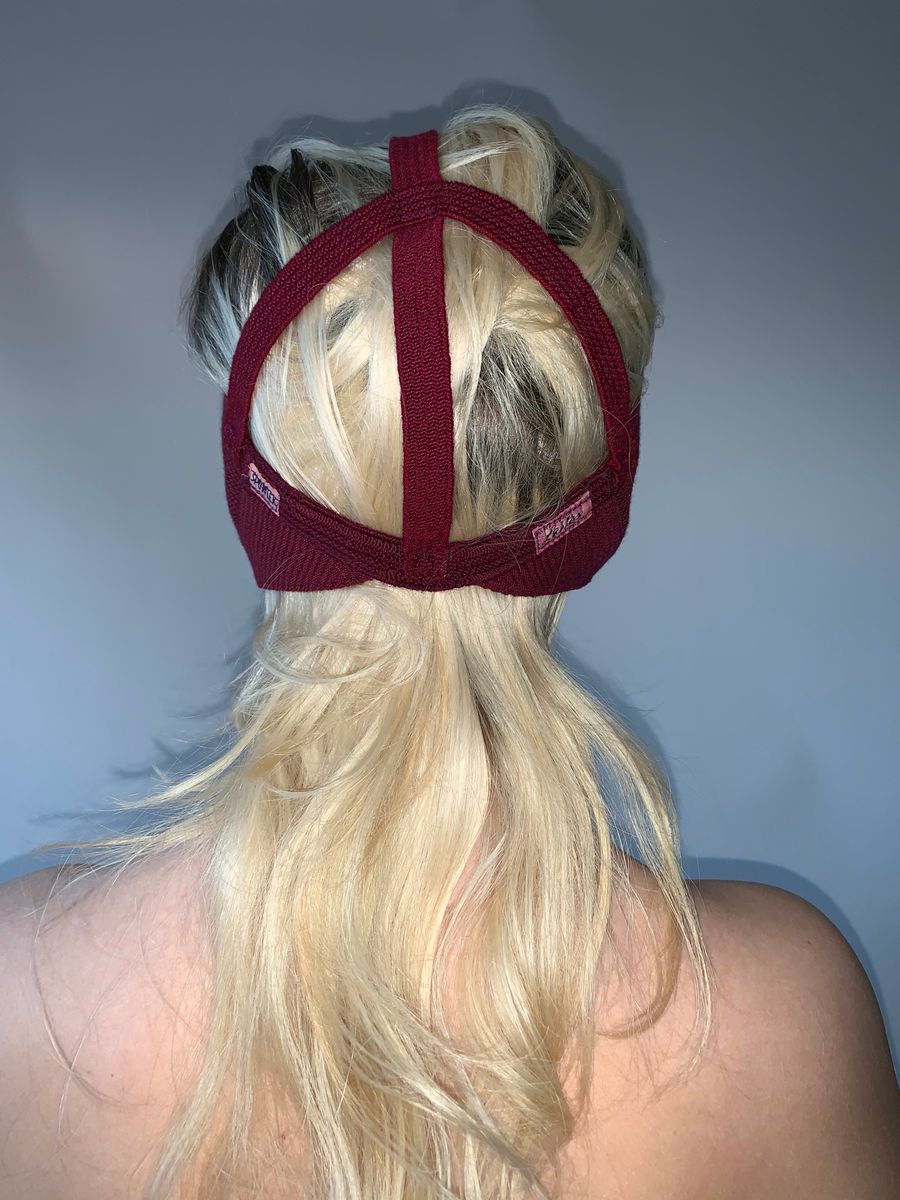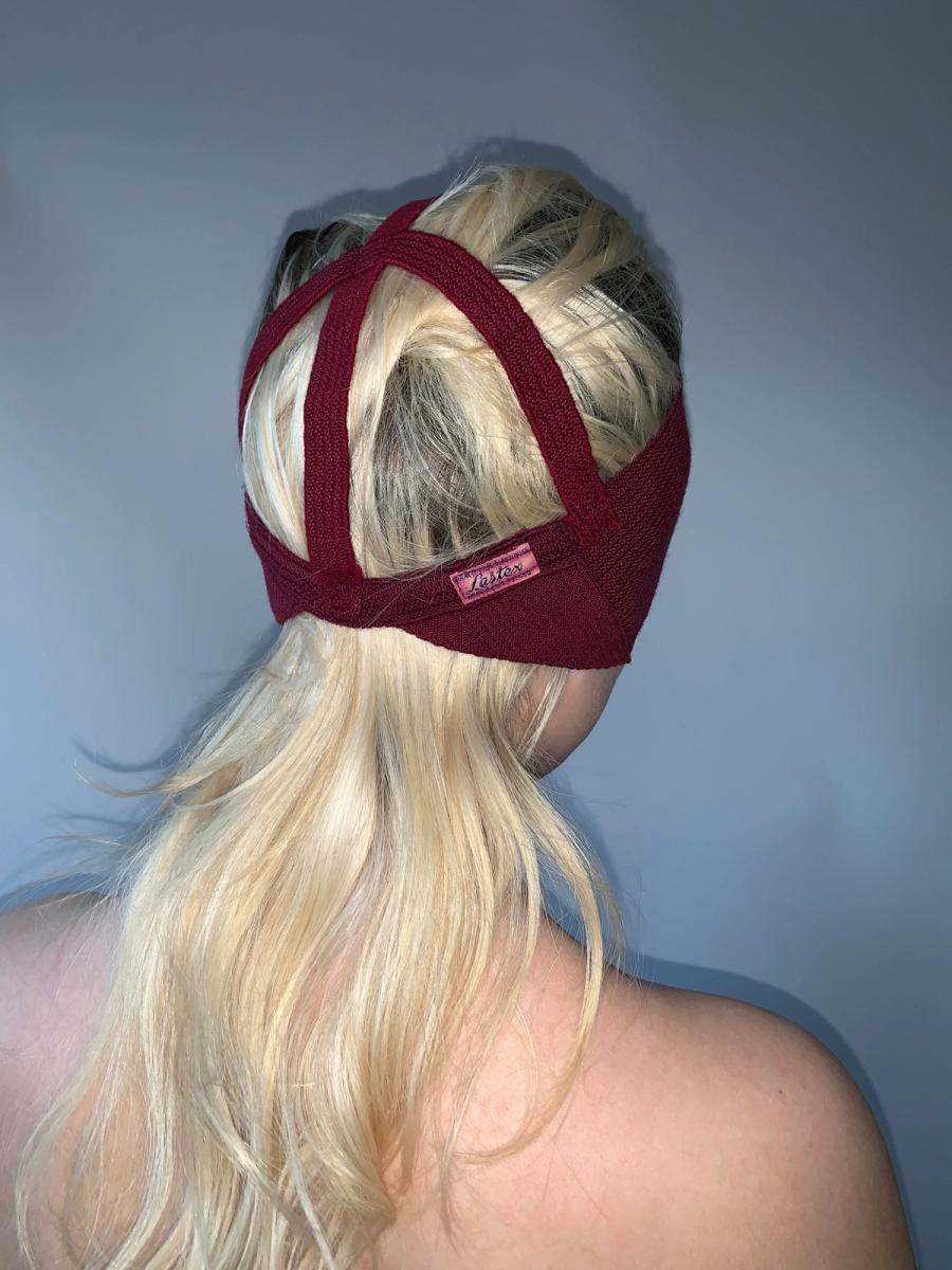 Art Deco knit cage cap/headband in burgundy. Tag says it's made by "Lastex" and is called a "Sporflex" hat. Endless styling possibilities -- chic and avant garde! The hat is in perfect condition without signs of age, seemingly unused. Stretchy, one size fits most.