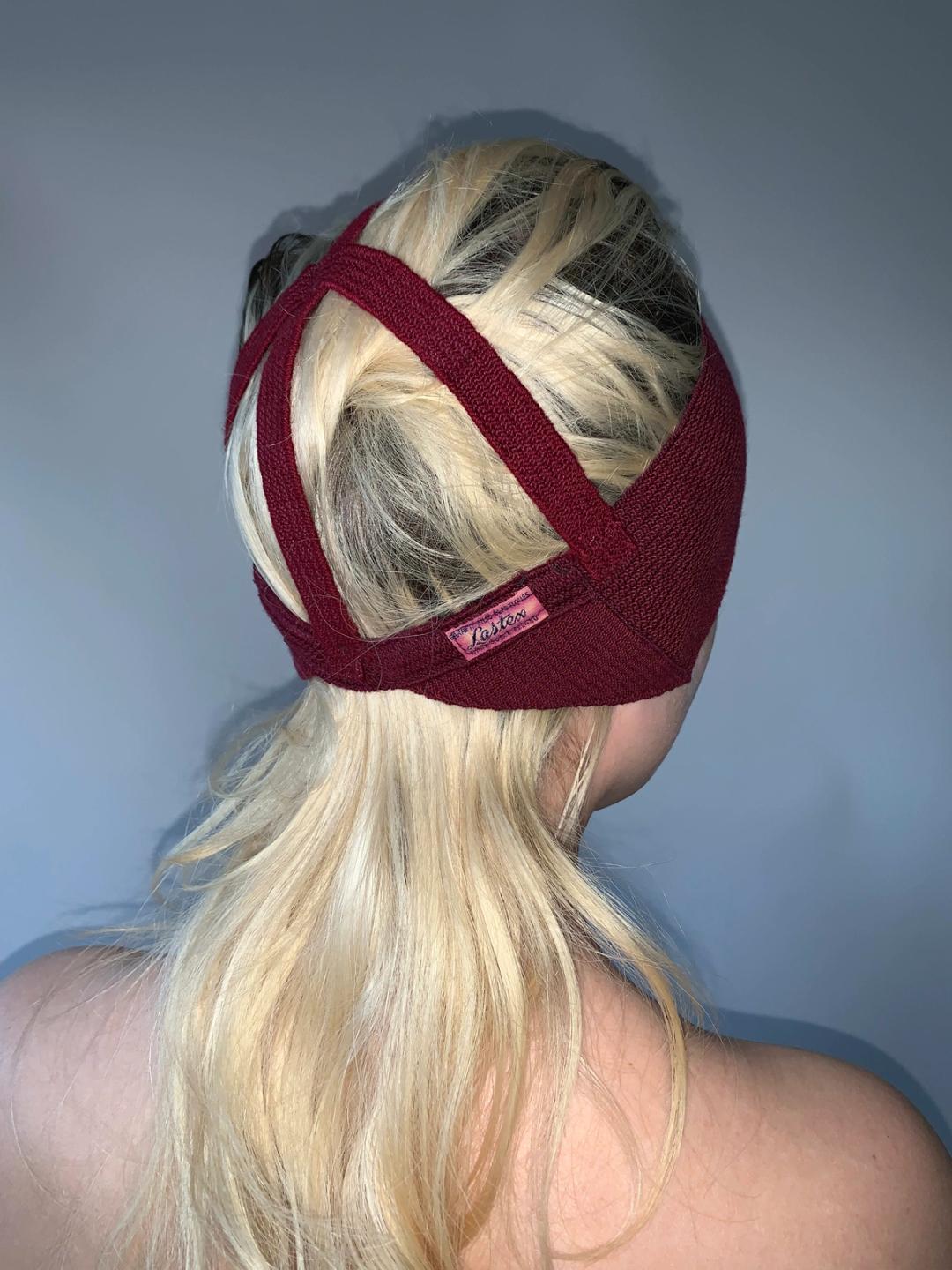 Art Deco knit cage cap/headband in burgundy. Tag says it's made by "Lastex" and is called a "Sporflex" hat. Endless styling possibilities -- chic and avant garde! The hat is in perfect condition without signs of age, seemingly unused. Stretchy, one size fits most.