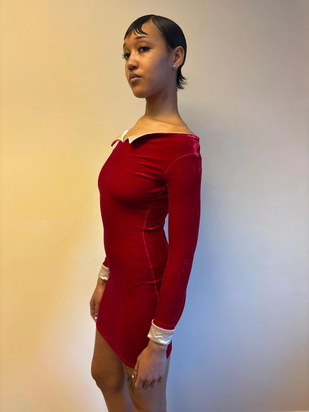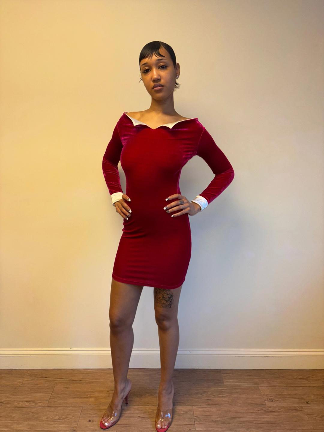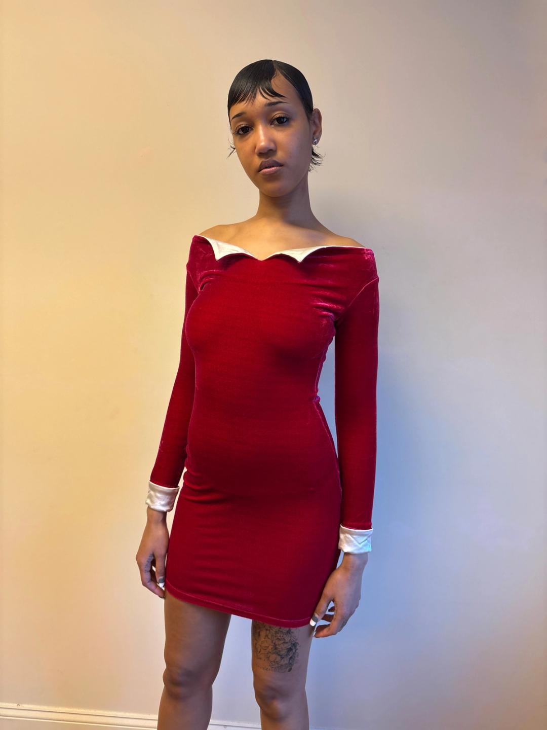 Vintage 90s Capucine Puerari hot pink velvet and white satin collared dress. The dress is quite stretchy and fitted. Sexy and cartoonish!