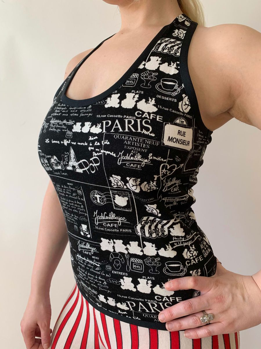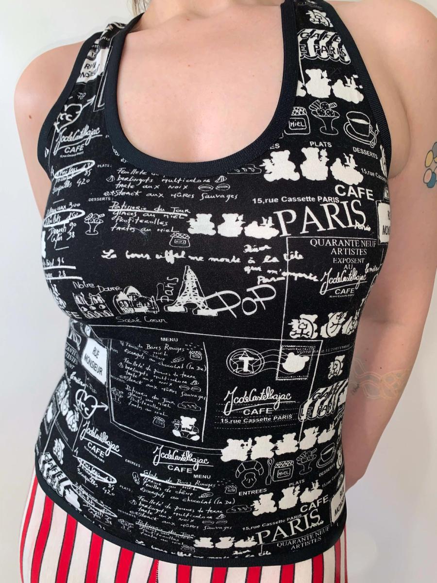 Adorable Paris theme printed top by Castelbajac. The print has a collaged effect, with cafe writing, postcards, teddy bears along with other Parisian imagery. The top has a lot of stretch and a fitted flattering silhouette. It's fairly versatile in size. The back of the shirt has a crisscross keyhole design, which provides some support! Labeled size 1.