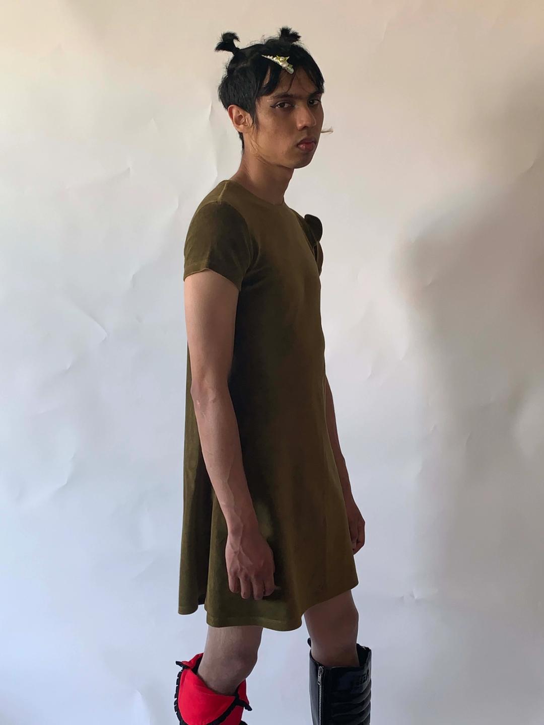 Vintage minidress from French designer, JC de Castelbajac. The dress is made of an olive green velvet material and has a very unique teddy bear design on the sleeve. Teddy bears are often seen in Castelbajac's work and serve almost as a brand mascot of sorts. This particular bear has light blue gemstone eyes. Such a cute and whimsical design! Marked size 42.