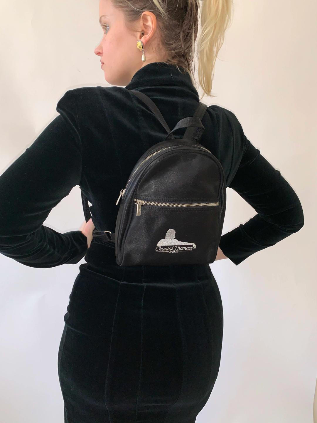Chantal Thomass mini backpack from the 1990s. It's in a black satin fabric with Chantal Thomass' iconic logo embroidered, also found on the metal zipper pulls. The straps are also made out of the satin fabric and are adjustable. In pristine and seemingly unused condition.