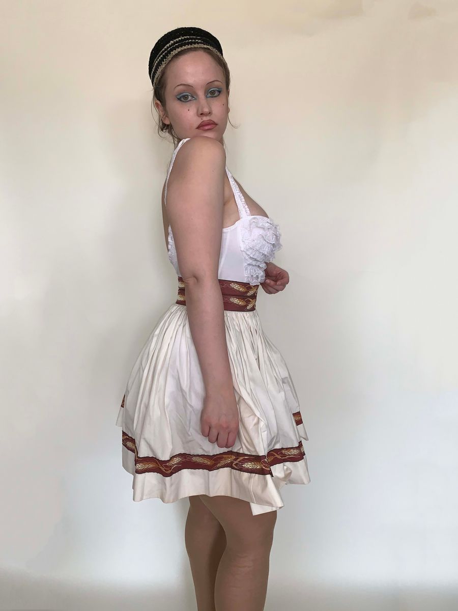 Chantal Thomass, A-line gathered circle skirt that comes above the knee. Ivory lightweight gathered cotton with Grosgrain ribbon borders. French pastoral Summer fantasy!