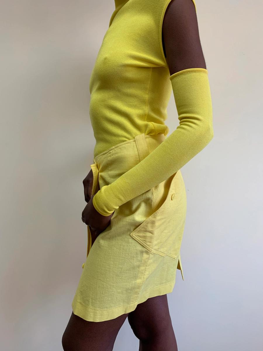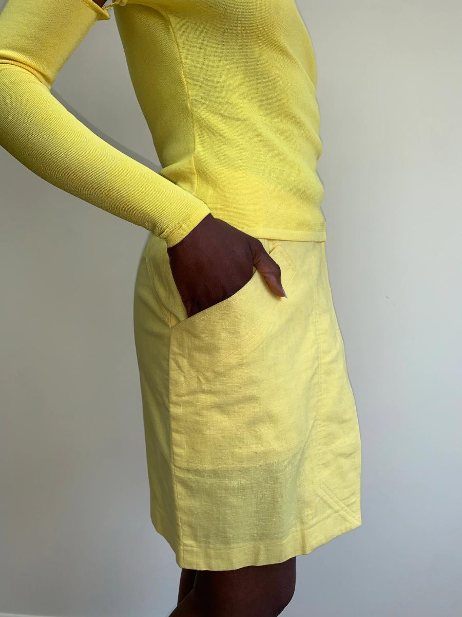 Claude Montana bright yellow linen wiggle skirt with large, asymmetrically placed pocket. The button up the front closure almost mimics an oversized pants fly.