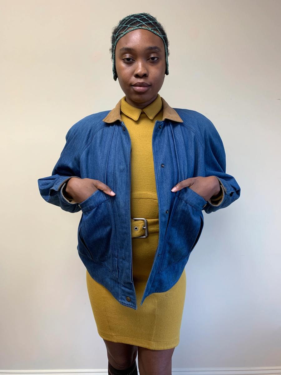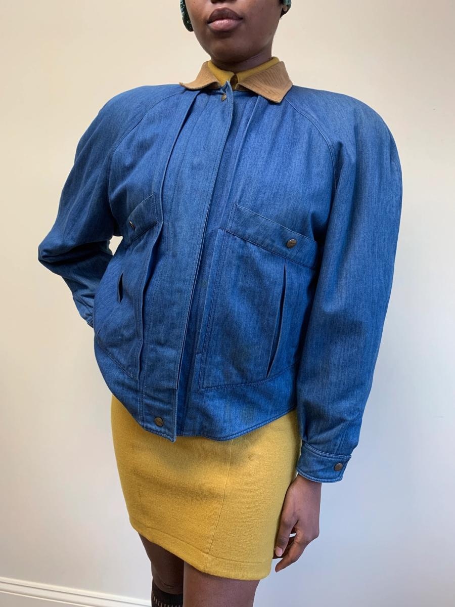 Claude Montana jacket from 1985 featuring signature dramatic construction. Made from a blue denim fabric with prim corduroy collar. It has roomy pockets at the front, and has a cosy quilted interior. Because of the roomy fit it's also easy to layer underneath. An avant-garde yet eminently wearable style.