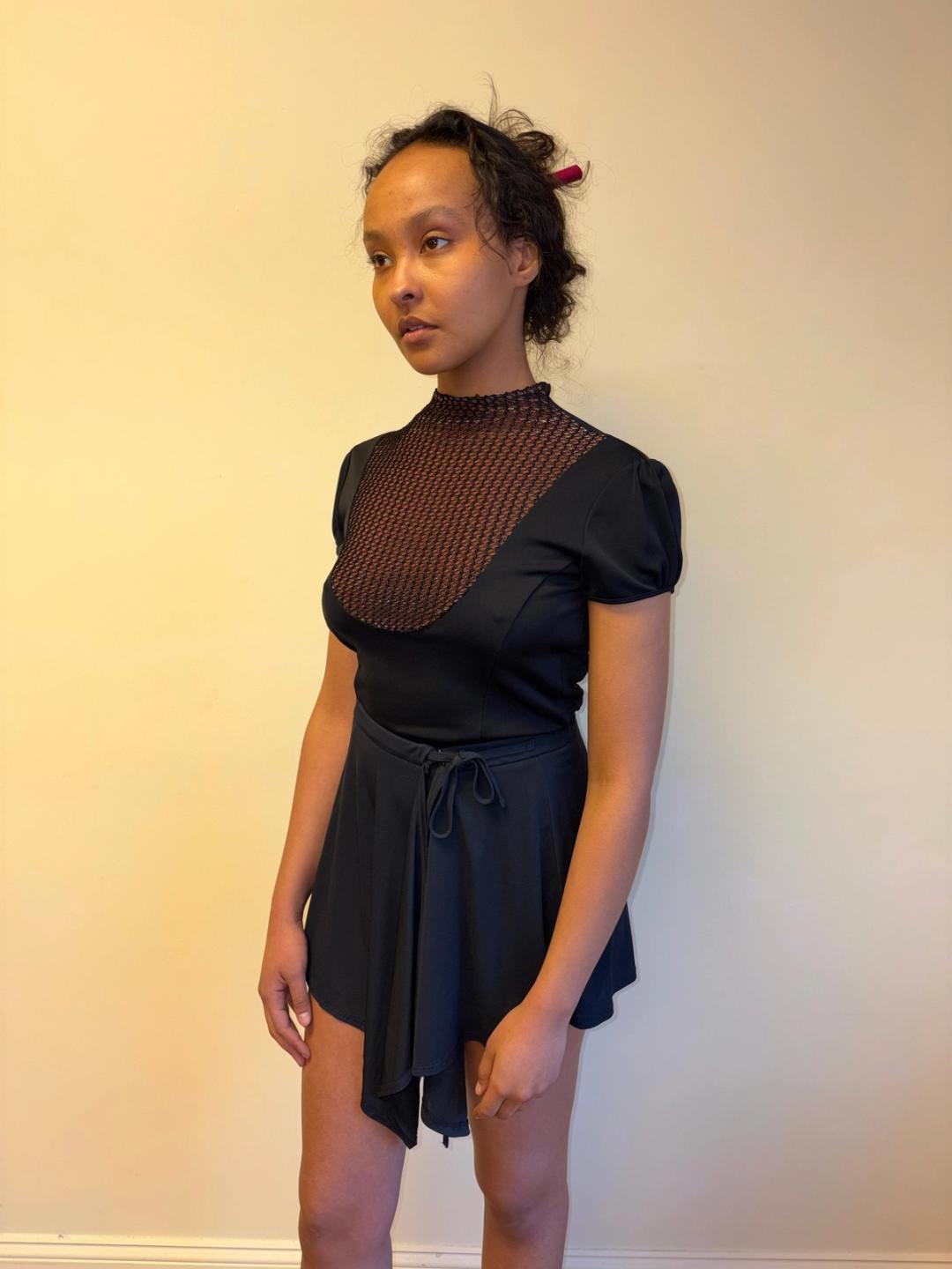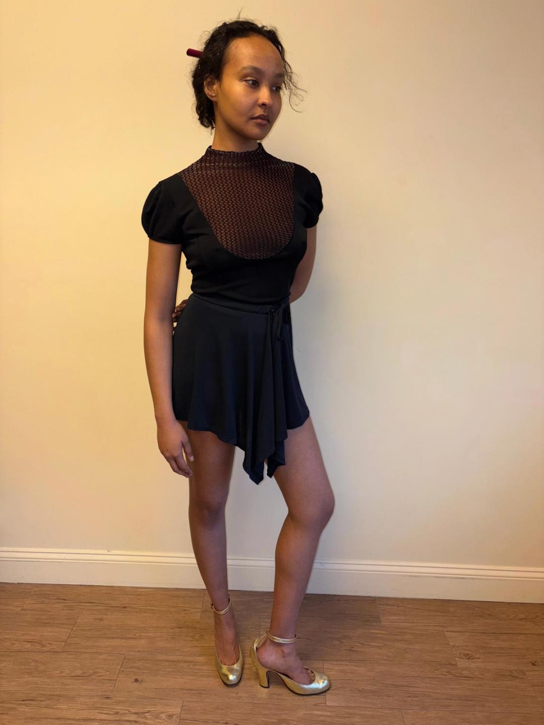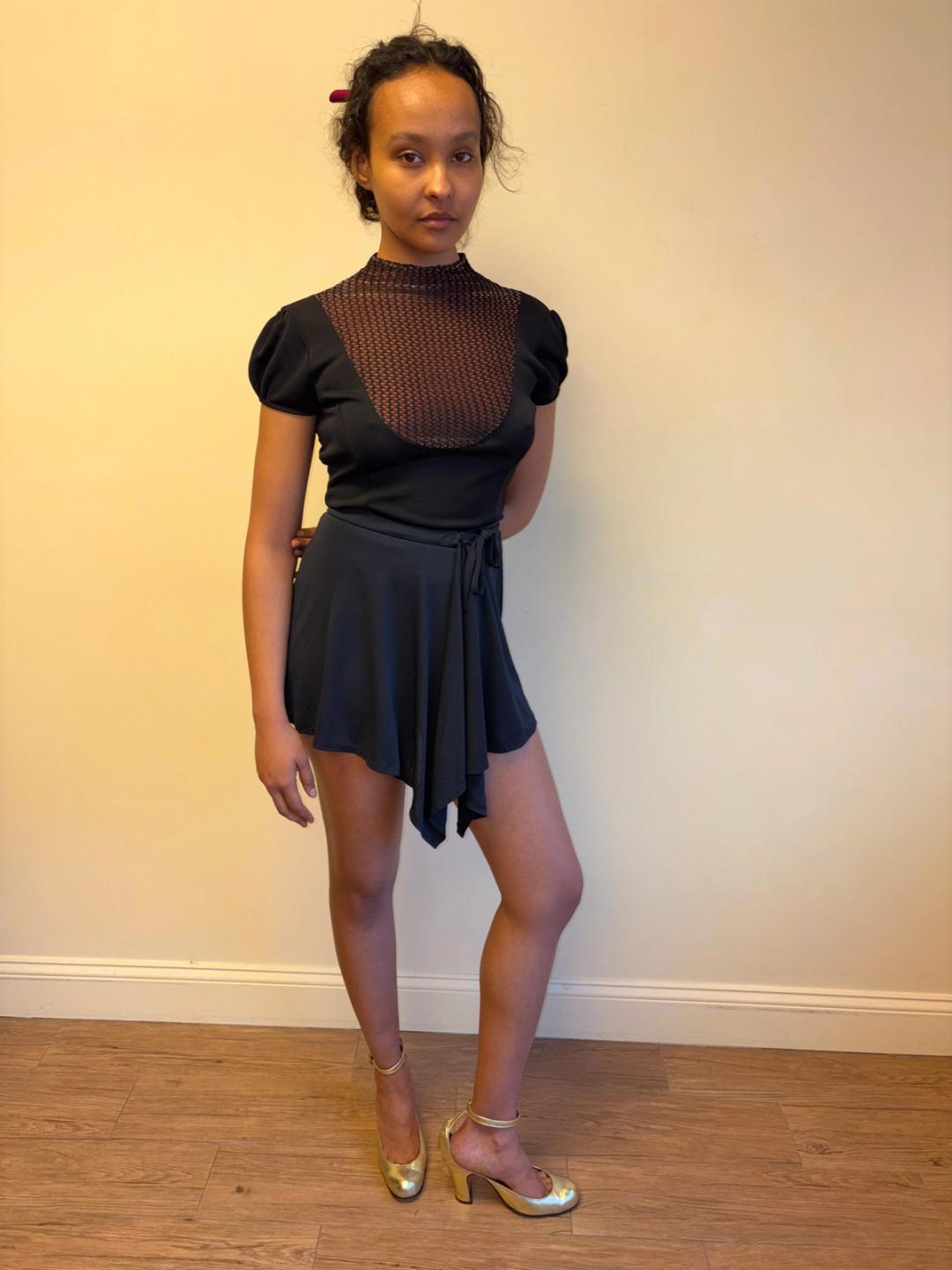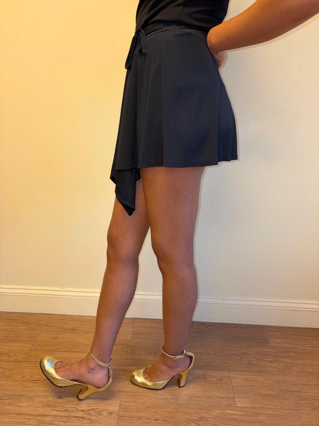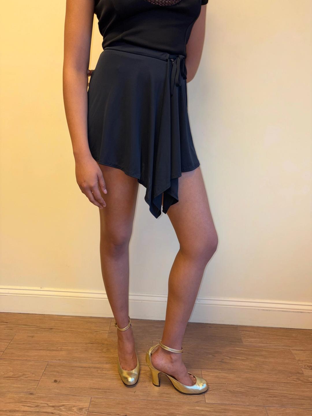 Vintage wrap skater mini skirt by Dorothee Bis. It has an asymmetrical hem and tie on one side.