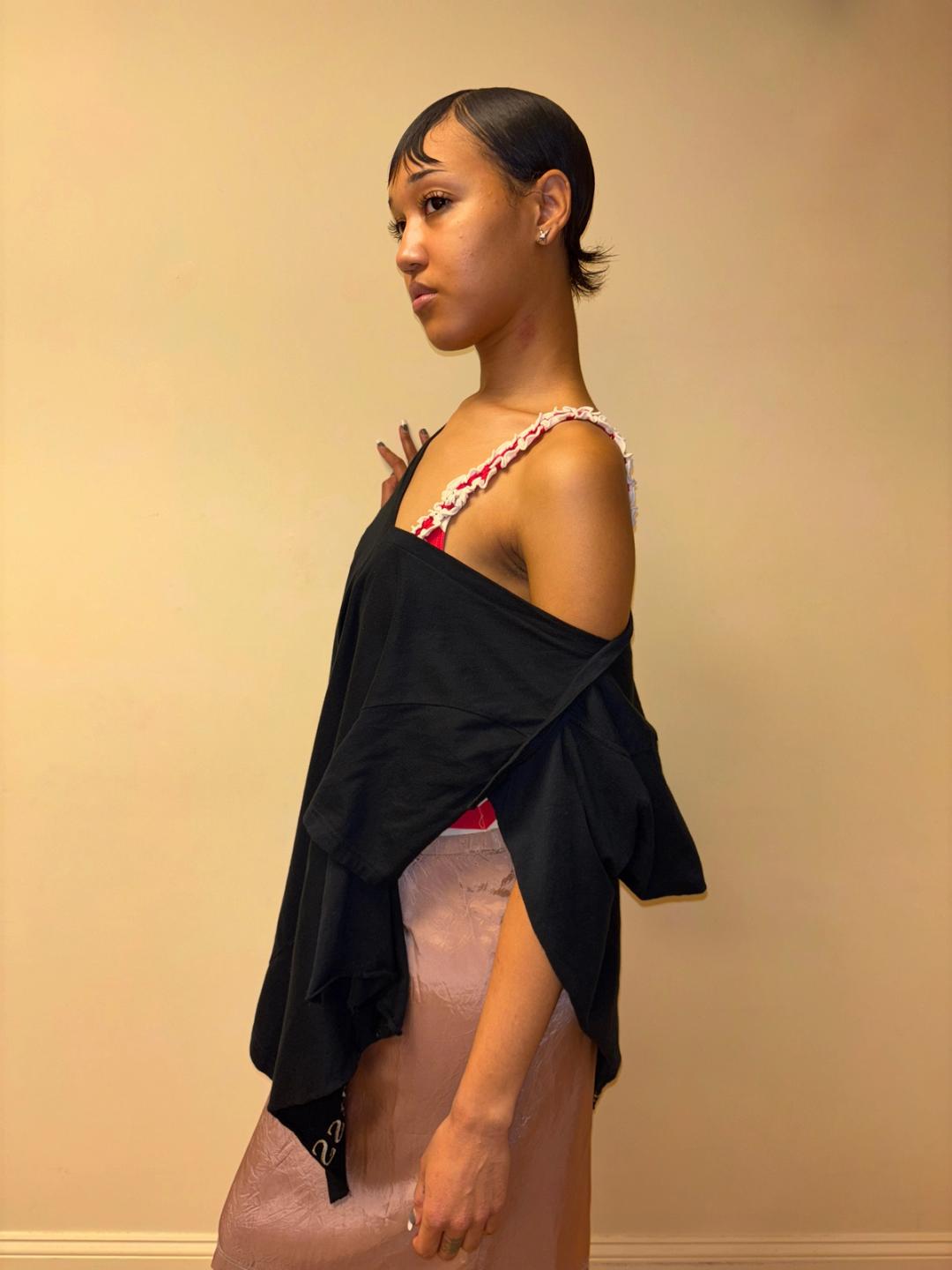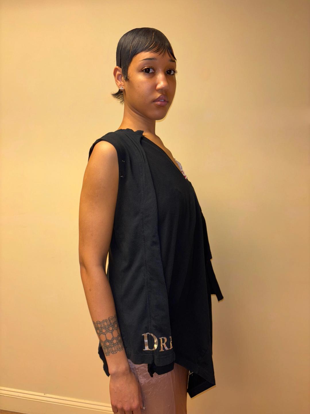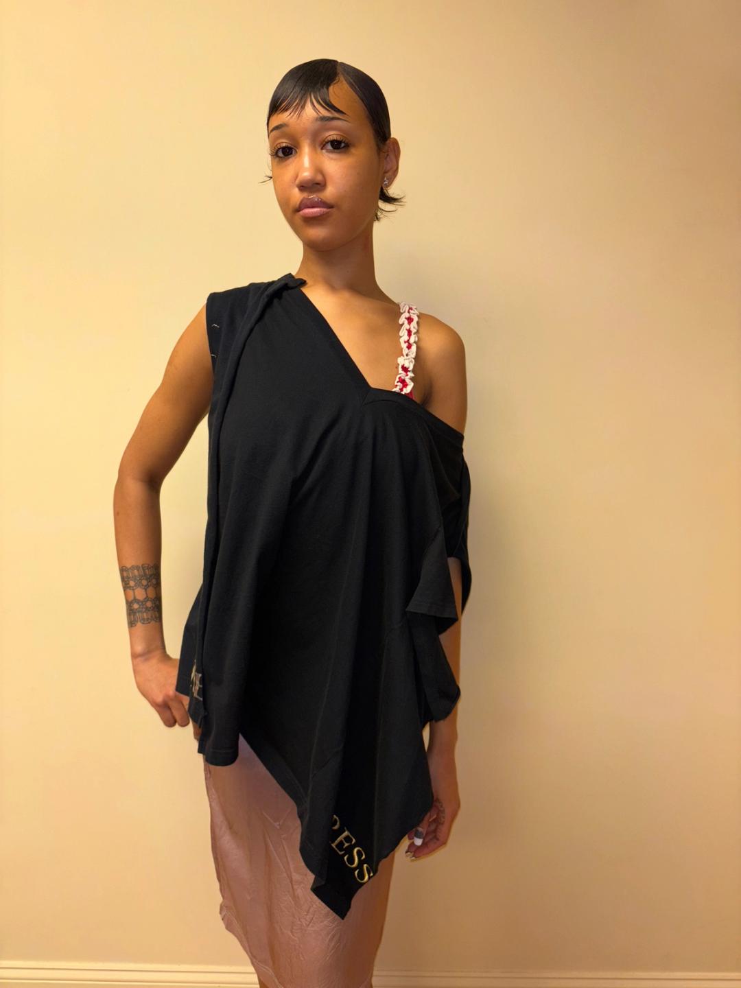 Patchwork tunic by Dress Camp. The top is composed of t-shirts sewn together for an abstract and versatile shape. It can be worn a variety of ways. There is Dress Camp text printed on it. Unisex.