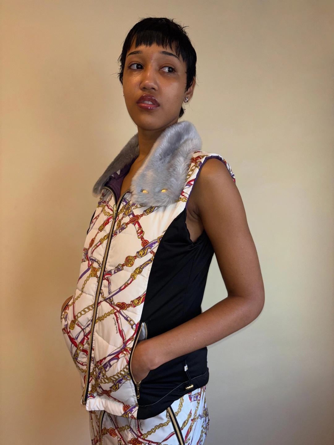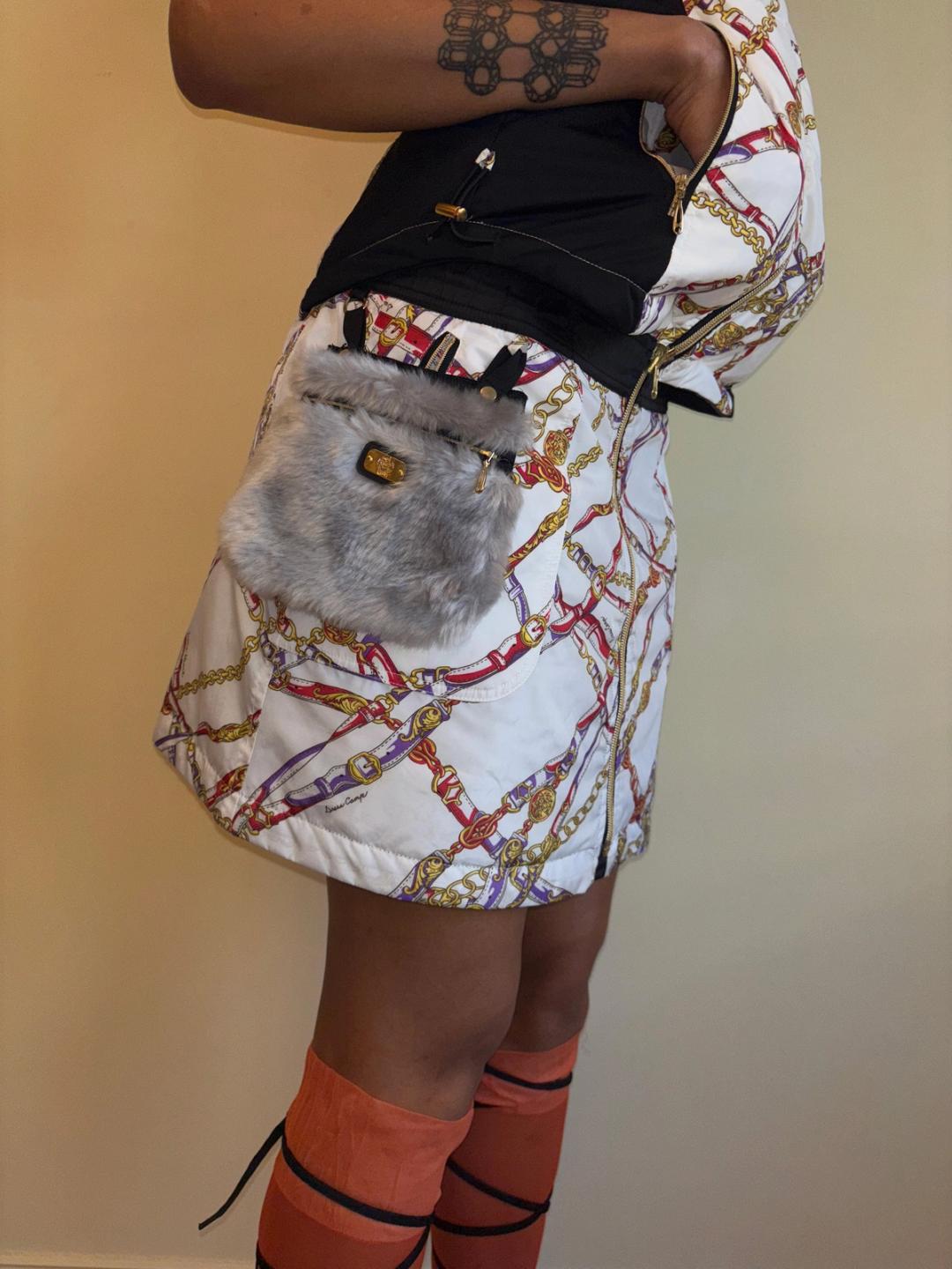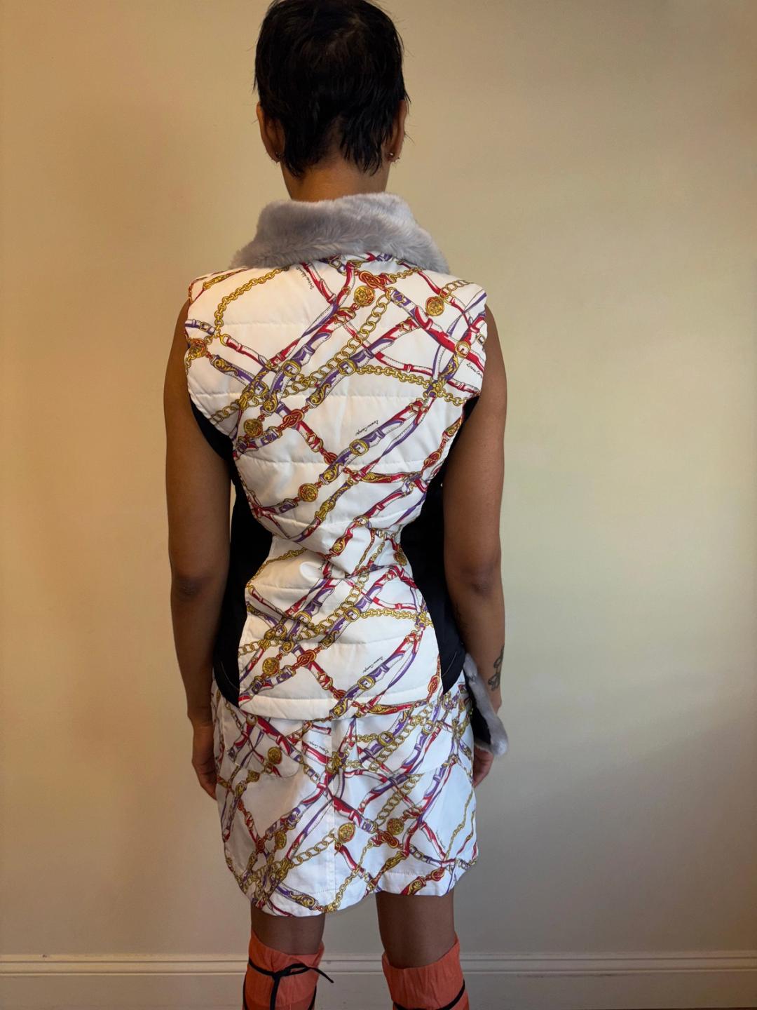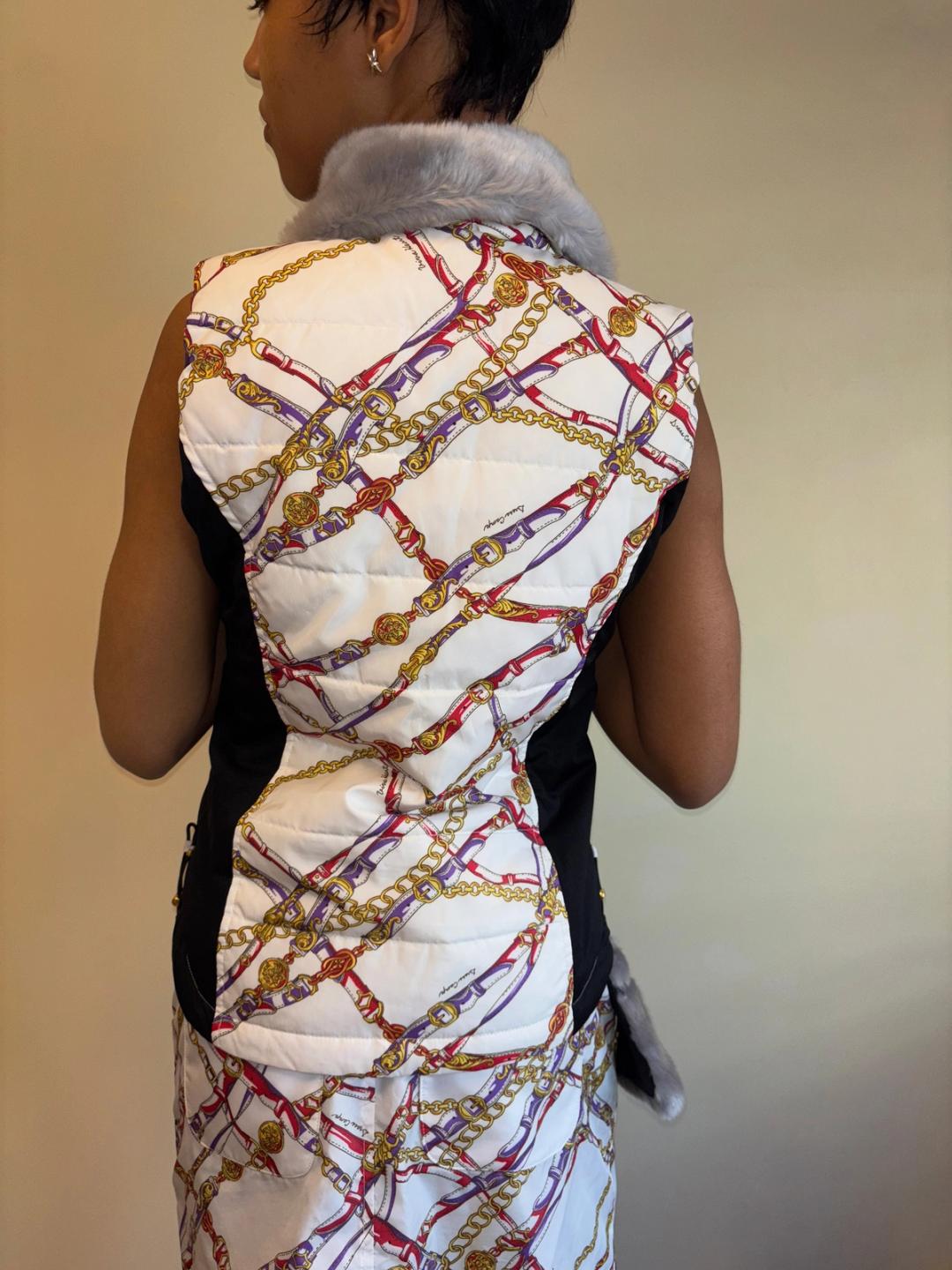 Puffer vest and skirt set by Dress Camp Viva Heart. Both pieces have a vibrant chain print. The vest has a faux fur collar and the skirt has a faux fur pouch.