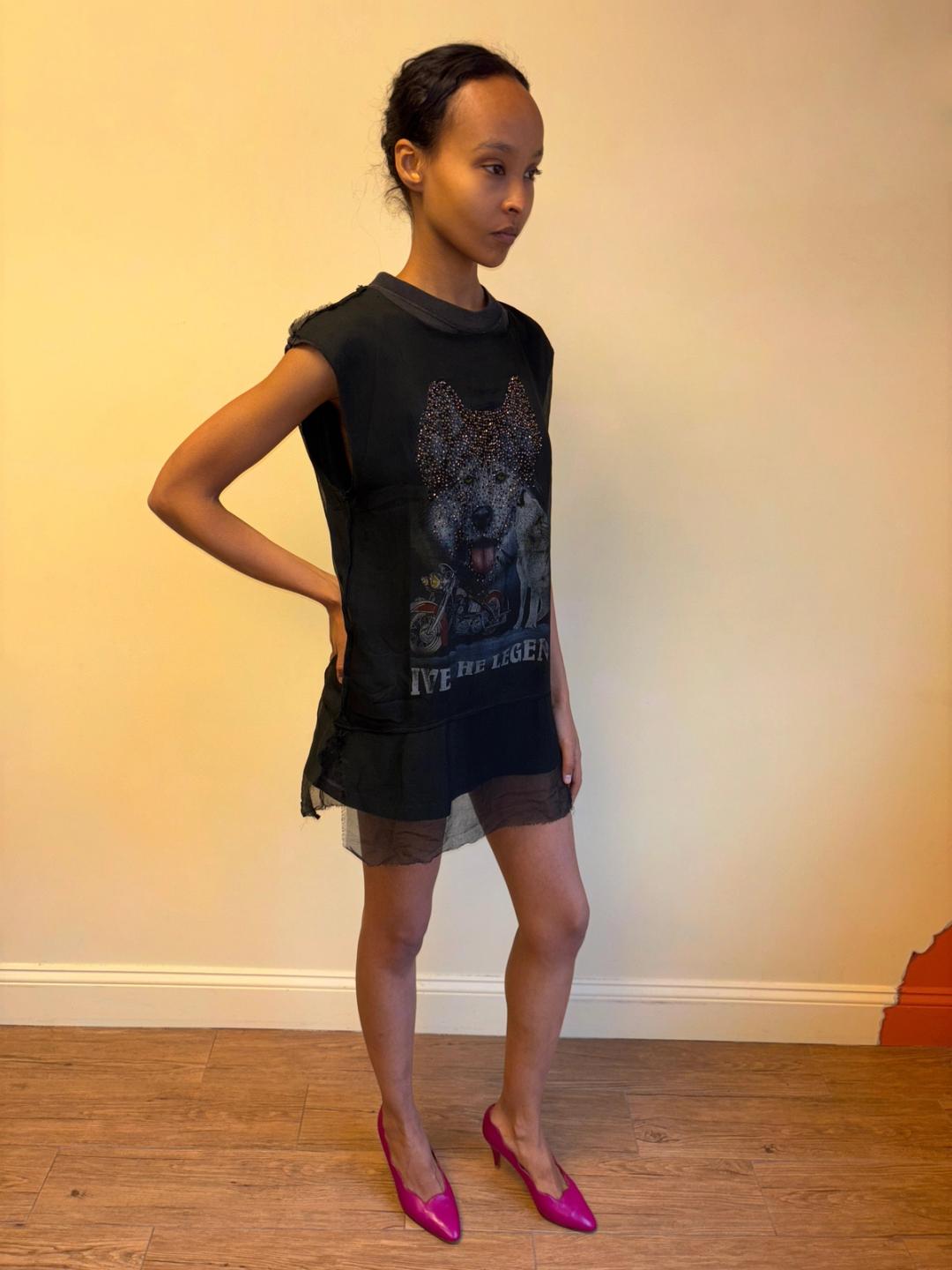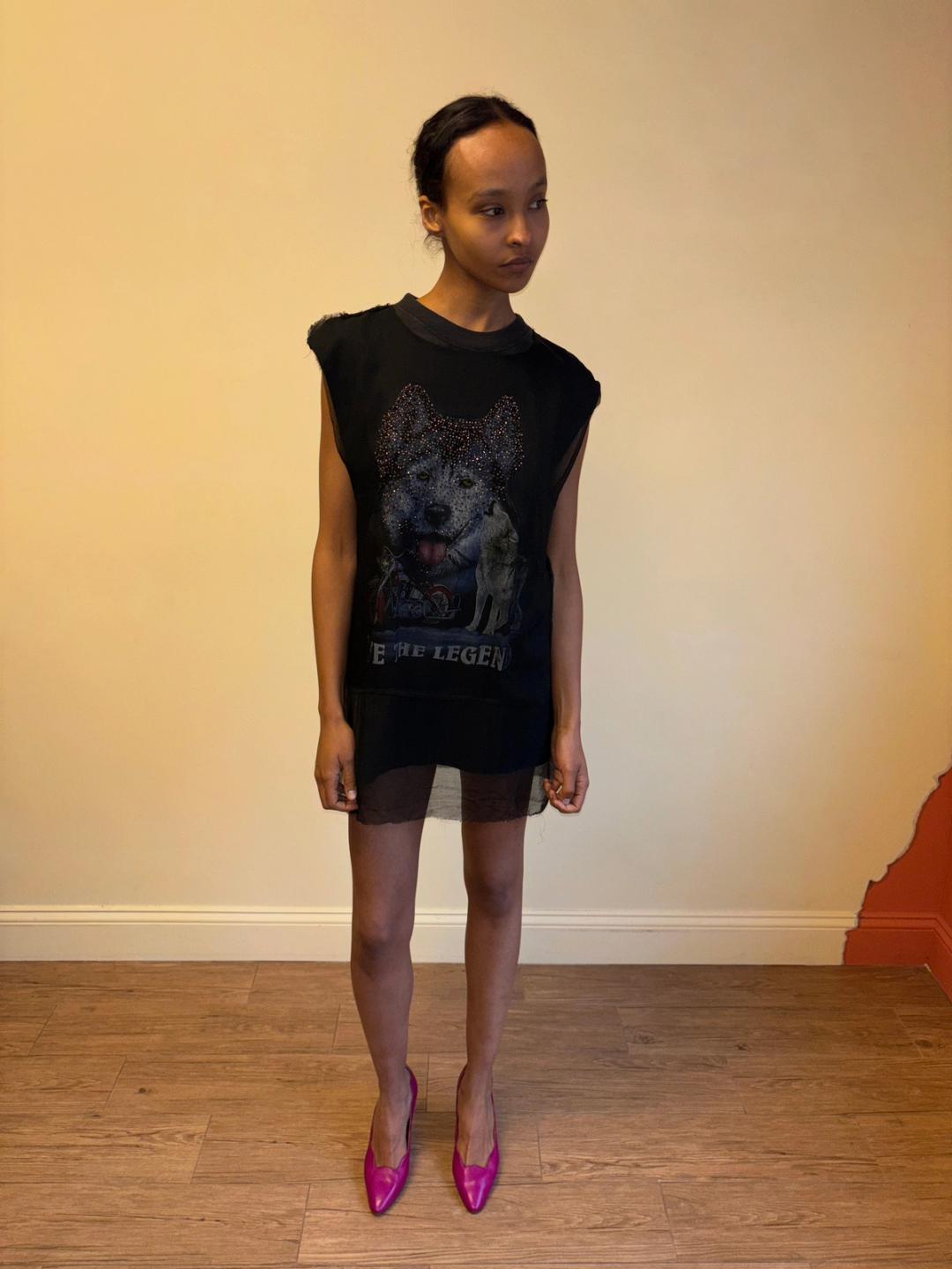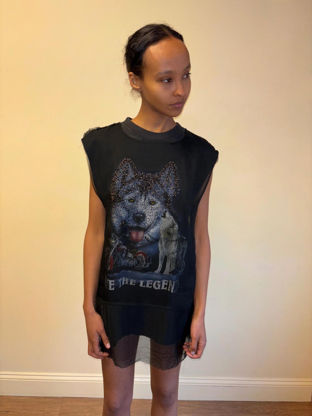 One-of-a-kind patchwork dress by DryCleanOnly. The dress is made of a repurposed wolf t-shirt with an intricate beaded design and a gauzy overlay.