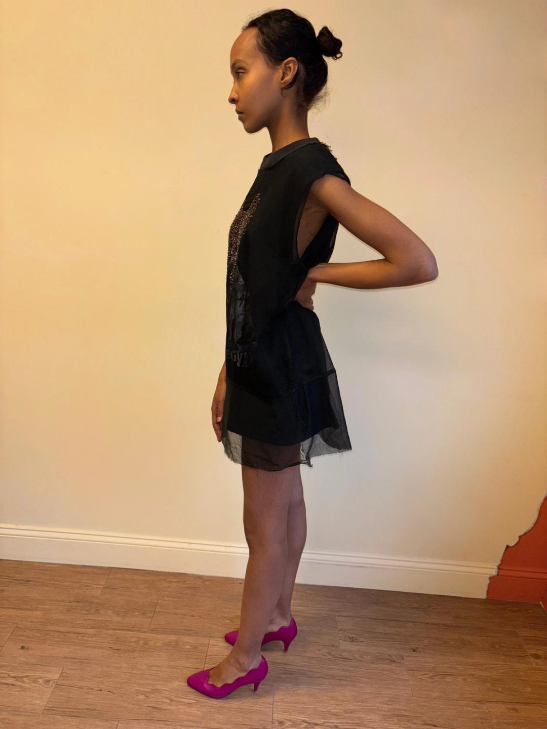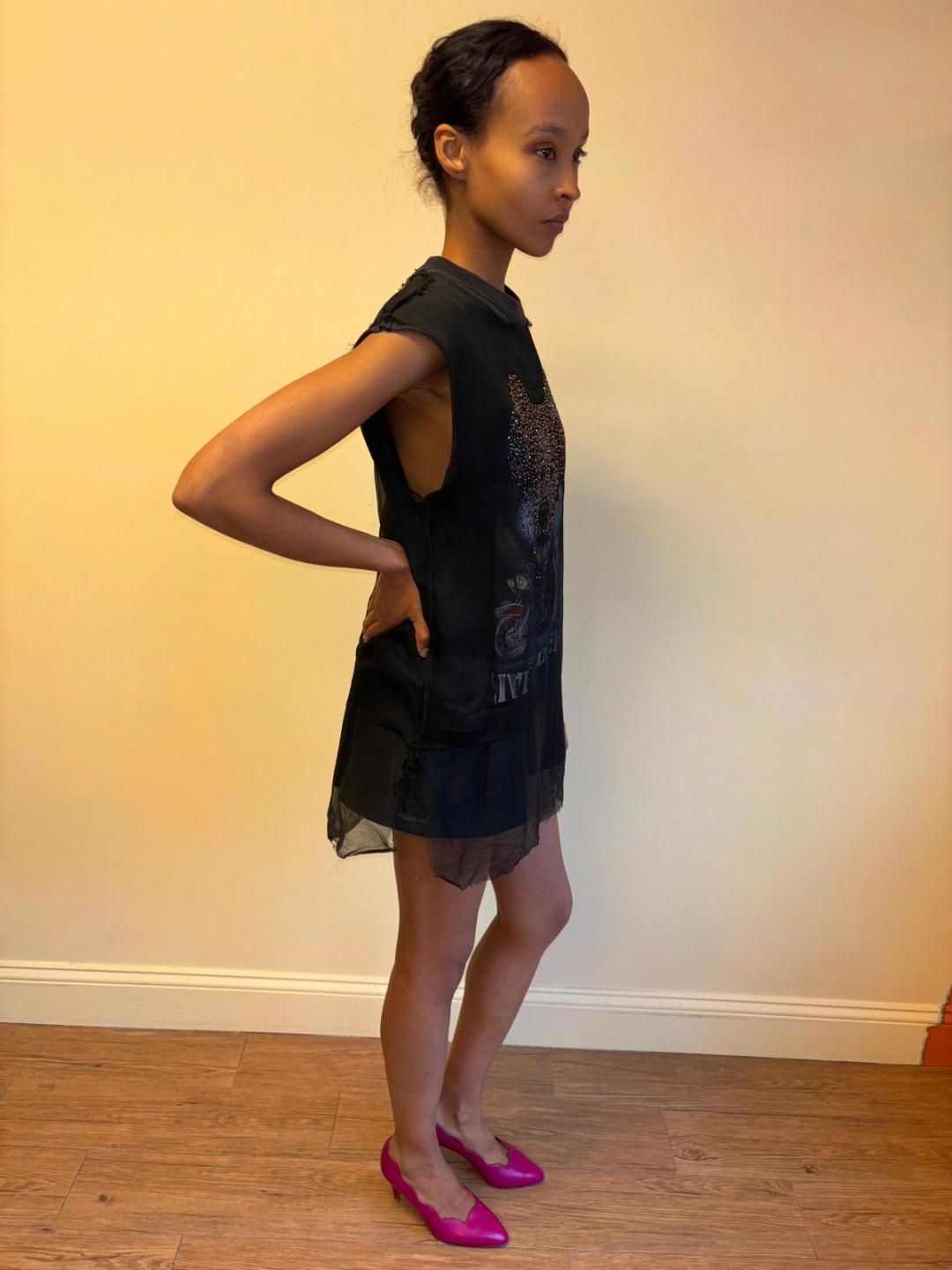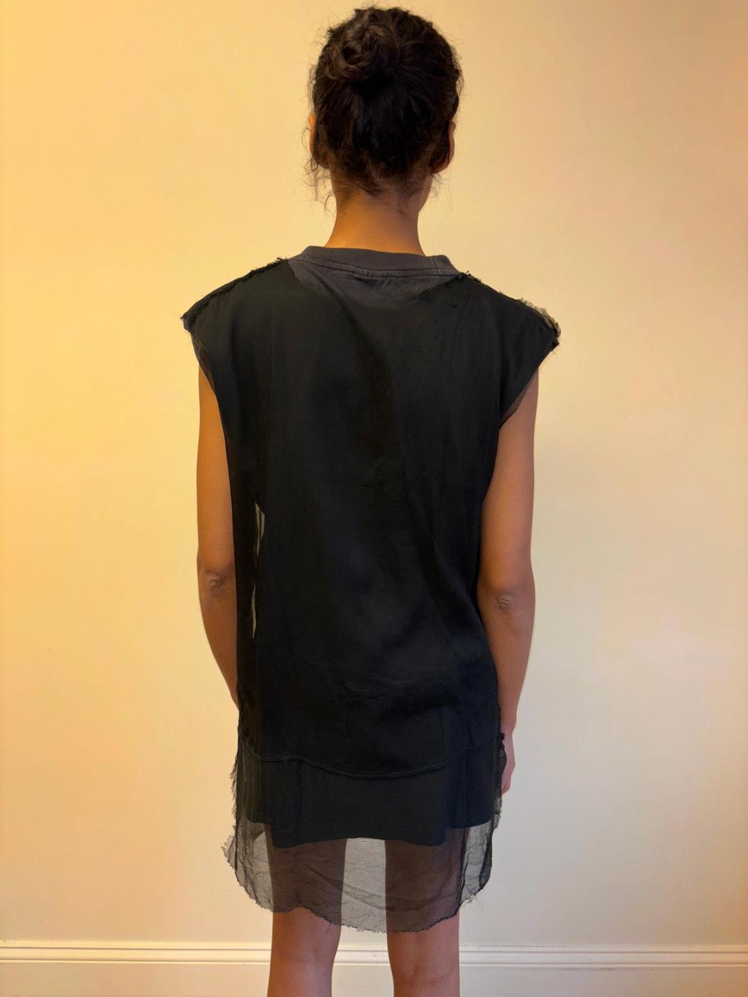 One-of-a-kind patchwork dress by DryCleanOnly. The dress is made of a repurposed wolf t-shirt with an intricate beaded design and a gauzy overlay.