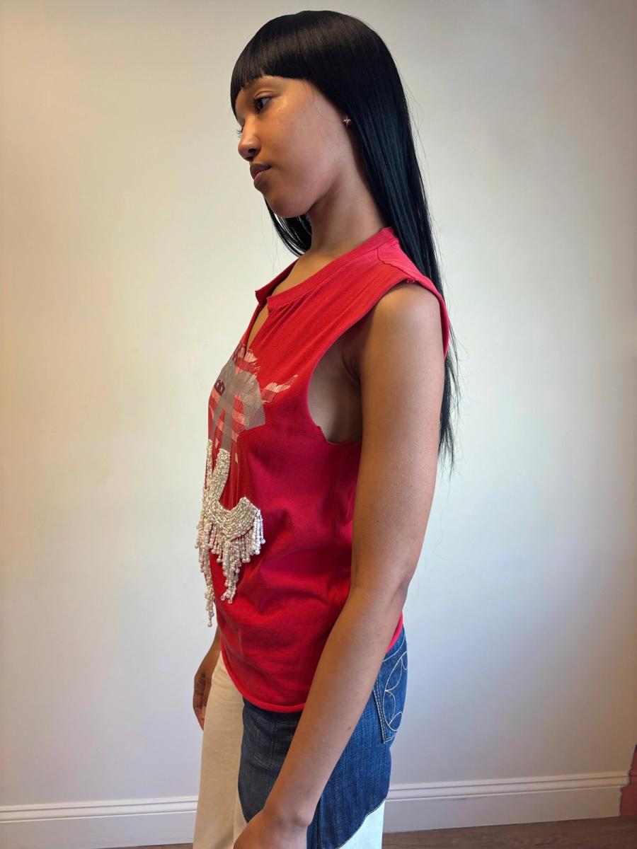 One-of-a-kind DryCleanOnly cut up tank top with beaded appliqué Chanel logo. Unisex.