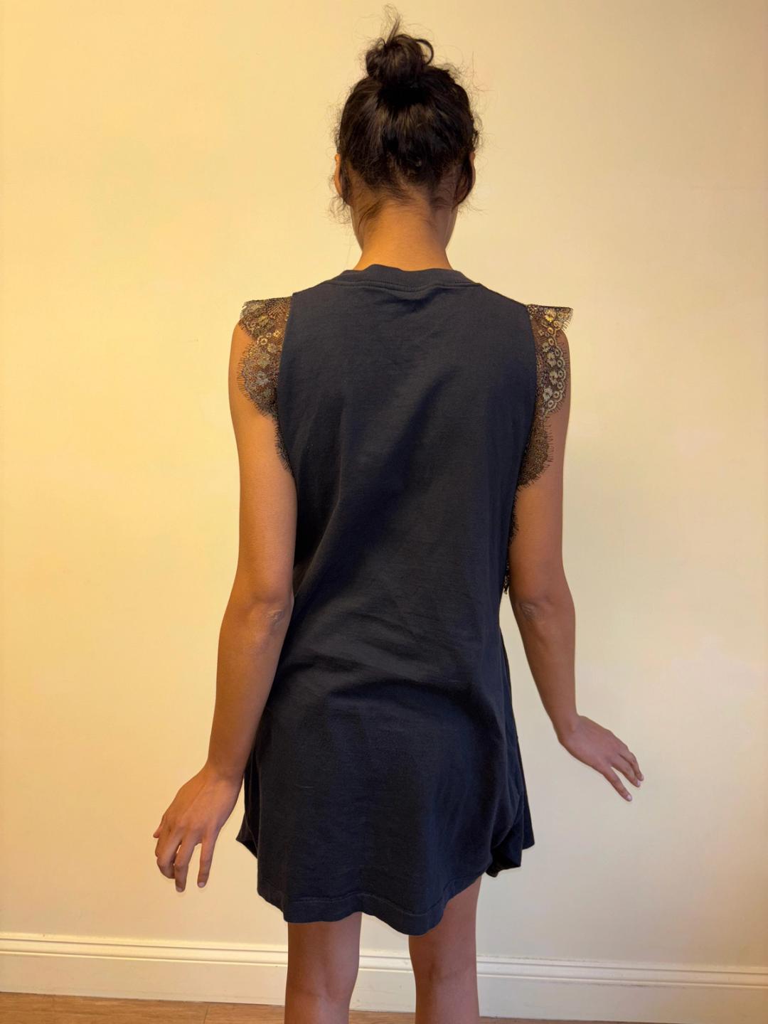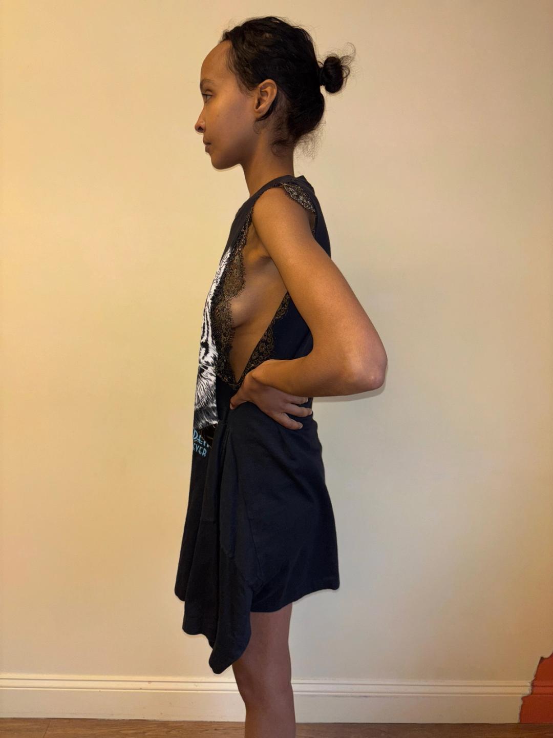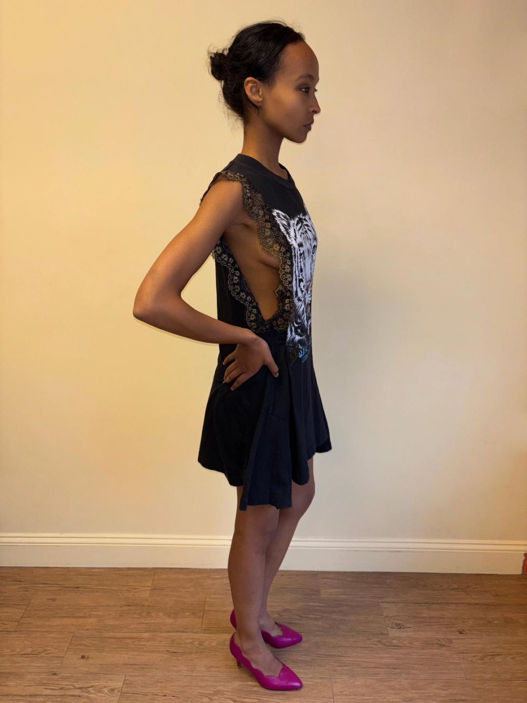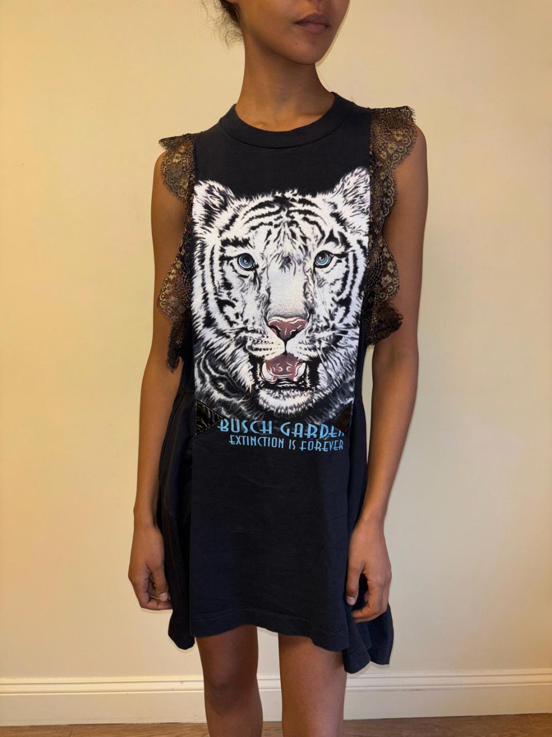 One-of-a-kind patchwork dress by DryCleanOnly. The dress has a lace trim and its made of a repurposed tiger t-shirt that says, "Extinction is Forever."