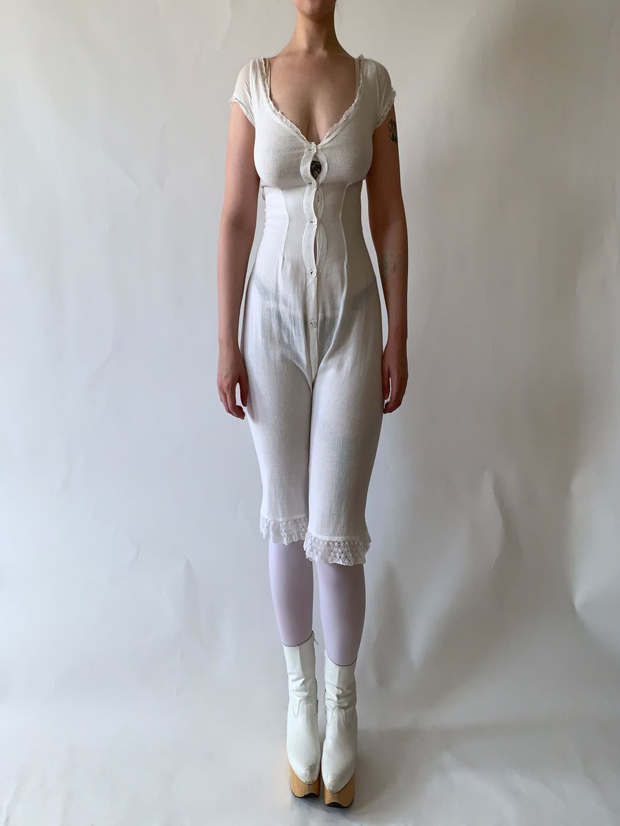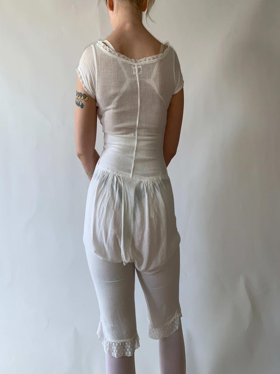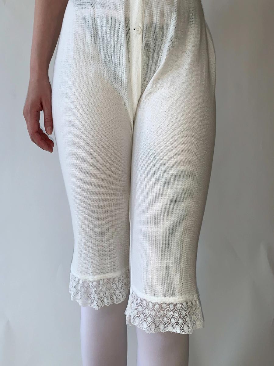 Stunning, very unusual Edwardian combination underwear made by a British label, "Aertex", perhaps a reference to the unique aerated woven fabric they're made from. By the Edwardian period women starting combining the chemise and drawers into combination underwear, called "combinations" in shorthand. This pair of underwear button up the front with beautiful covered buttons and have a split crotch for easy access. They are elegantly patterned with beautiful seaming, gathered fabric at the bum, and crocheted lace trim throughout. These combinations are in excellent flawless condition, and are completely wearable and sturdy.