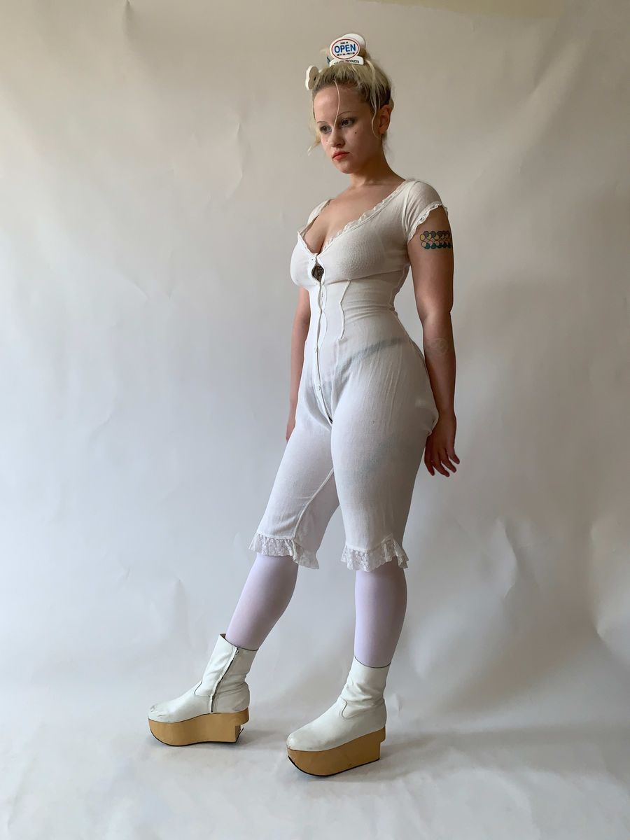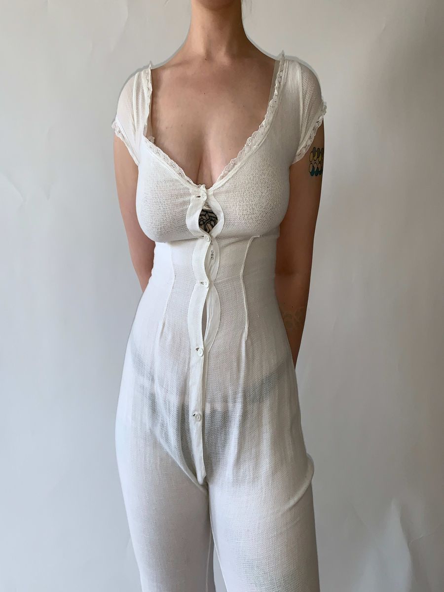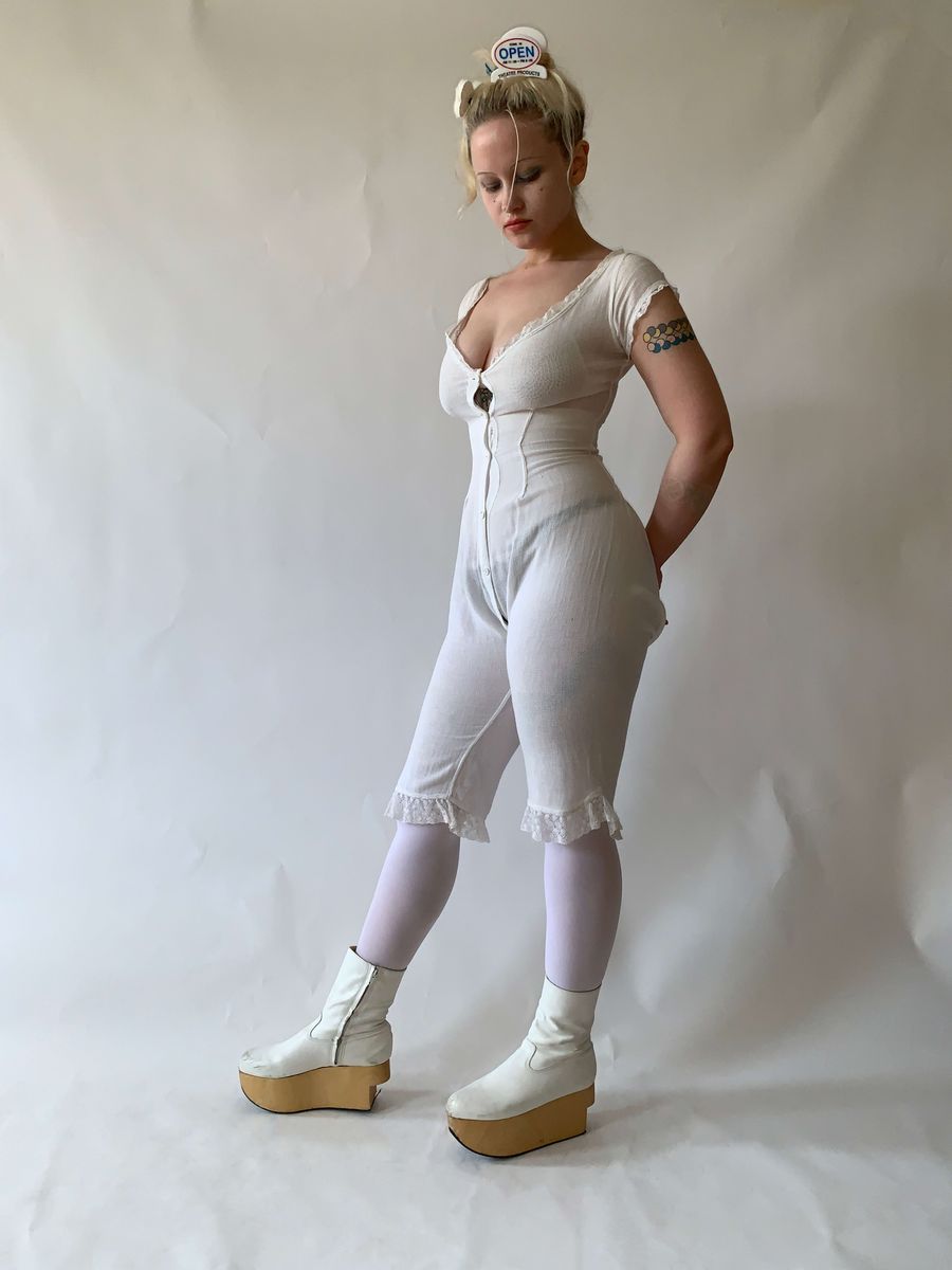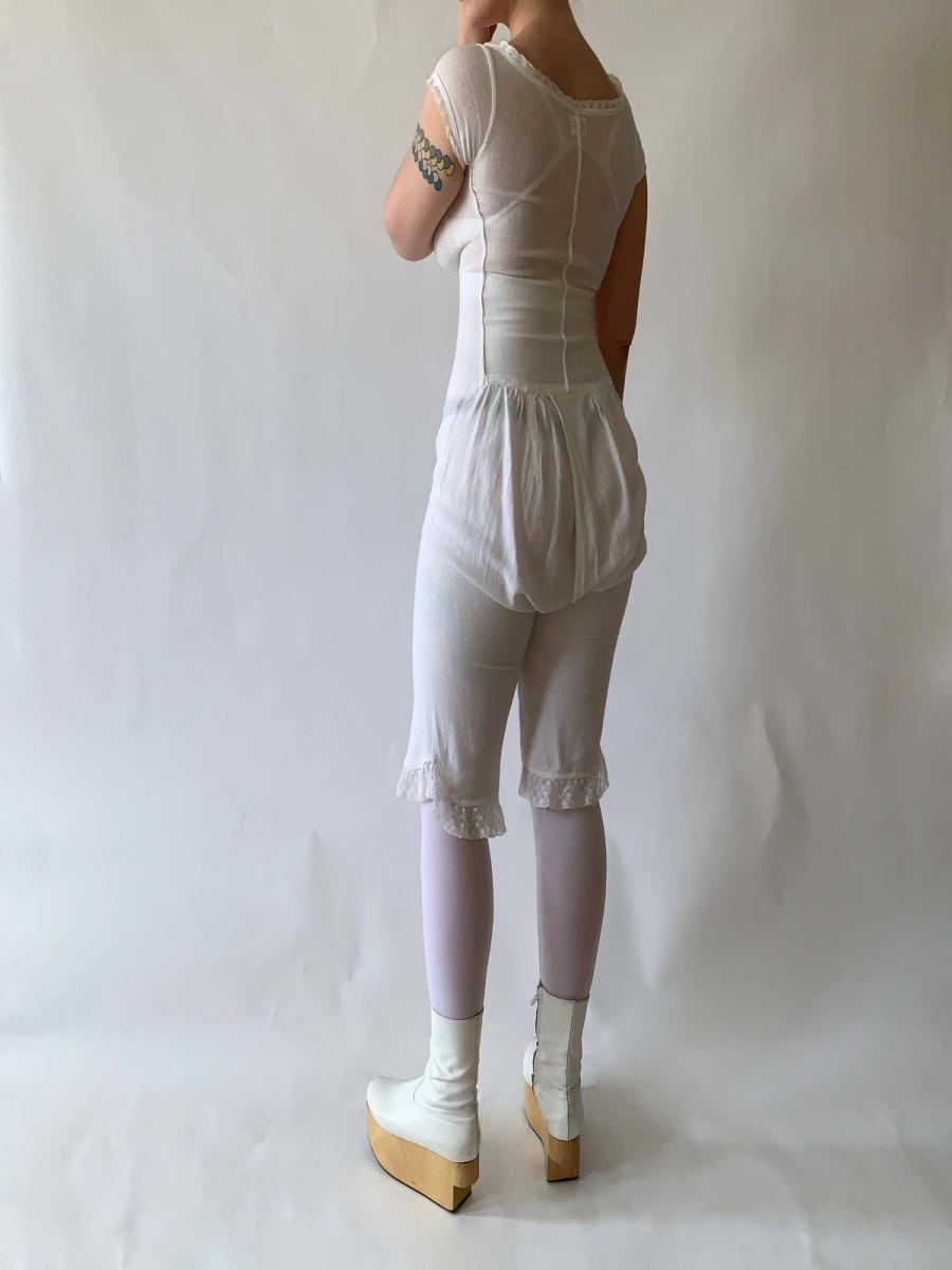 Stunning, very unusual Edwardian combination underwear made by a British label, "Aertex", perhaps a reference to the unique aerated woven fabric they're made from. By the Edwardian period women starting combining the chemise and drawers into combination underwear, called "combinations" in shorthand. This pair of underwear button up the front with beautiful covered buttons and have a split crotch for easy access. They are elegantly patterned with beautiful seaming, gathered fabric at the bum, and crocheted lace trim throughout. These combinations are in excellent flawless condition, and are completely wearable and sturdy.