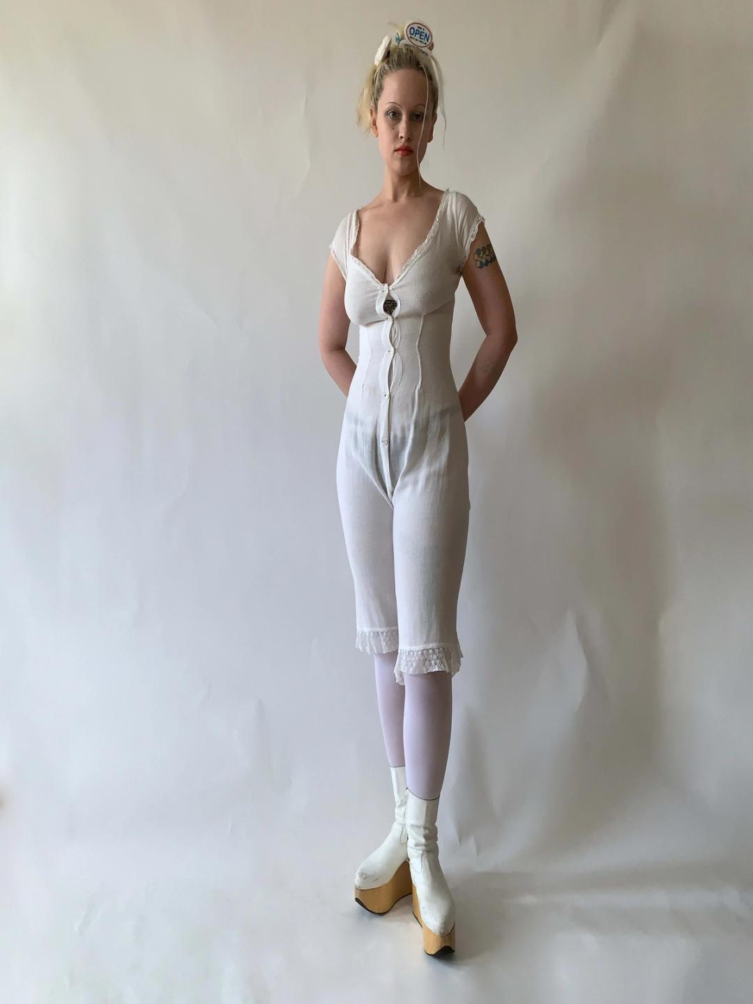 Stunning, very unusual Edwardian combination underwear made by a British label, "Aertex", perhaps a reference to the unique aerated woven fabric they're made from. By the Edwardian period women starting combining the chemise and drawers into combination underwear, called "combinations" in shorthand. This pair of underwear button up the front with beautiful covered buttons and have a split crotch for easy access. They are elegantly patterned with beautiful seaming, gathered fabric at the bum, and crocheted lace trim throughout. These combinations are in excellent flawless condition, and are completely wearable and sturdy.