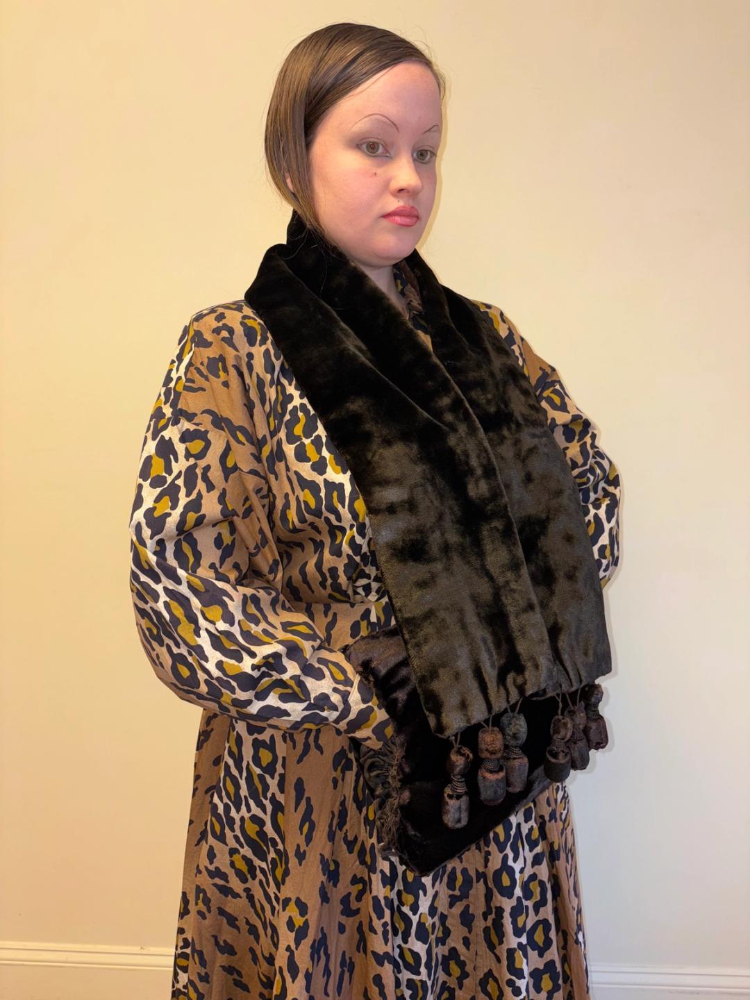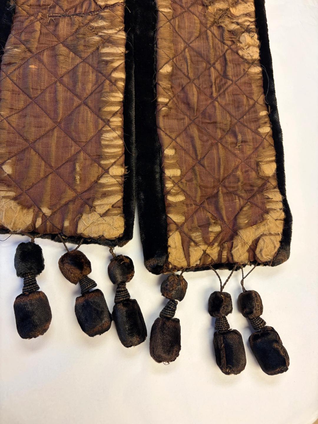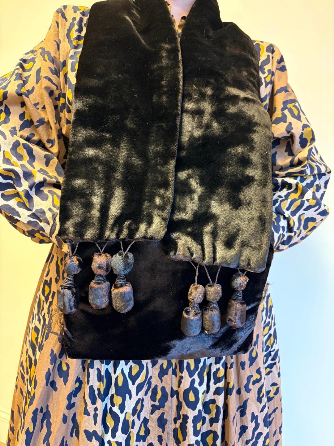 Edwardian velveteen scarf and muff set. The scarf has dangling dimensional fringe. Some signs of wear on the lining -- but in sturdy wearable condition. One size.