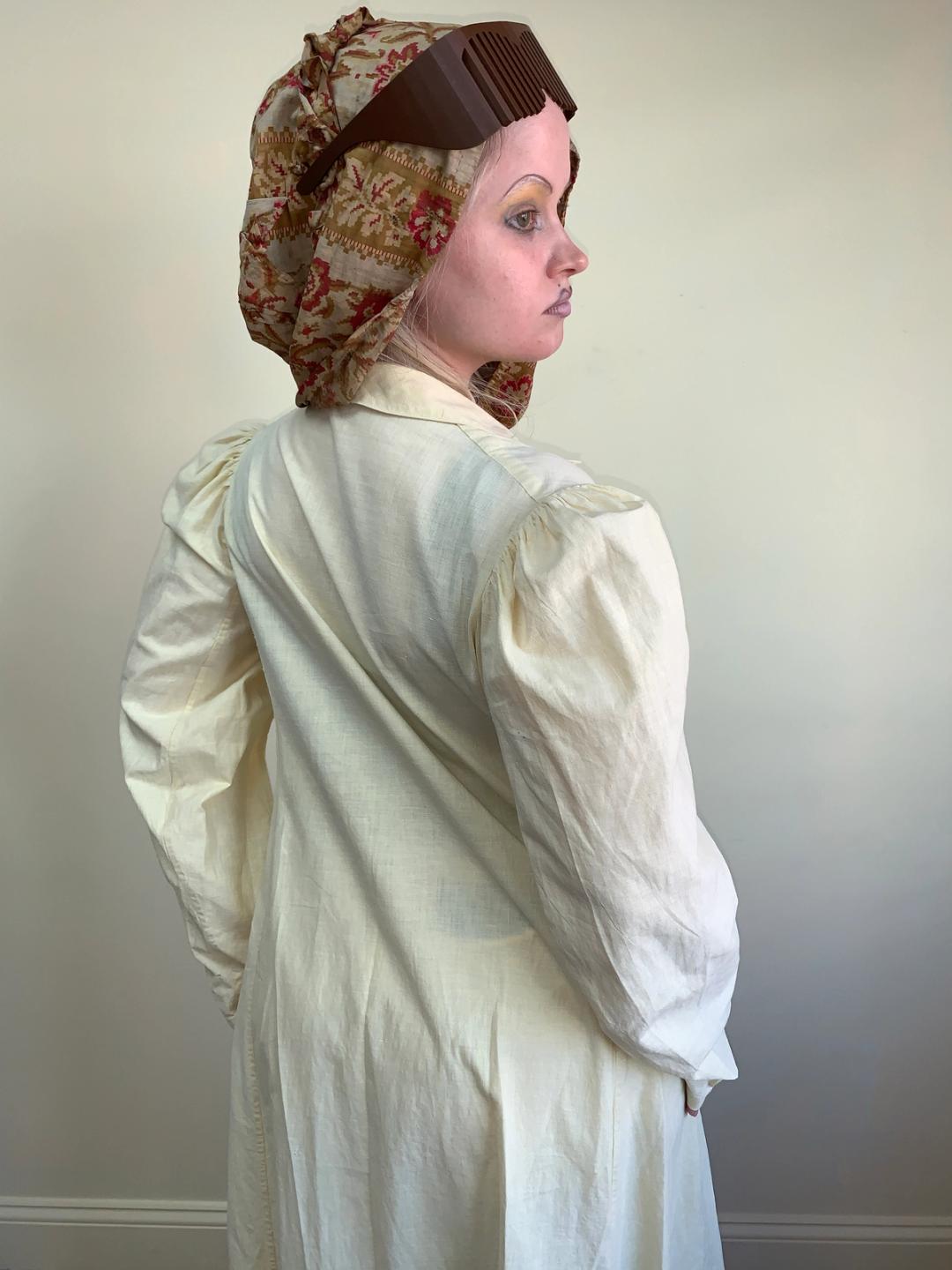 A motoring duster from the 1910s in a lovely pale yellow. Made of a lightweight linen fabric with early plastic buttons down the front. It has a beautiful sweeping cut and relaxed slightly puffed sleeves. It It has two roomy utilitarian pockets as well as a hidden interior breast pocket.