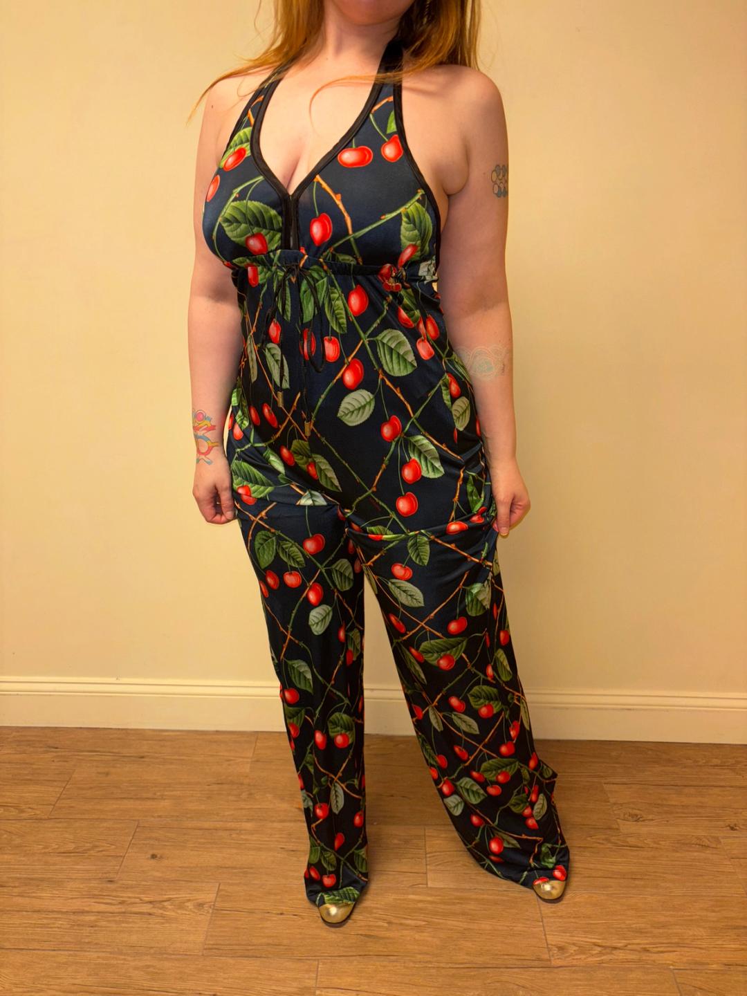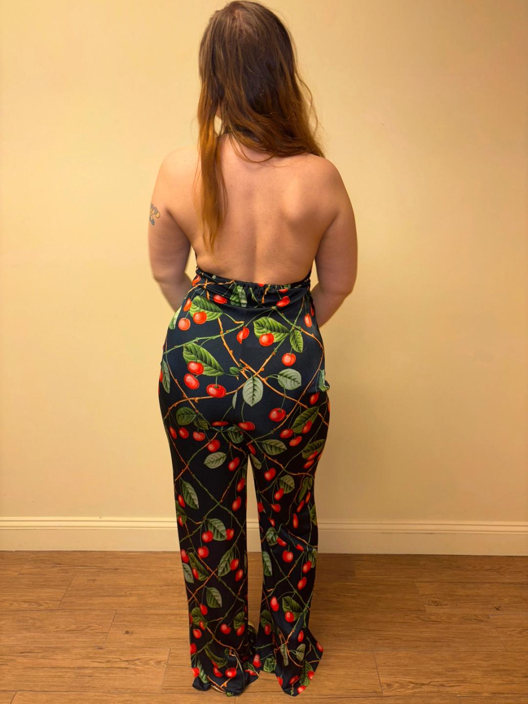 2003 John Galliano slinky cherry print jumpsuit, inspired by 1930s loungewear. The same print appears on his FW 2003 runway. It can be cinched under the bust. In excellent condition.