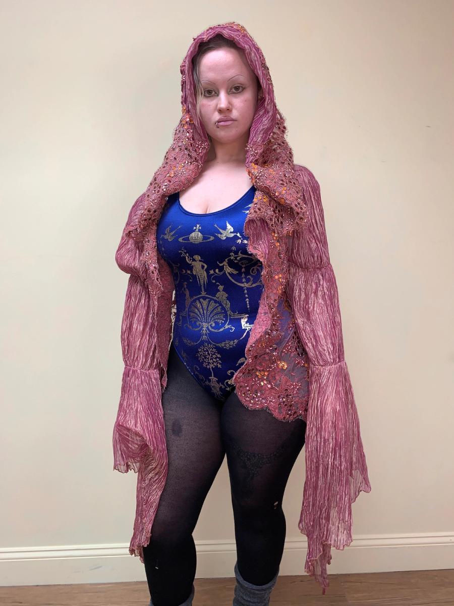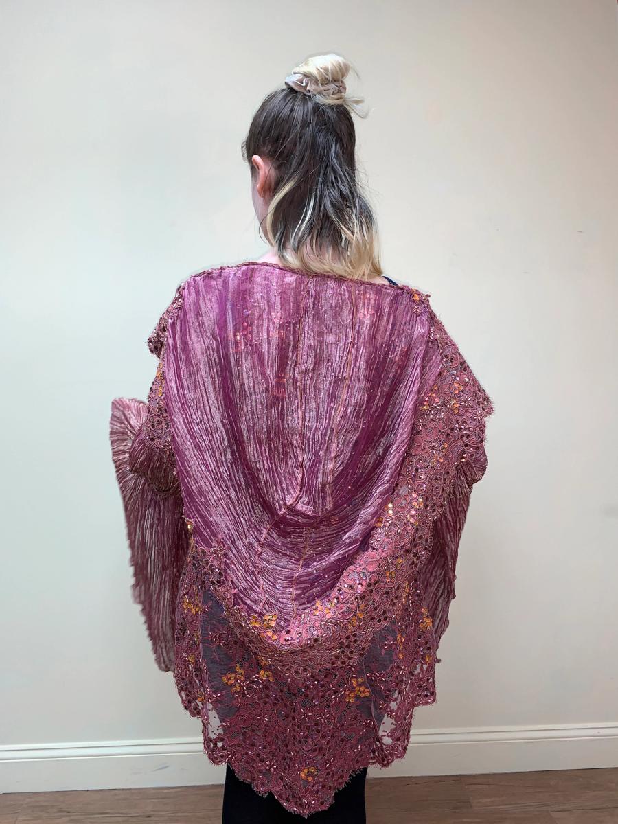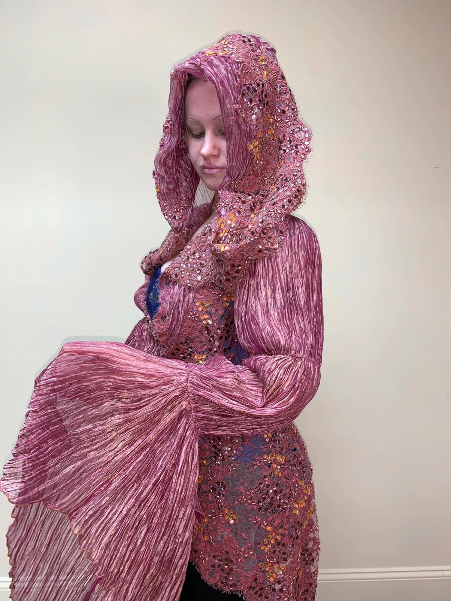 Jean Paul Gaultier Homme, lace jacket with dramatic sleeves made of pleated organza lamé, as well as the giant draped hood. The body is made entirely of pink alençon lace on tulle with sequins and beading. There is a small hole on the back of the jacket, but it is otherwise in excellent condition.