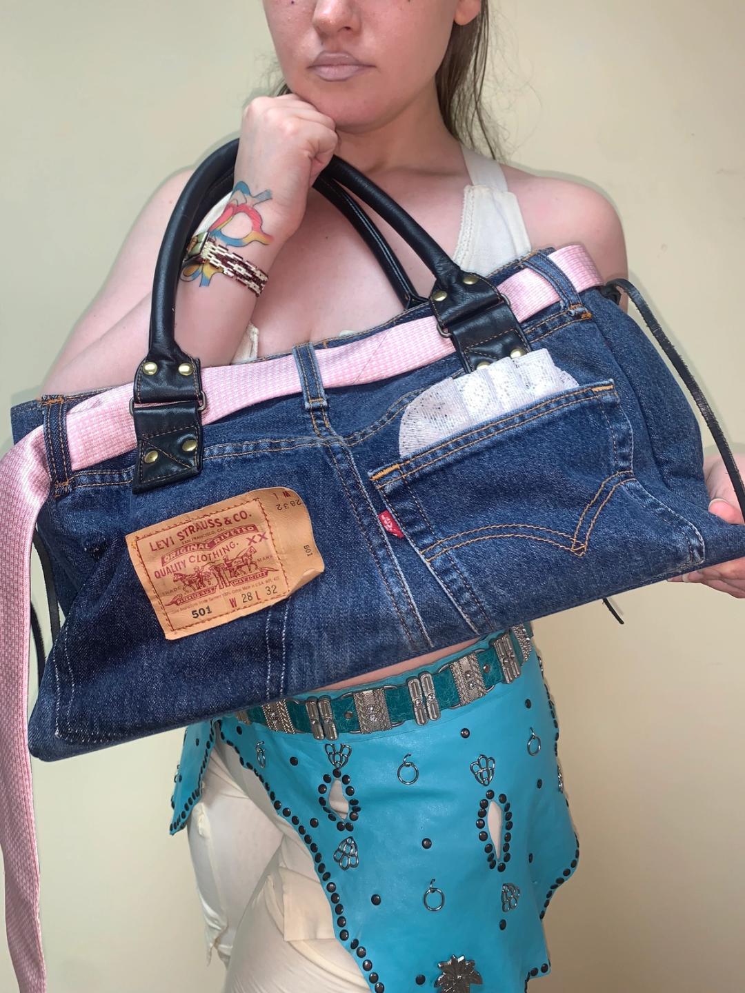 One-of-a-kind Glamorous Jane patchwork bag that mimics a pair of jeans -- both front and back! It has an attached tie embellishment as well.