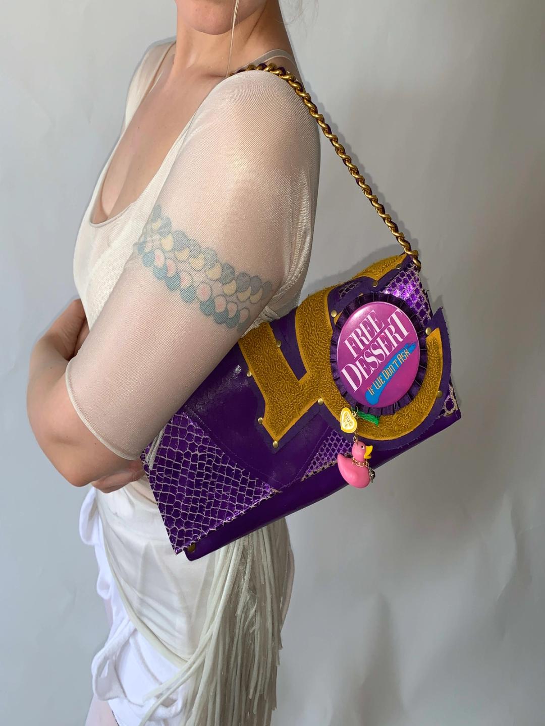 Handmade one-of-a-kind purse by Japanese label, Guri Guri. Guri Guri makes handbags out of repurposed materials giving the bags a DIY look. This particular bag is made of purple leather and is covered with vintage patches. It has a large "Free Dessert" pin on it and dangling charms!
