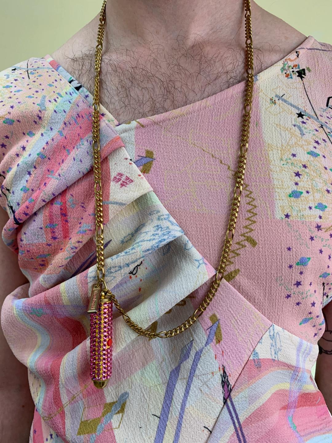 Hot pink crystal encrusted laser pointer necklace by Russian jewelry designer Irina Volkonskii who designed for Castelbajac.