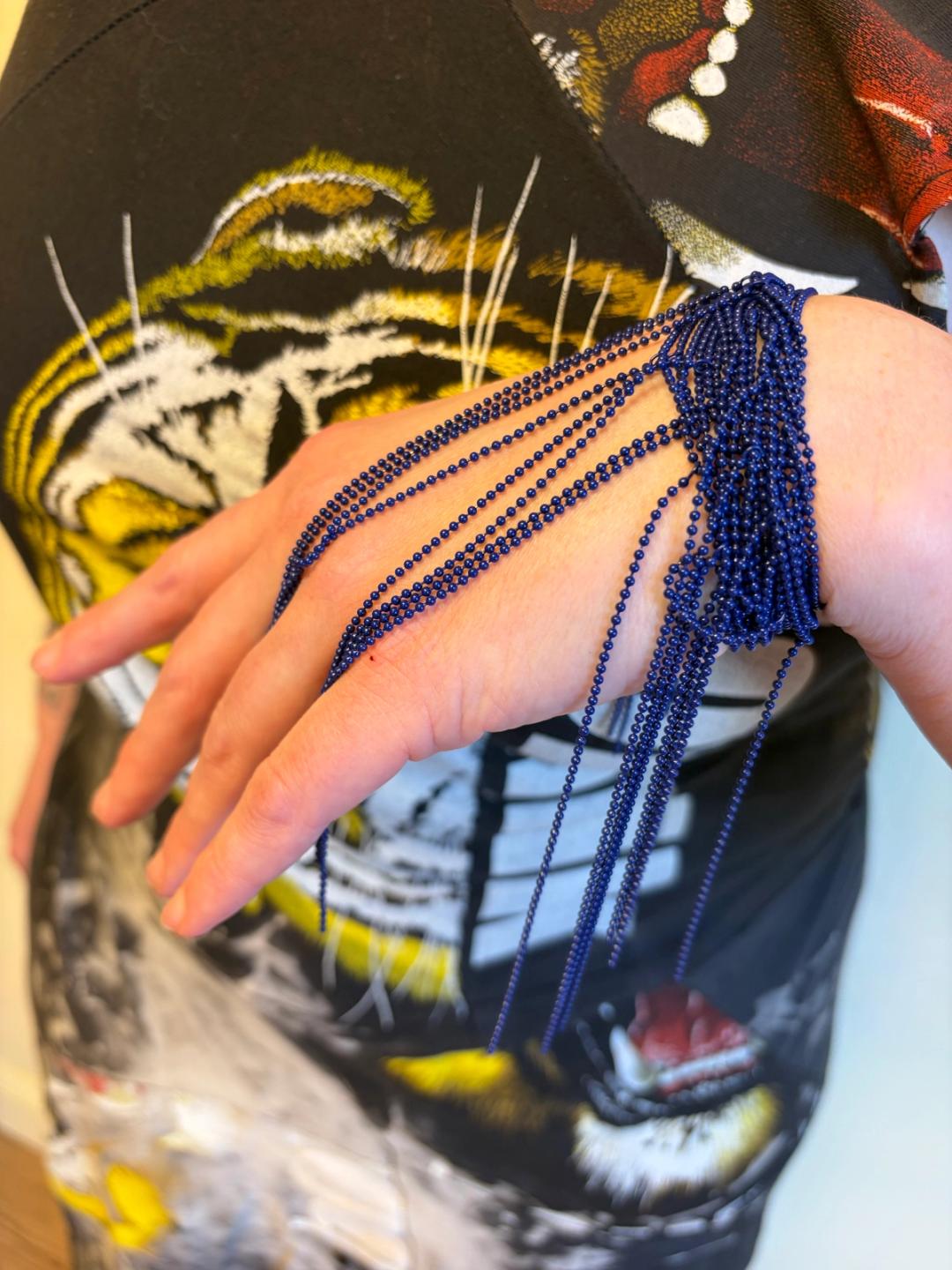 Beautiful tangled ball chain bracelet by Issey Miyake with elegant hanging chain tendrils.