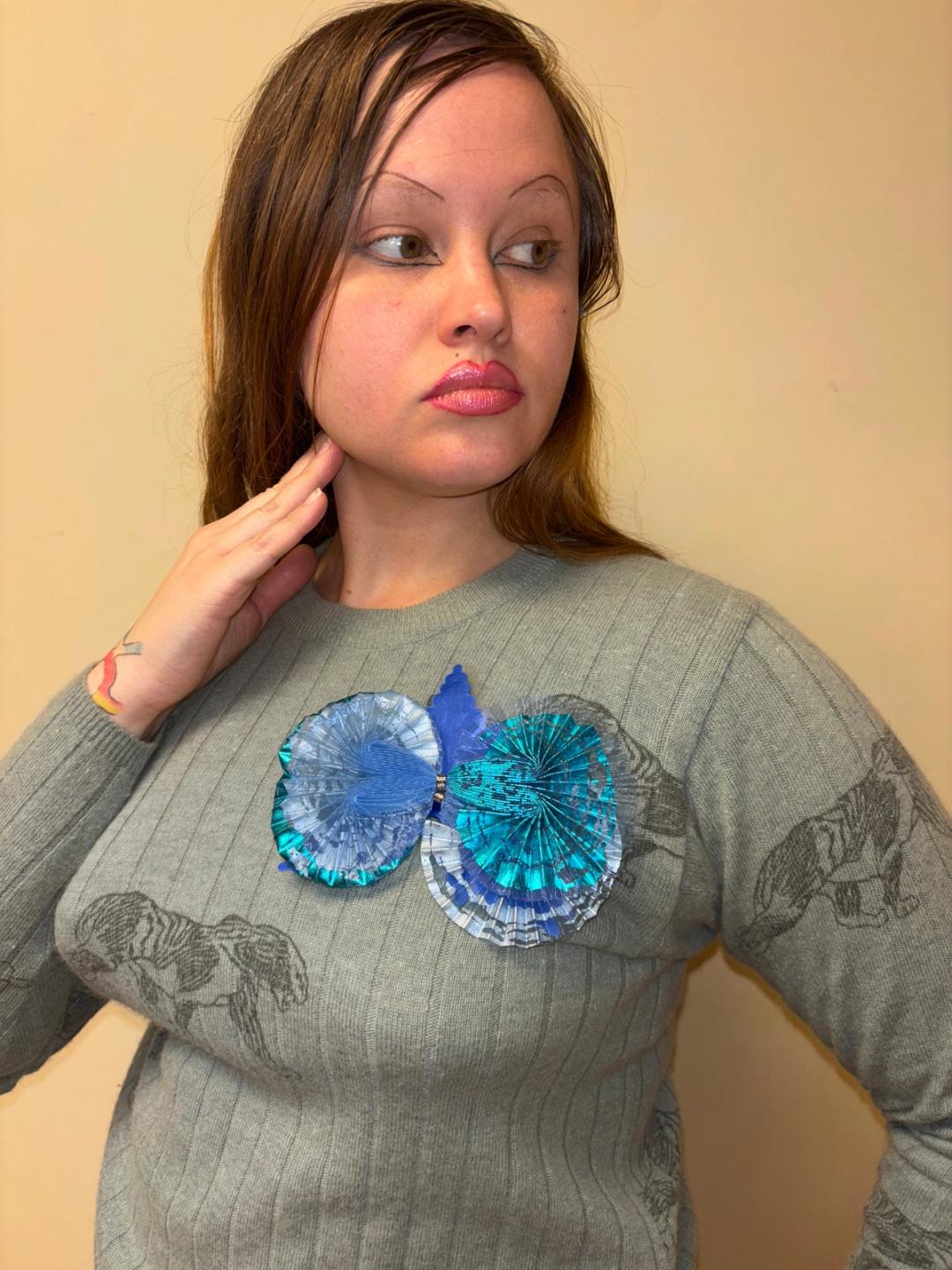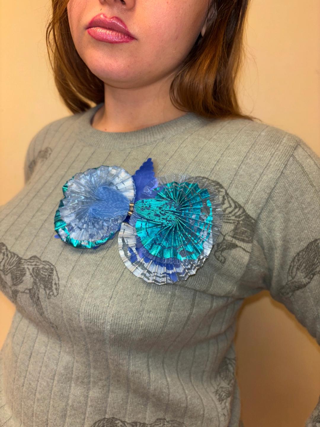 Unusual Issey Miyake Fête pleated brooch. The brooch is made of an iridescent and printed blue fabric with a die cut plastic leaf.