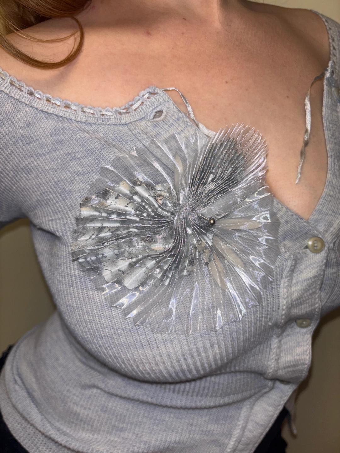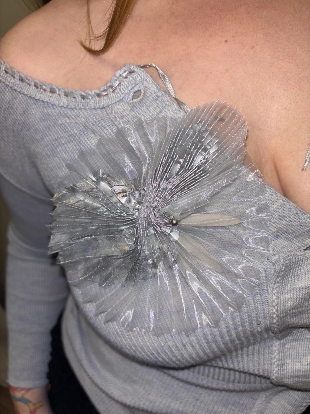 Unusual vintage Issey Miyake Fete pleated brooch. The brooch is made of an iridescent and printed fabric with a metal base. There is a dangling metal Issey Miyake Fete logo.