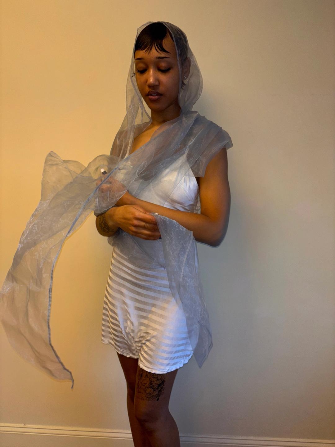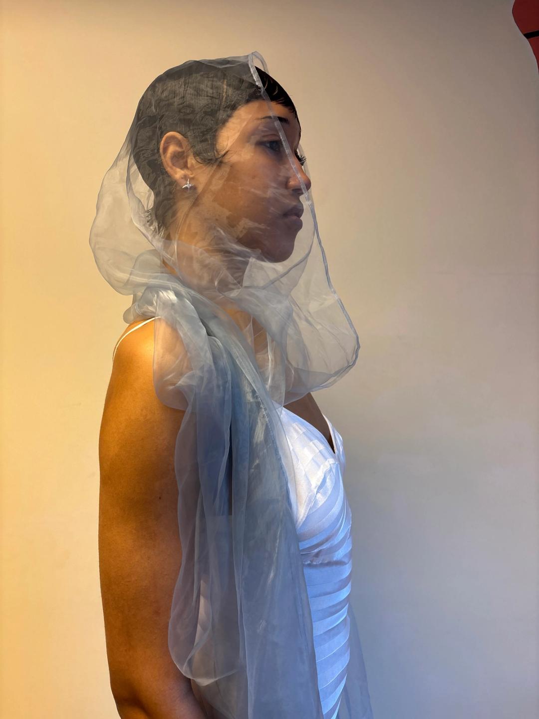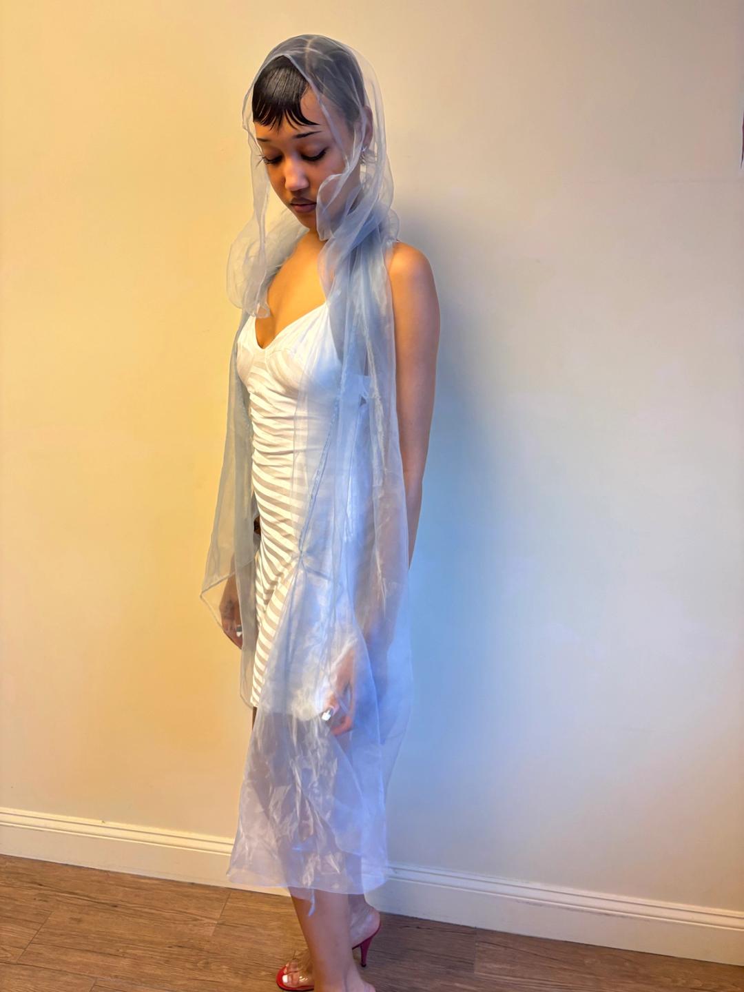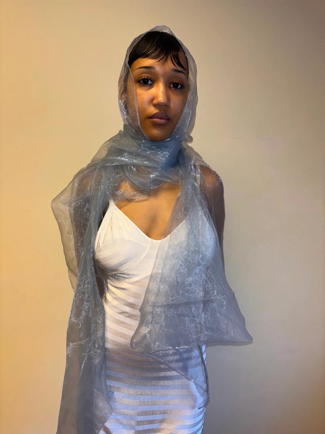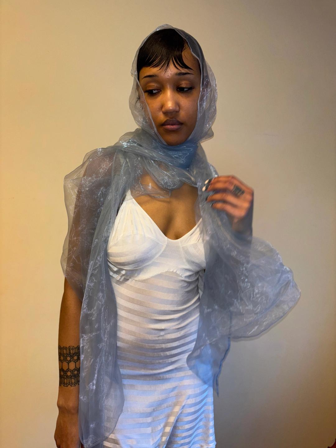 Issey Miyake glossy sheer blue/silver shawl. Can be worn and styled many different ways. Pristine condition, open size.