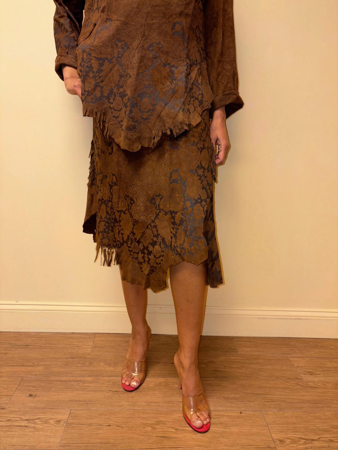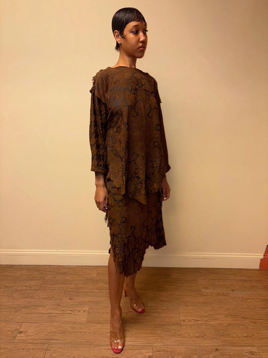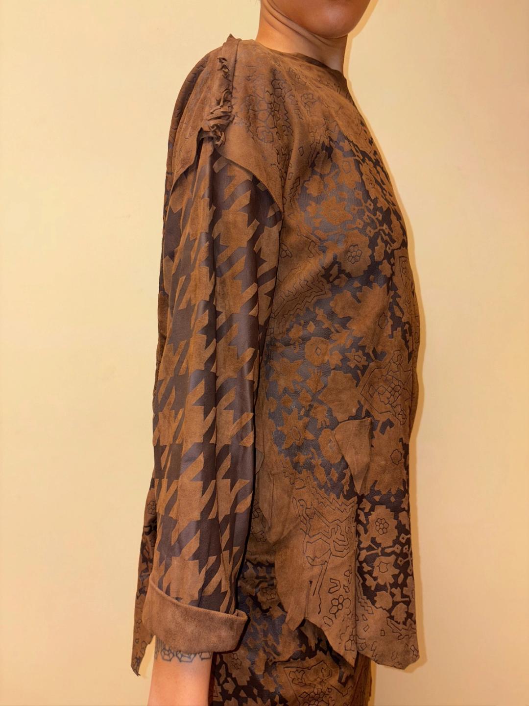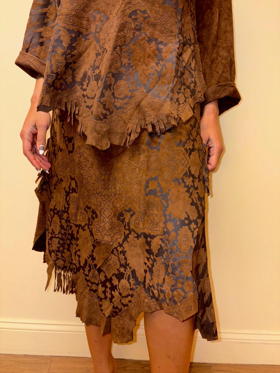 Gorgeous 80s printed leather set by an Pancaldi. The set includes an oversized top and wrap skirt. The set has raw edges and a unique abstract print throughout.