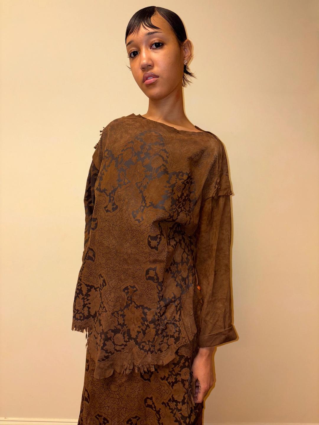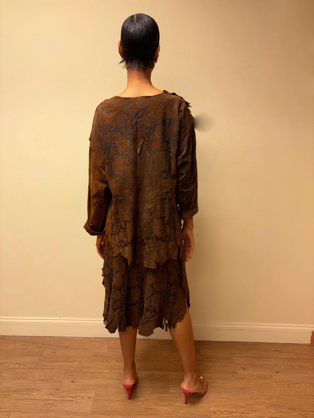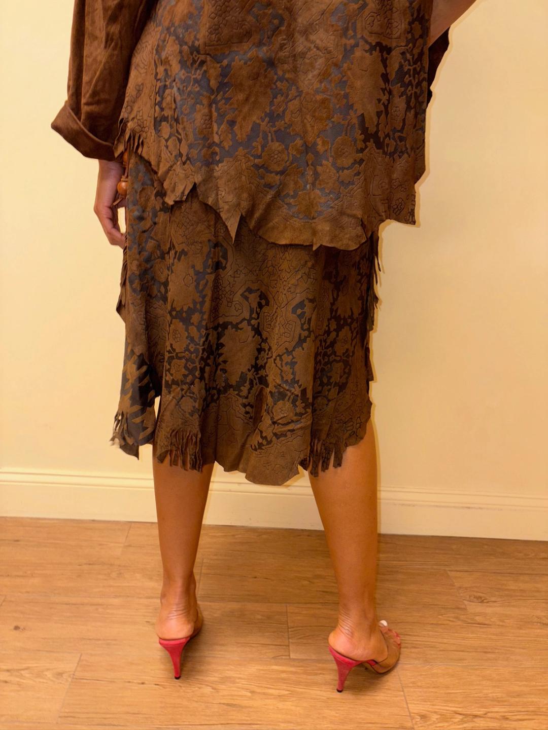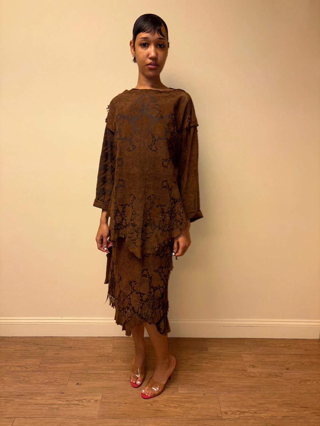 Gorgeous 80s printed leather set by an Pancaldi. The set includes an oversized top and wrap skirt. The set has raw edges and a unique abstract print throughout.