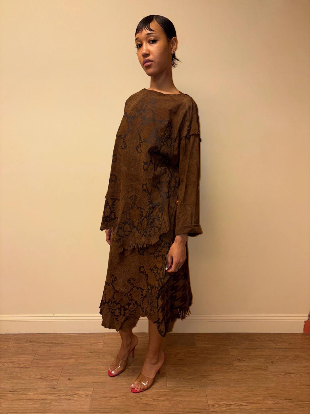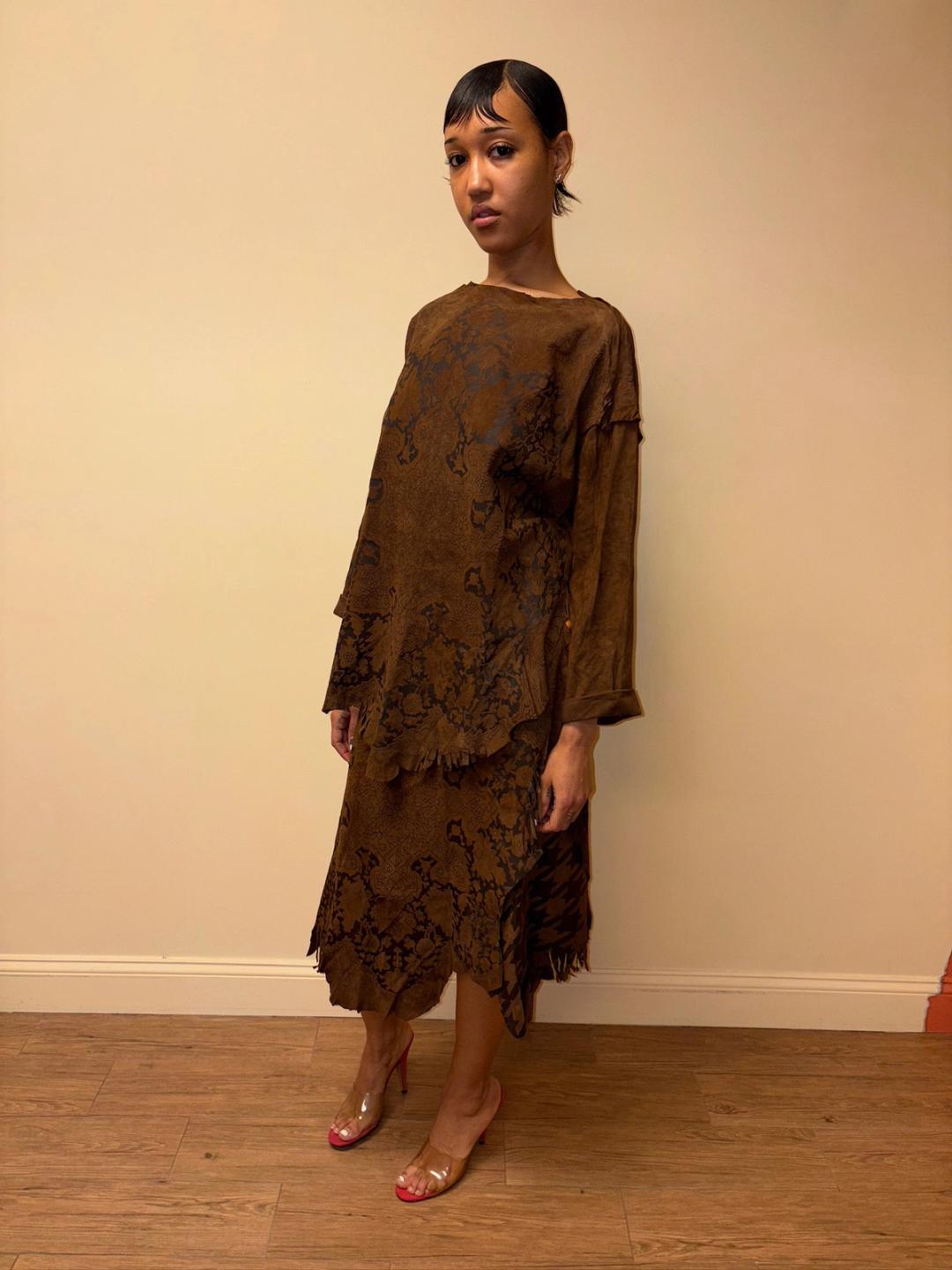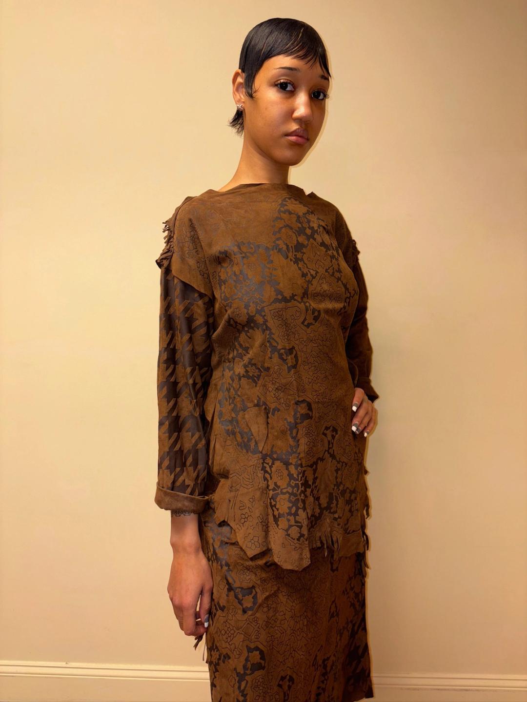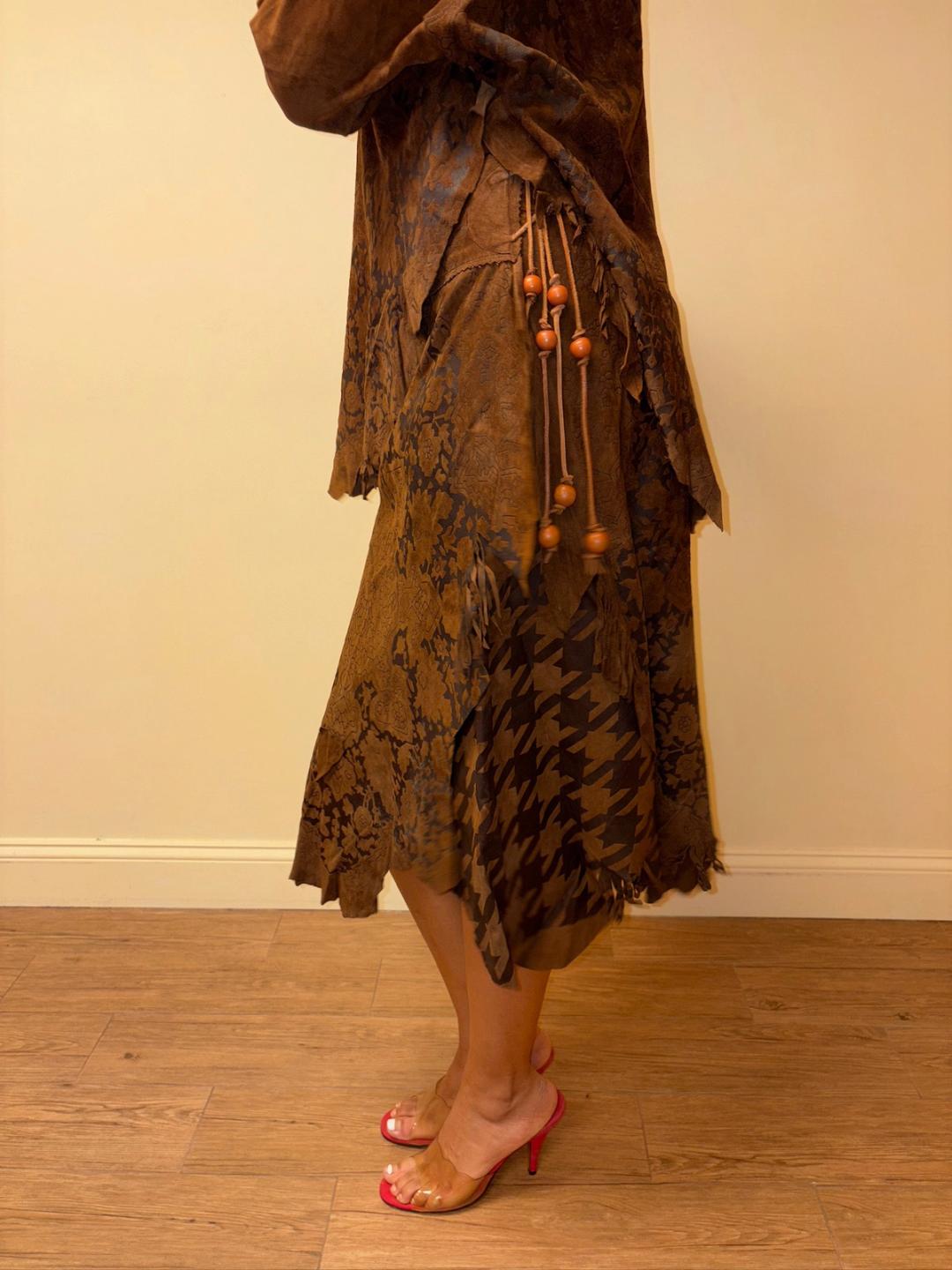 Gorgeous 80s printed leather set by an Pancaldi. The set includes an oversized top and wrap skirt. The set has raw edges and a unique abstract print throughout.