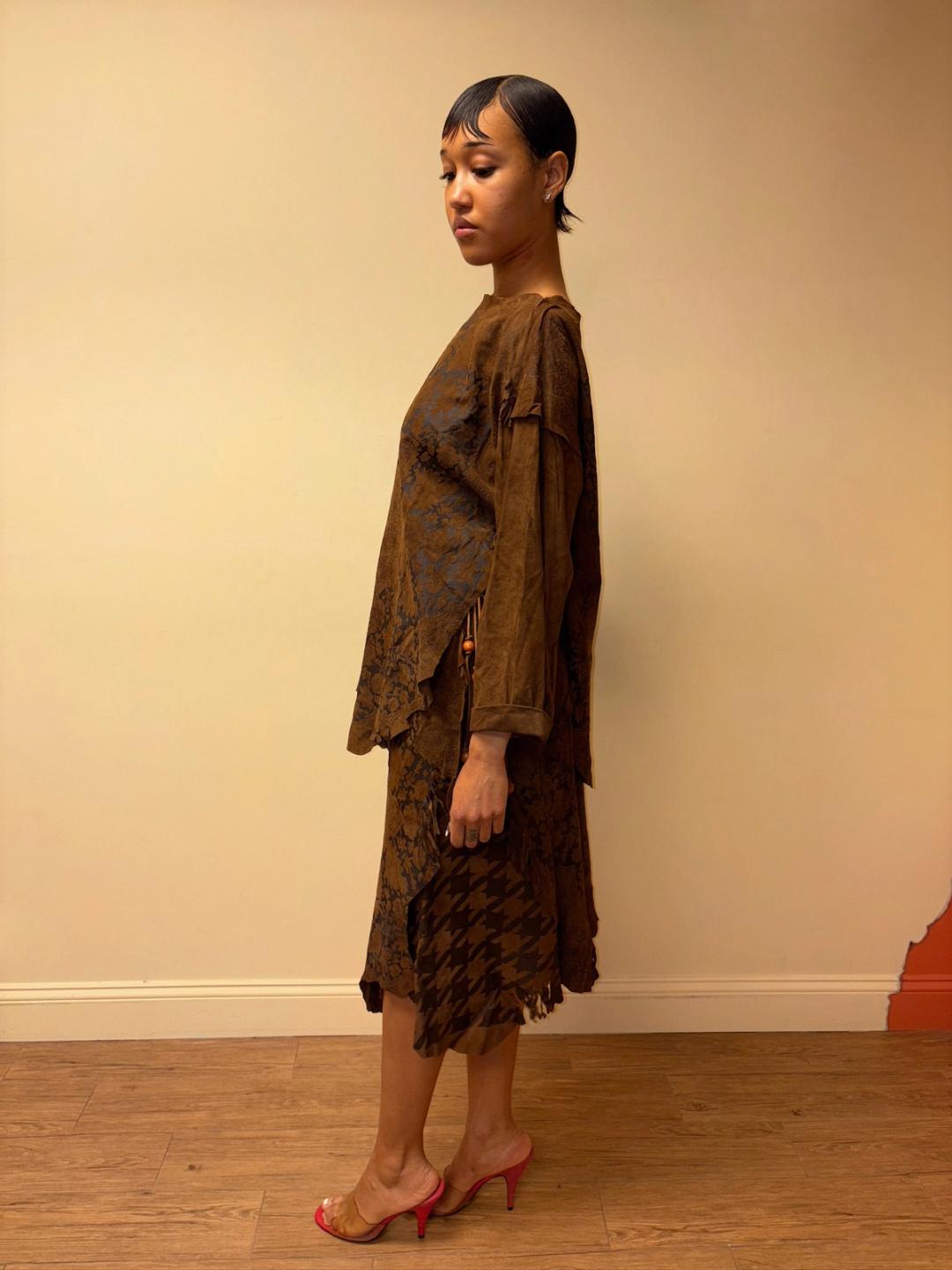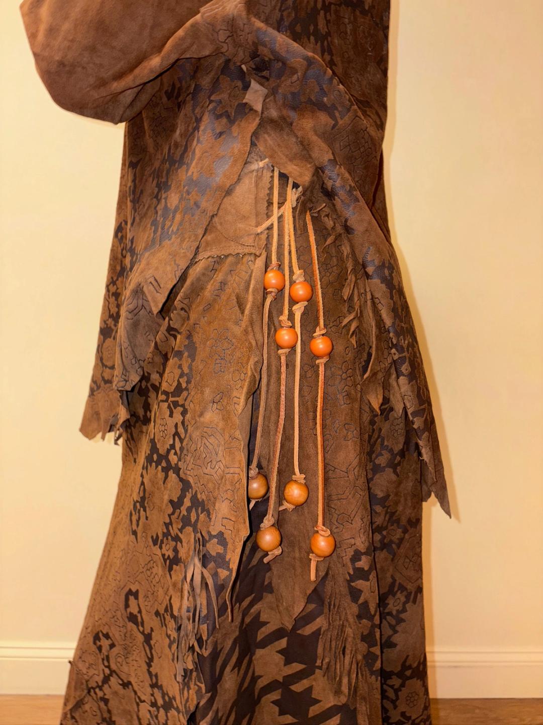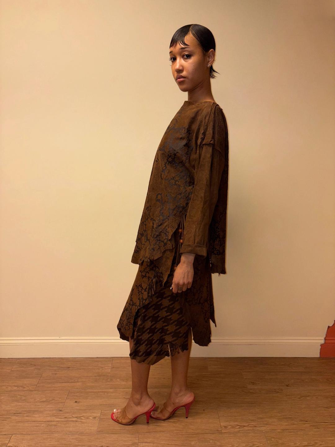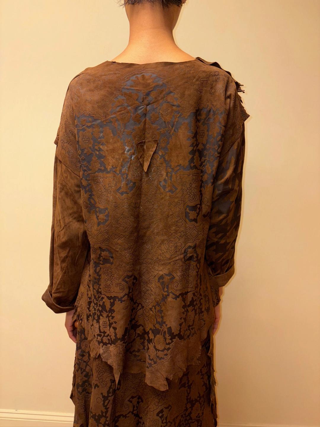 Gorgeous 80s printed leather set by an Pancaldi. The set includes an oversized top and wrap skirt. The set has raw edges and a unique abstract print throughout.