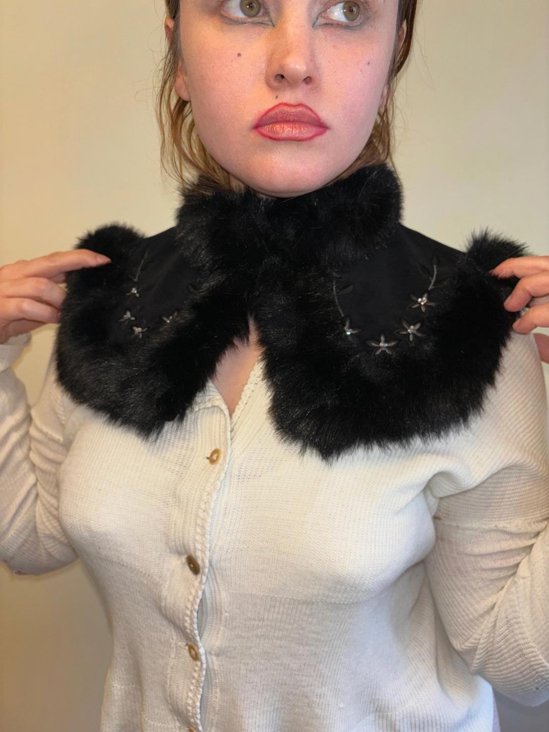 Faux fur black collar with rhinestone floral embellishments by Jane Marple. The collar has closures at the center front and has its original tags. One size fits most.