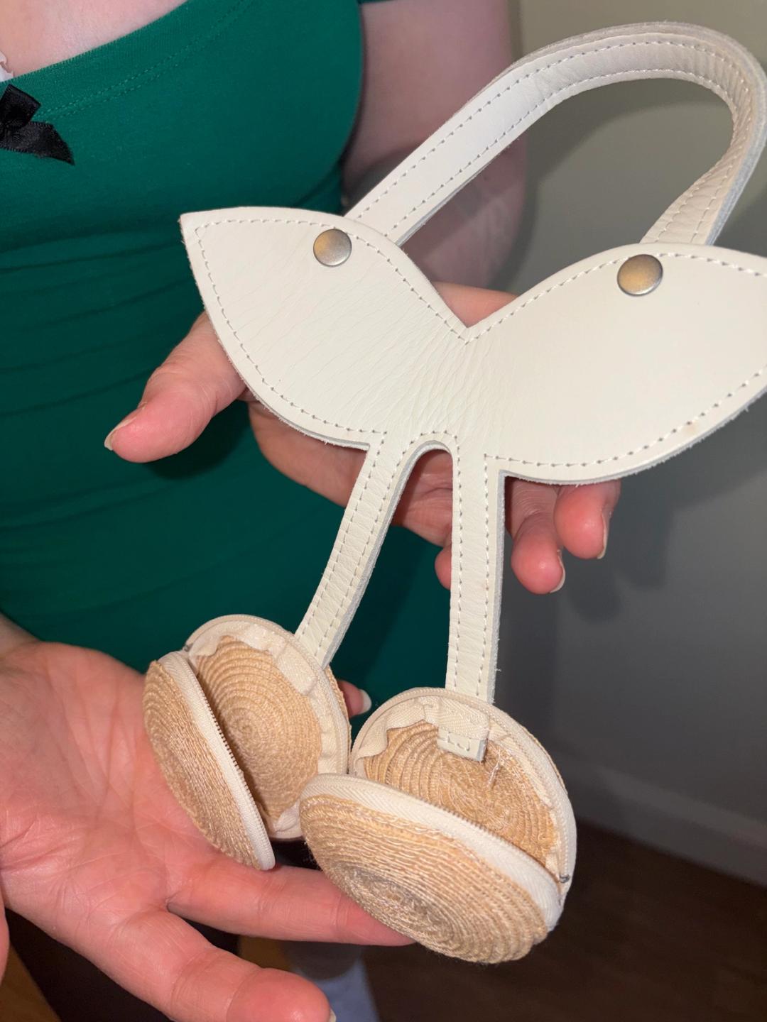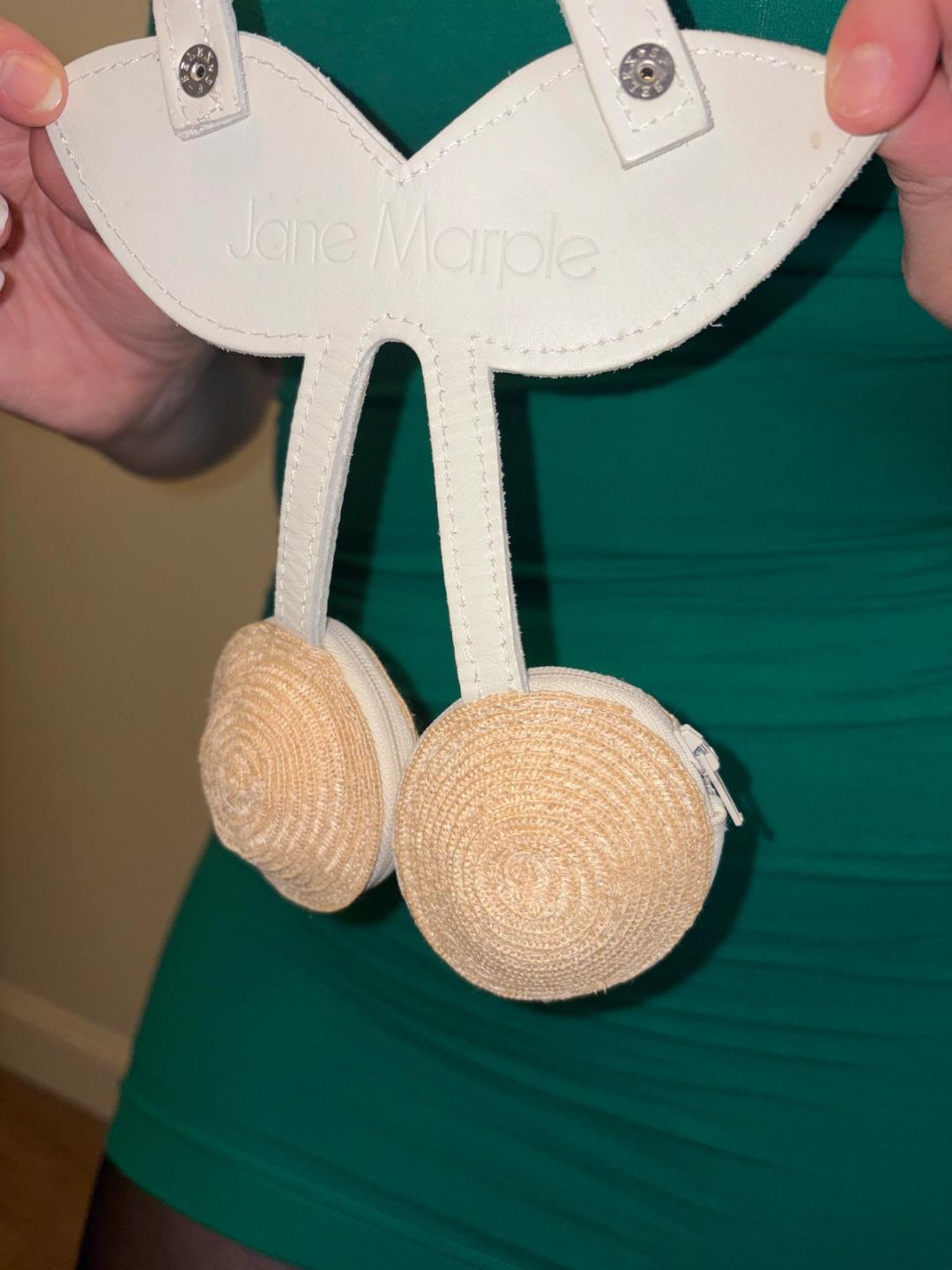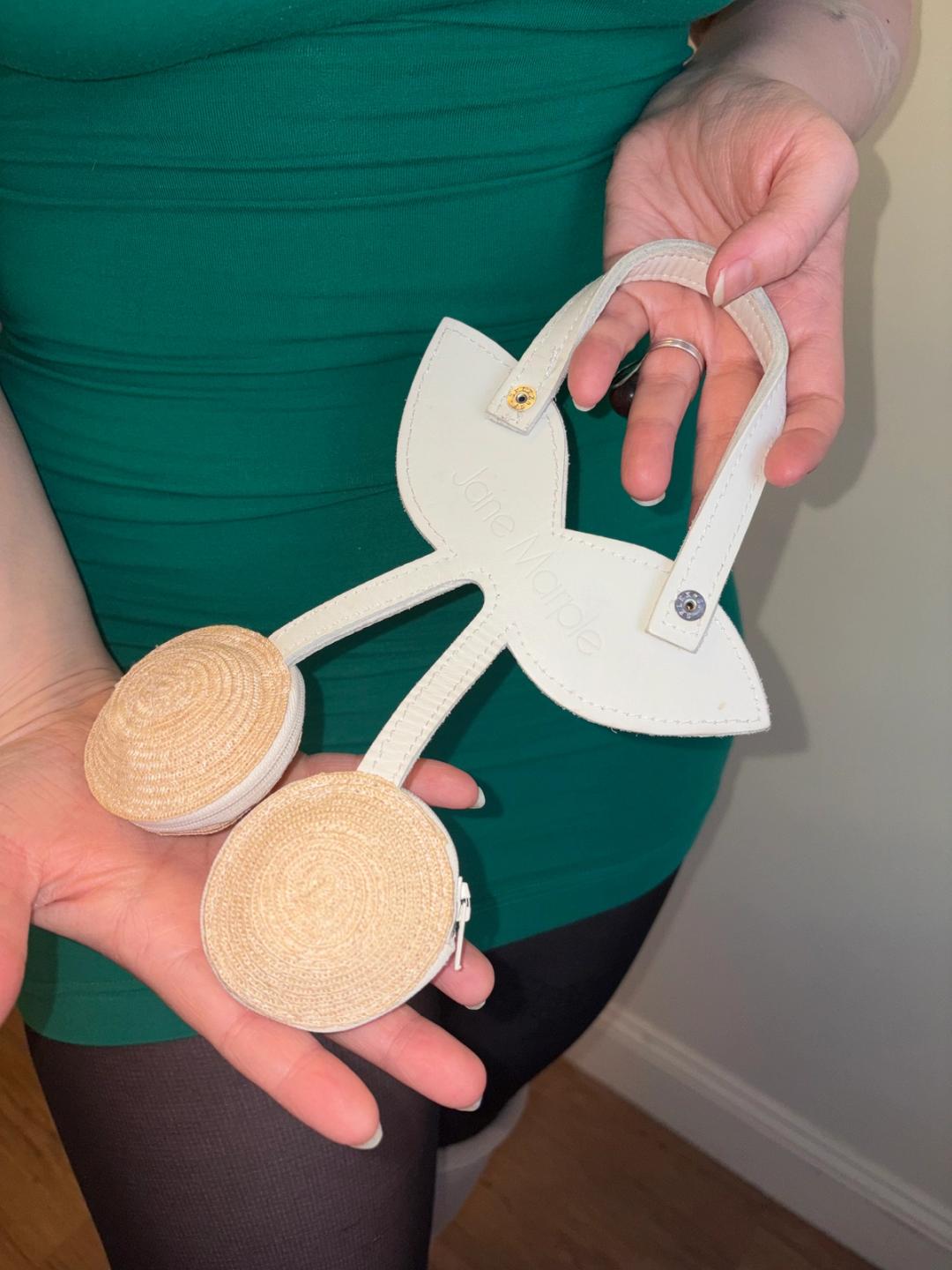 Unique cherry purse by Jane Marple. The bag has two small pouches with zipper closures and a white leather handle. In excellent condition!