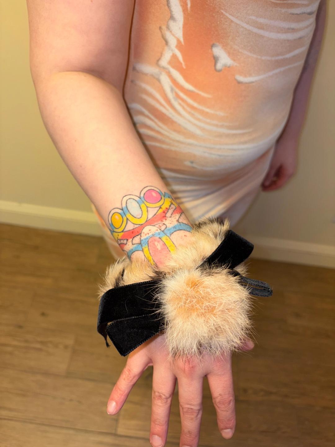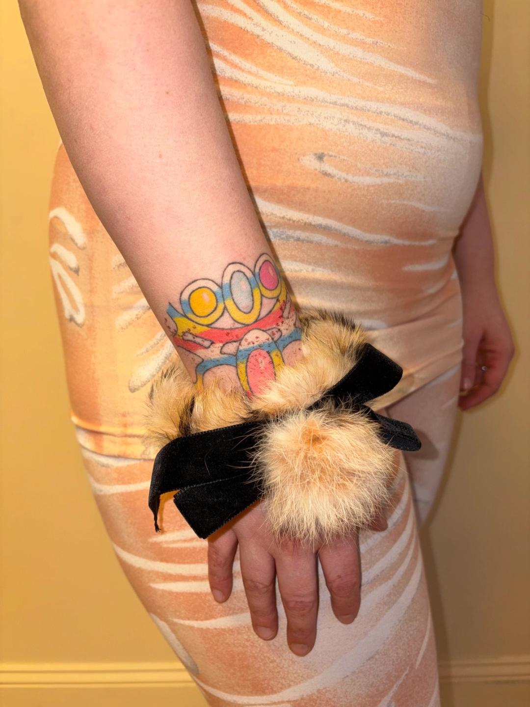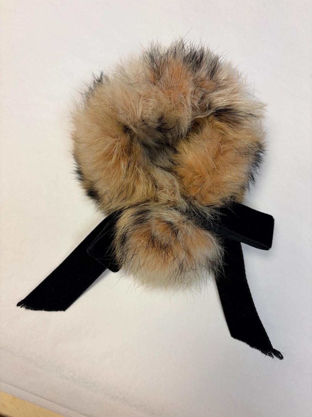 Jane Marple fur ponytail holder or bracelet. It's made of a peach colored rabbit fur and has an oversized velvet ribbon.