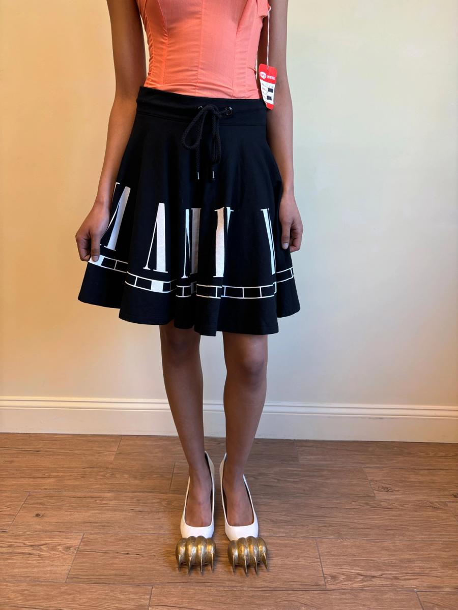 JC de Castelbajac circle skirt with bold clock print. The skirt has a drawstring closure.