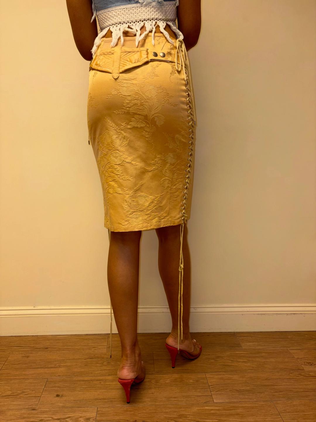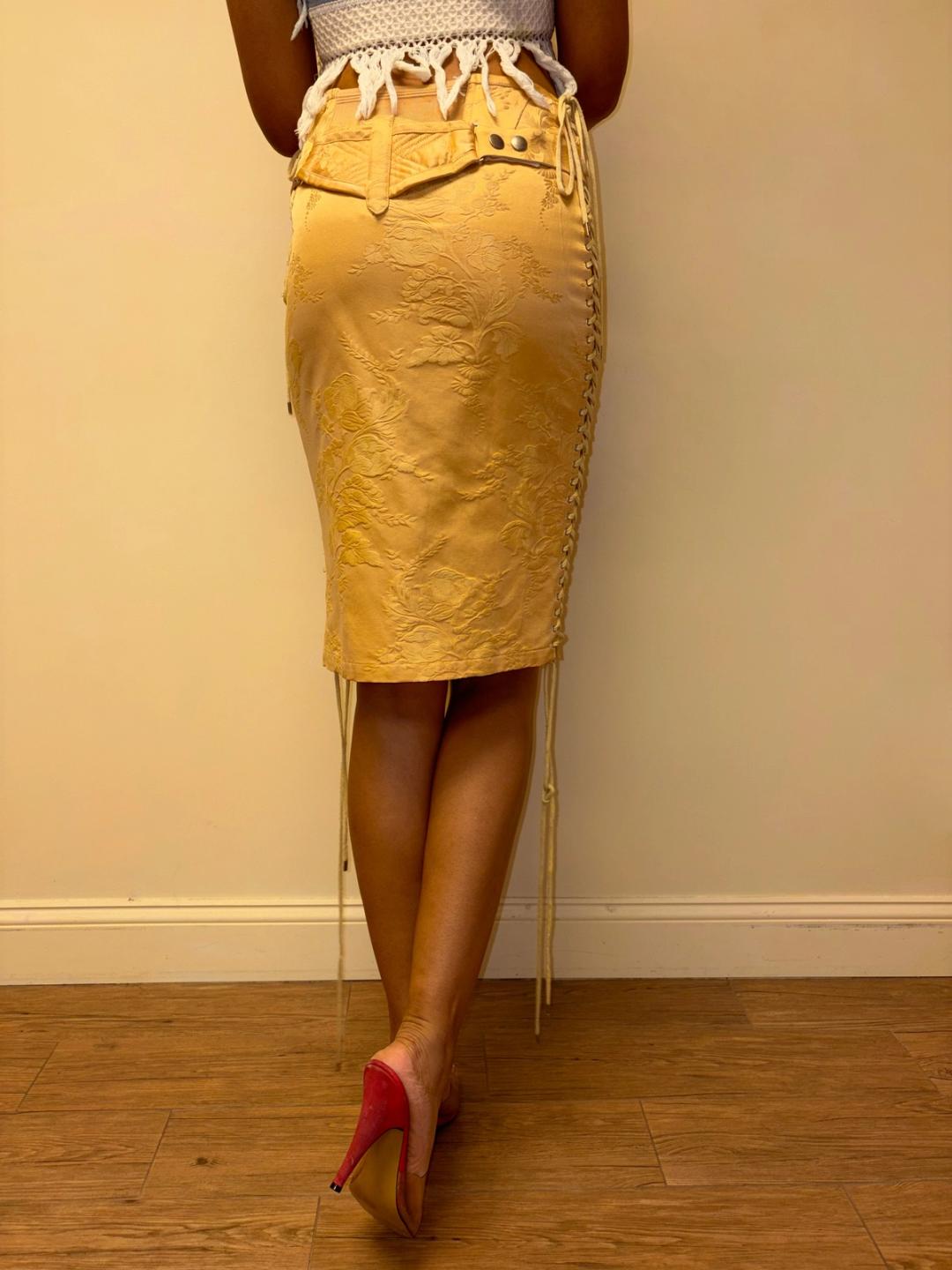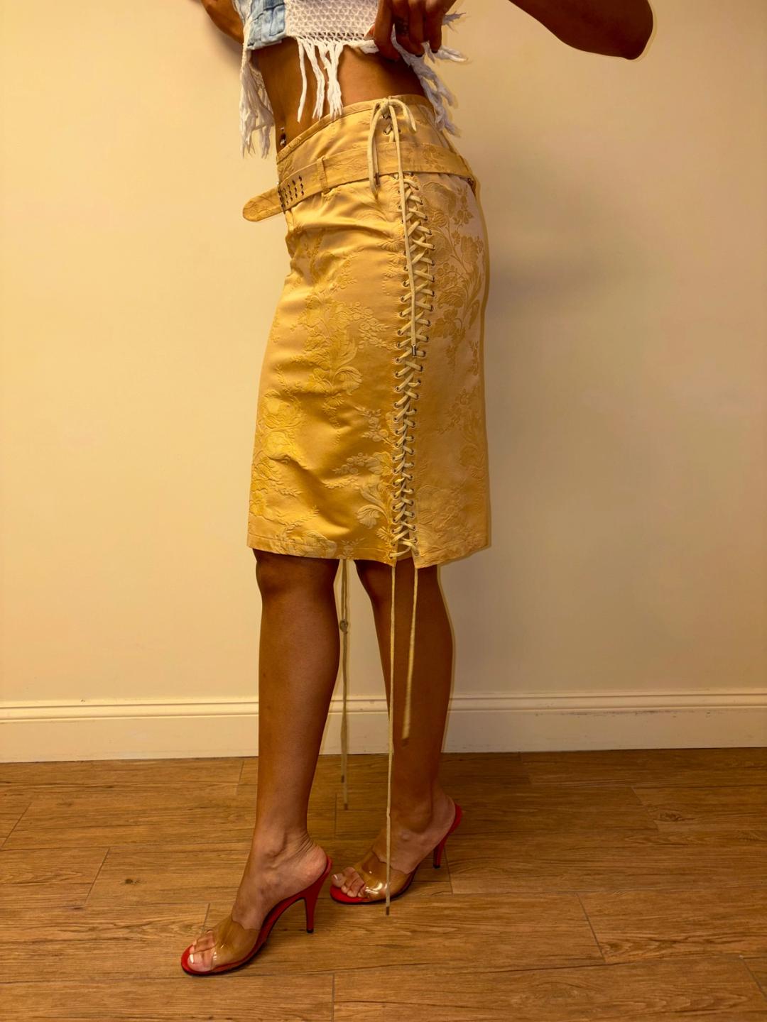 90s or early 2000s Jean-Paul Gaultier jacquard corset skirt with dramatic lacing. There is elastic at the back of the skirt. It has an adjustable quilted bustle belt. USA 6/ fr 36/I 40. Some light staining (see last photos) priced accordingly.