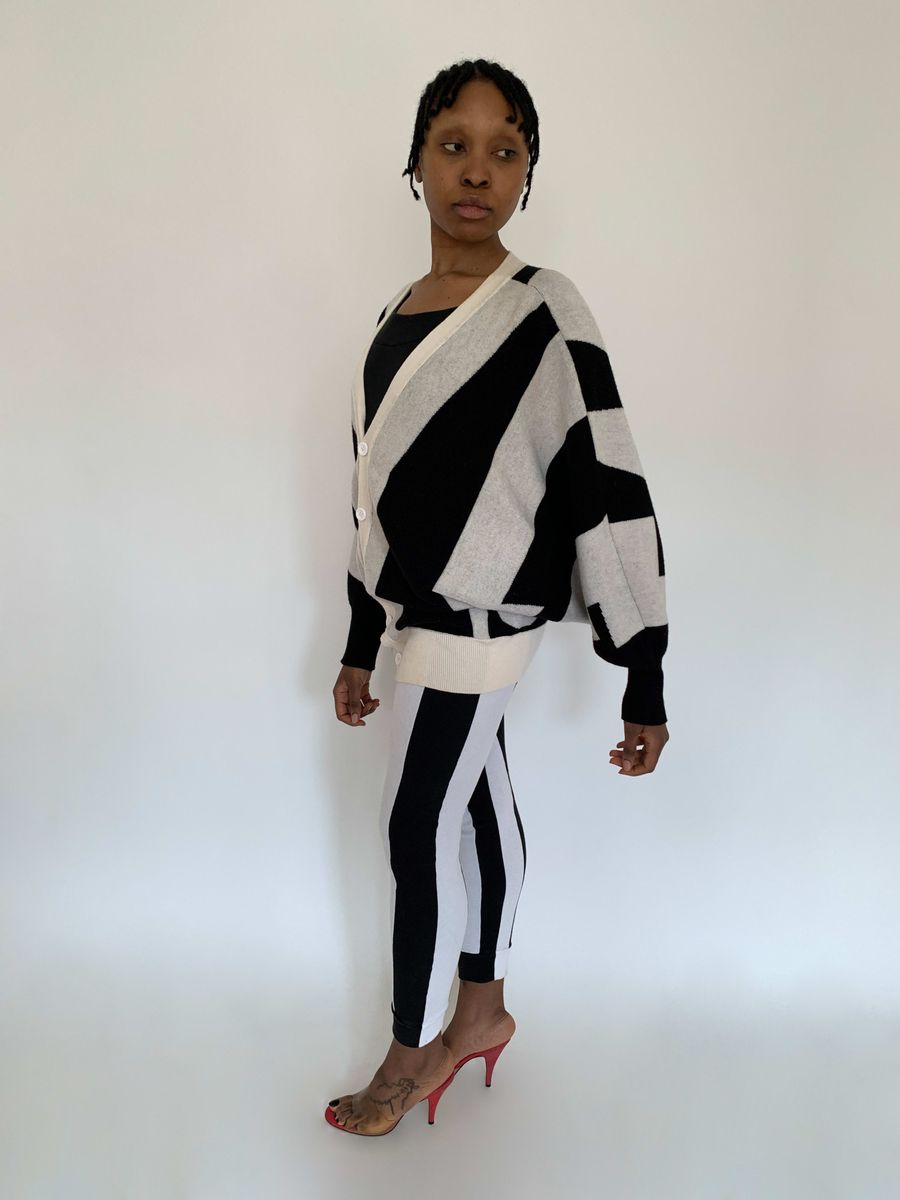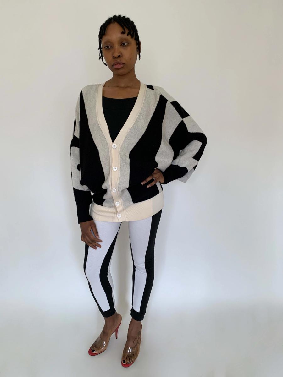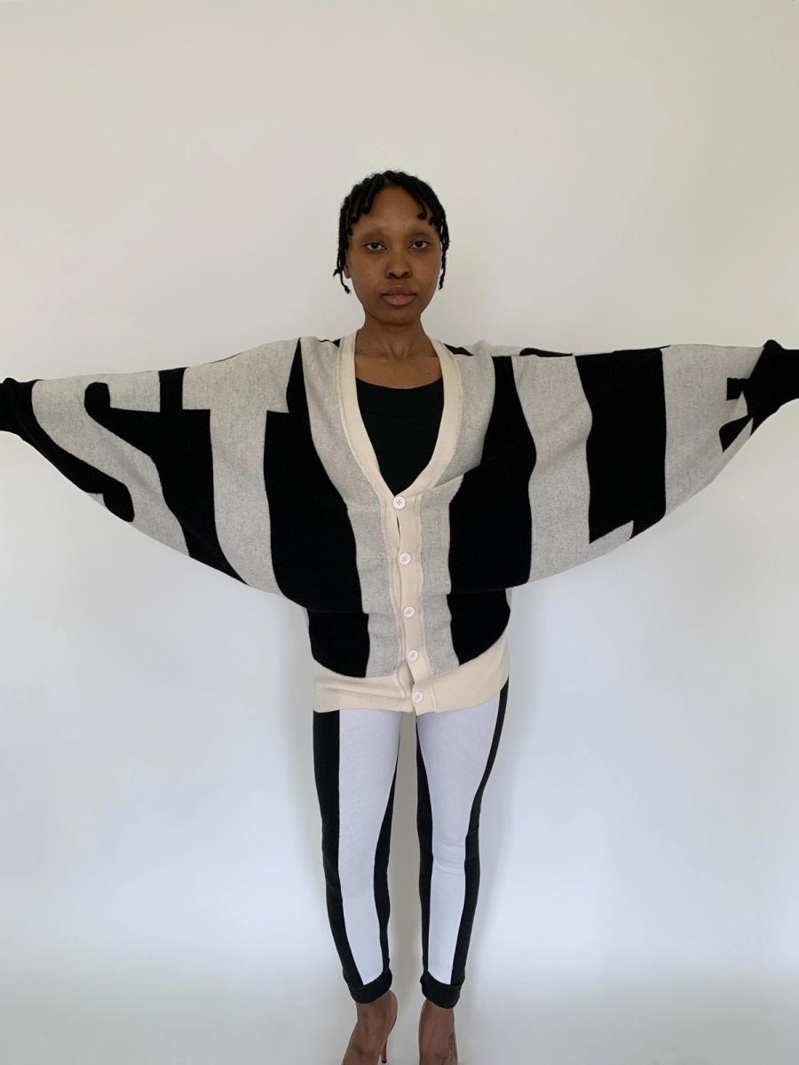 Rare sweater by Jeremy Scott from fall/winter 2010. The sweater spells "Style" in the front and "Fashion" in the back. The sweater has dramatic 80s style dolman sleeves and buttons down the front. It has a knit waist band for a slouchy fit when buttoned. Fairly free size.
