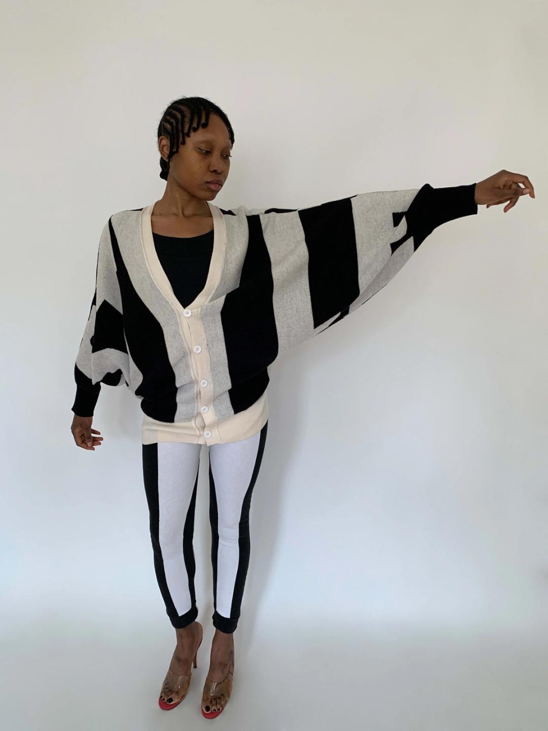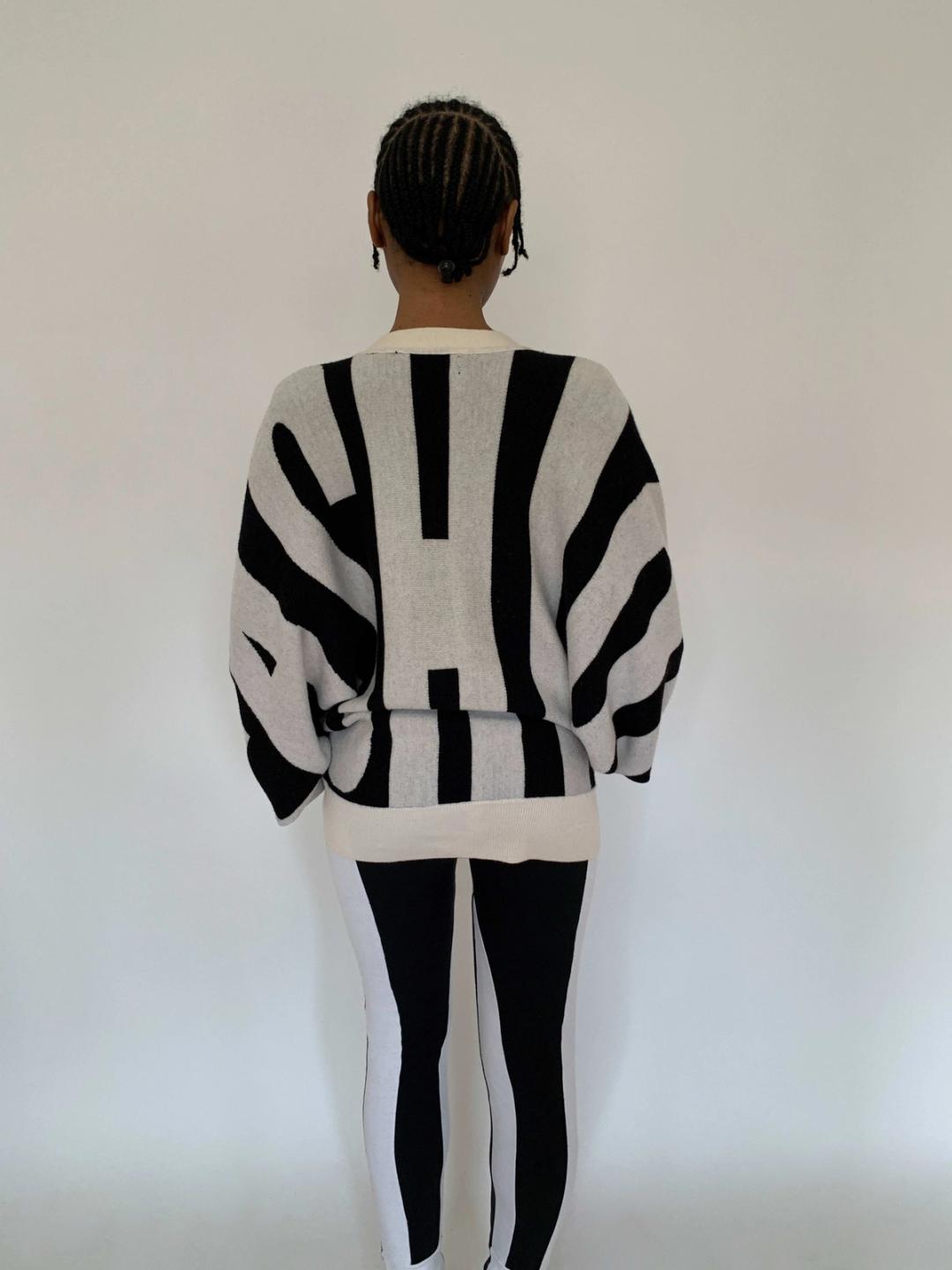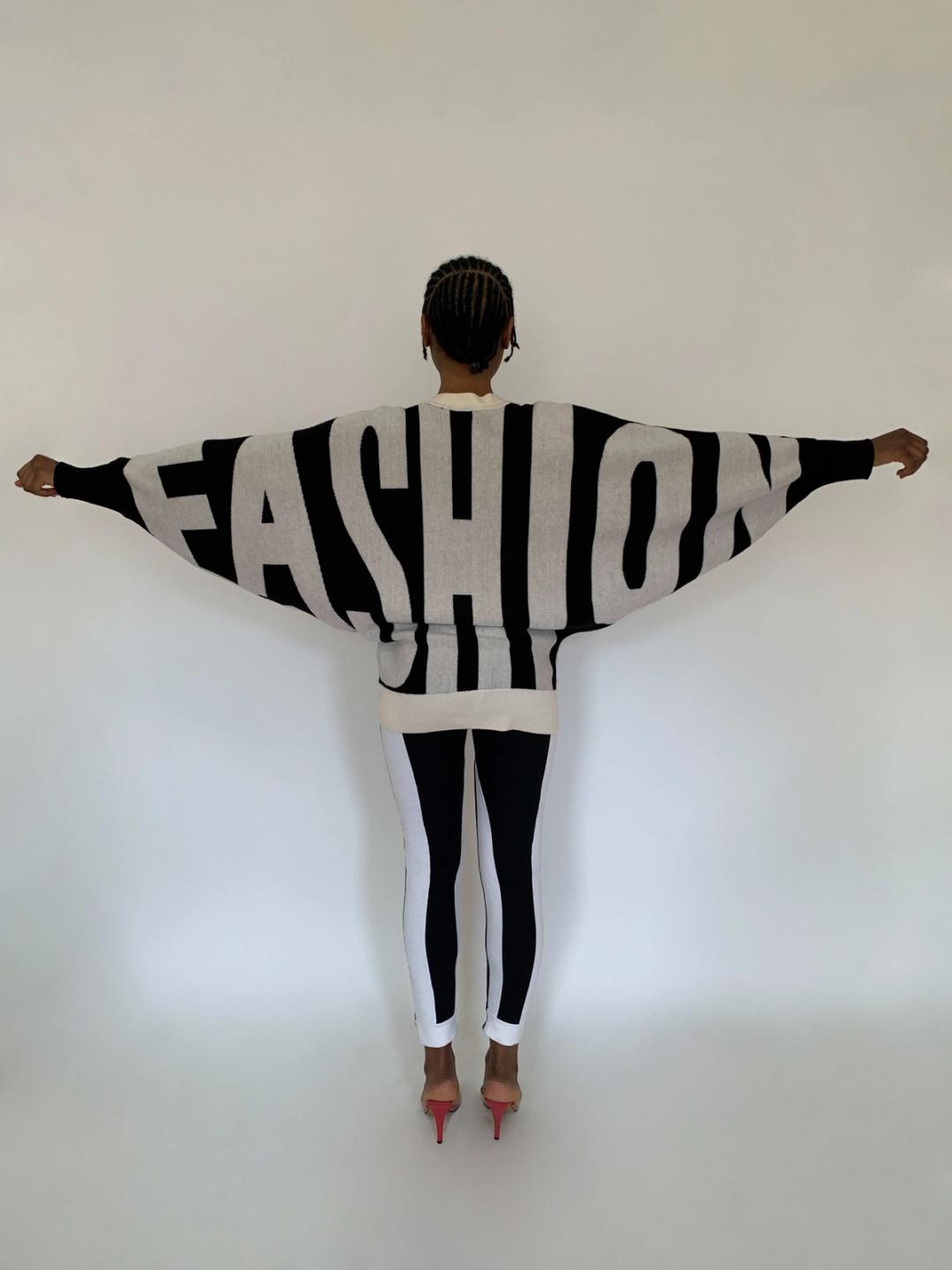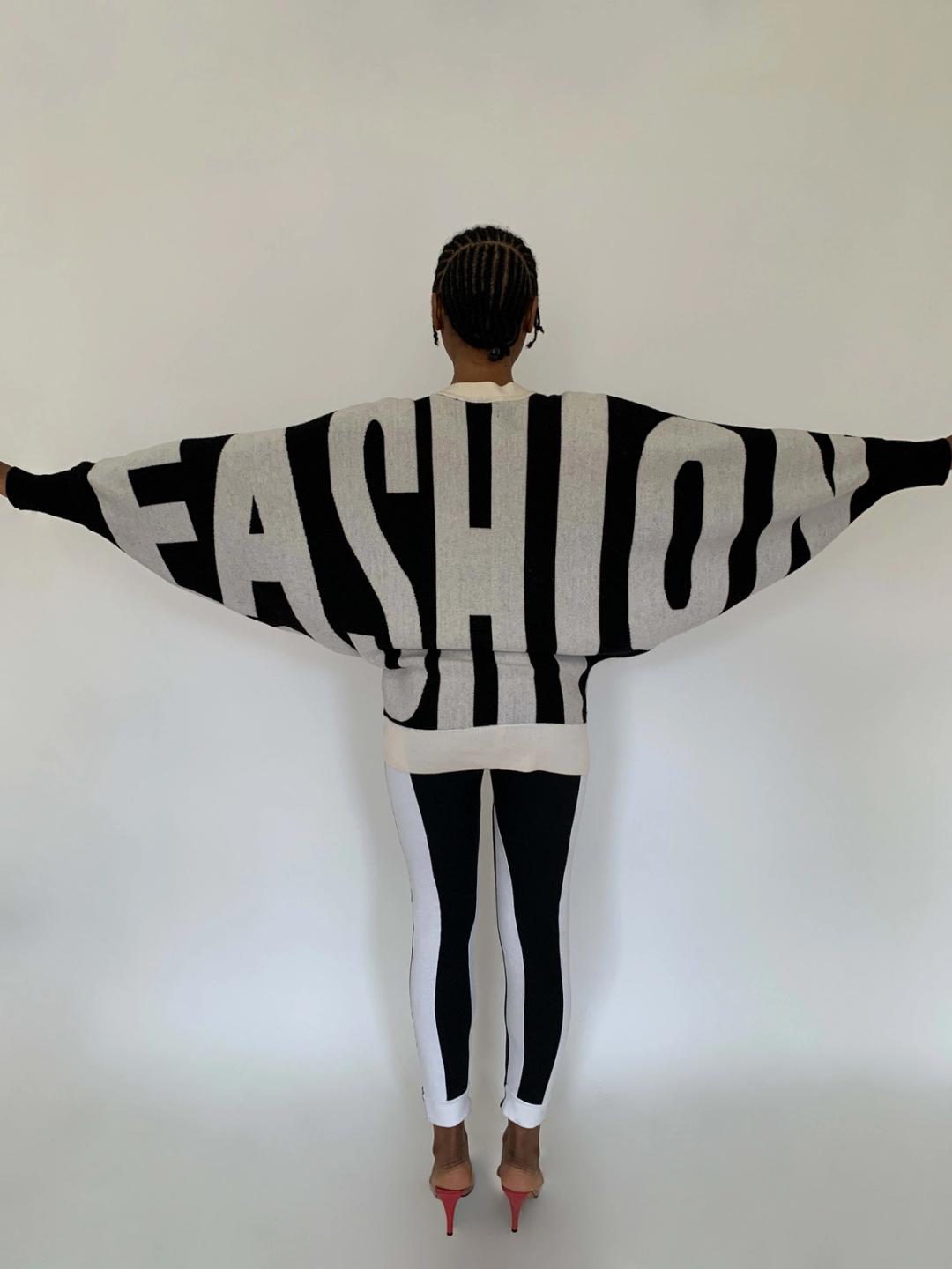 Rare sweater by Jeremy Scott from fall/winter 2010. The sweater spells "Style" in the front and "Fashion" in the back. The sweater has dramatic 80s style dolman sleeves and buttons down the front. It has a knit waist band for a slouchy fit when buttoned. Fairly free size.