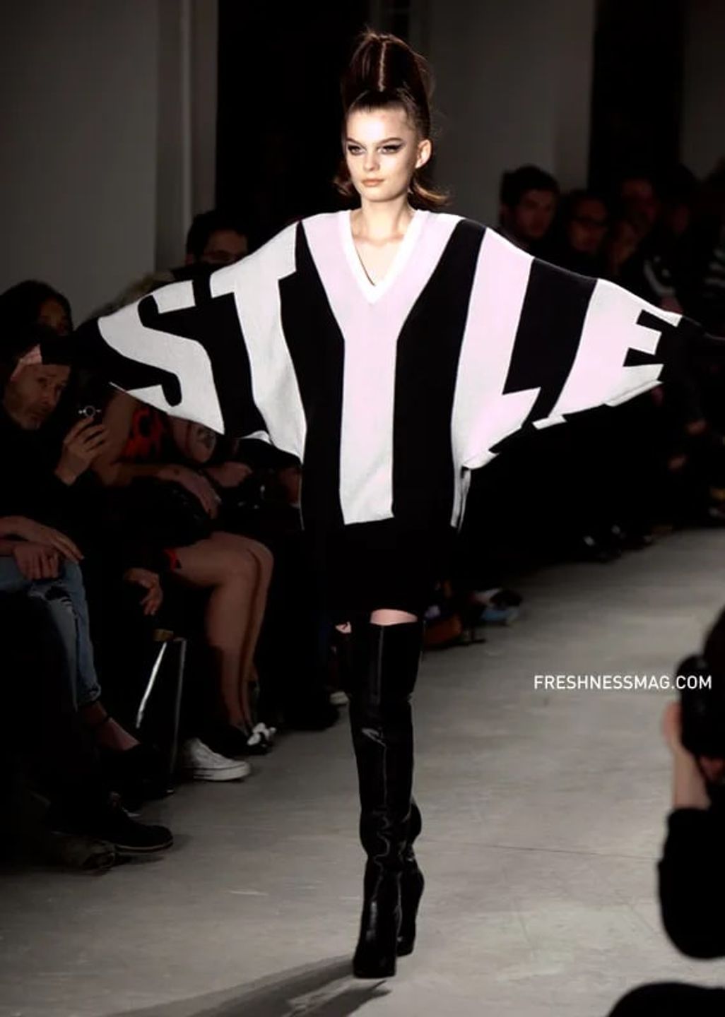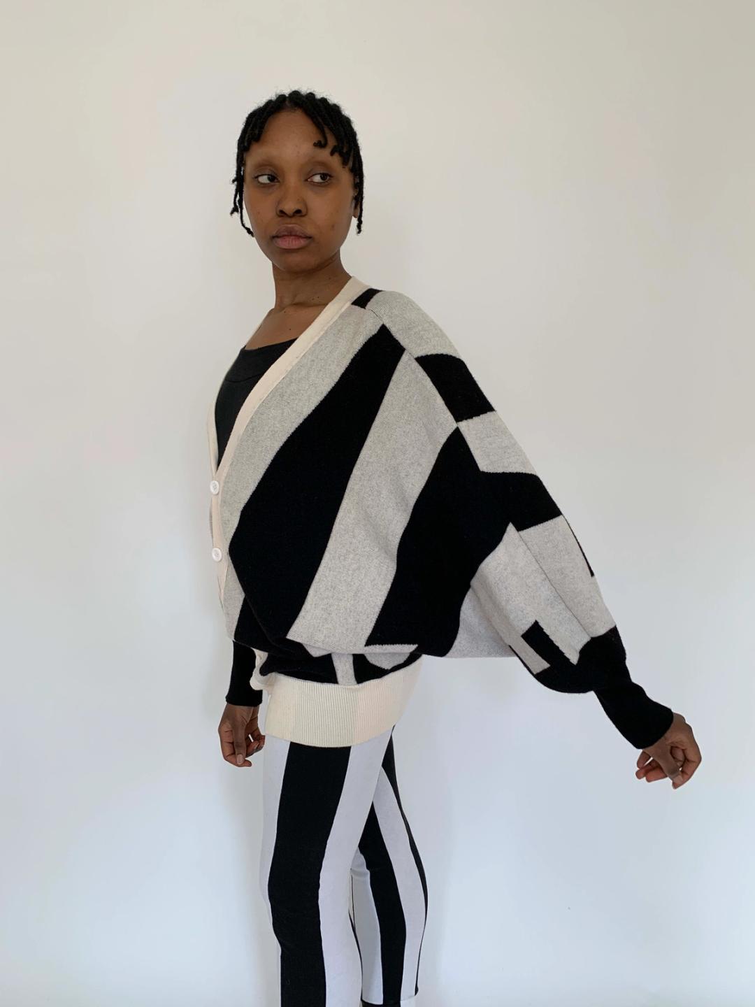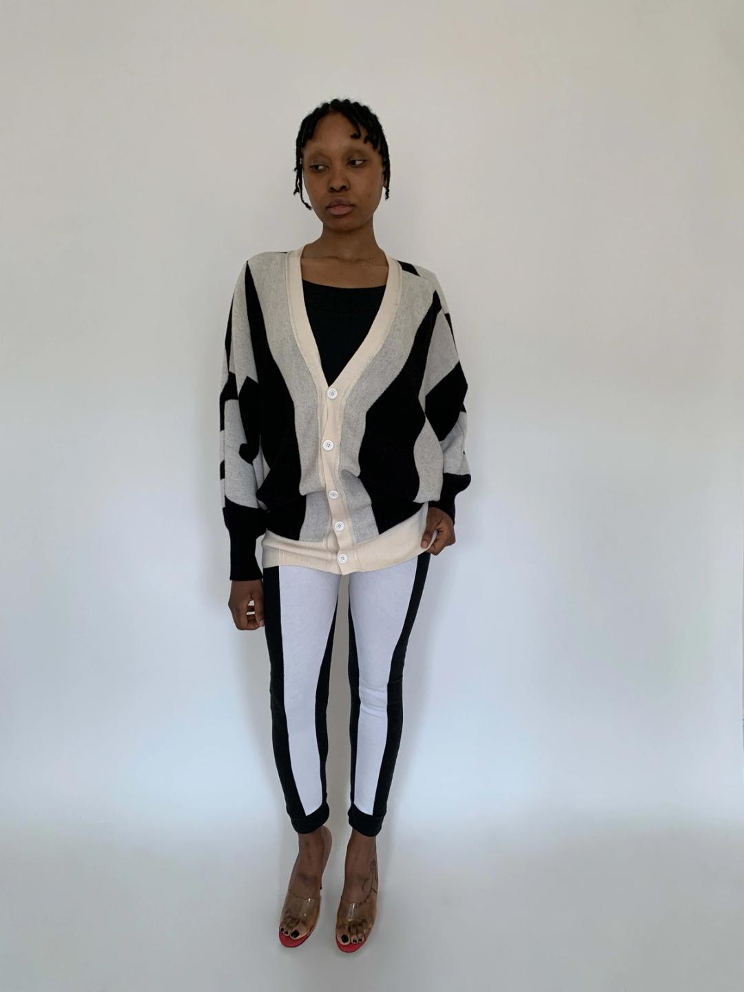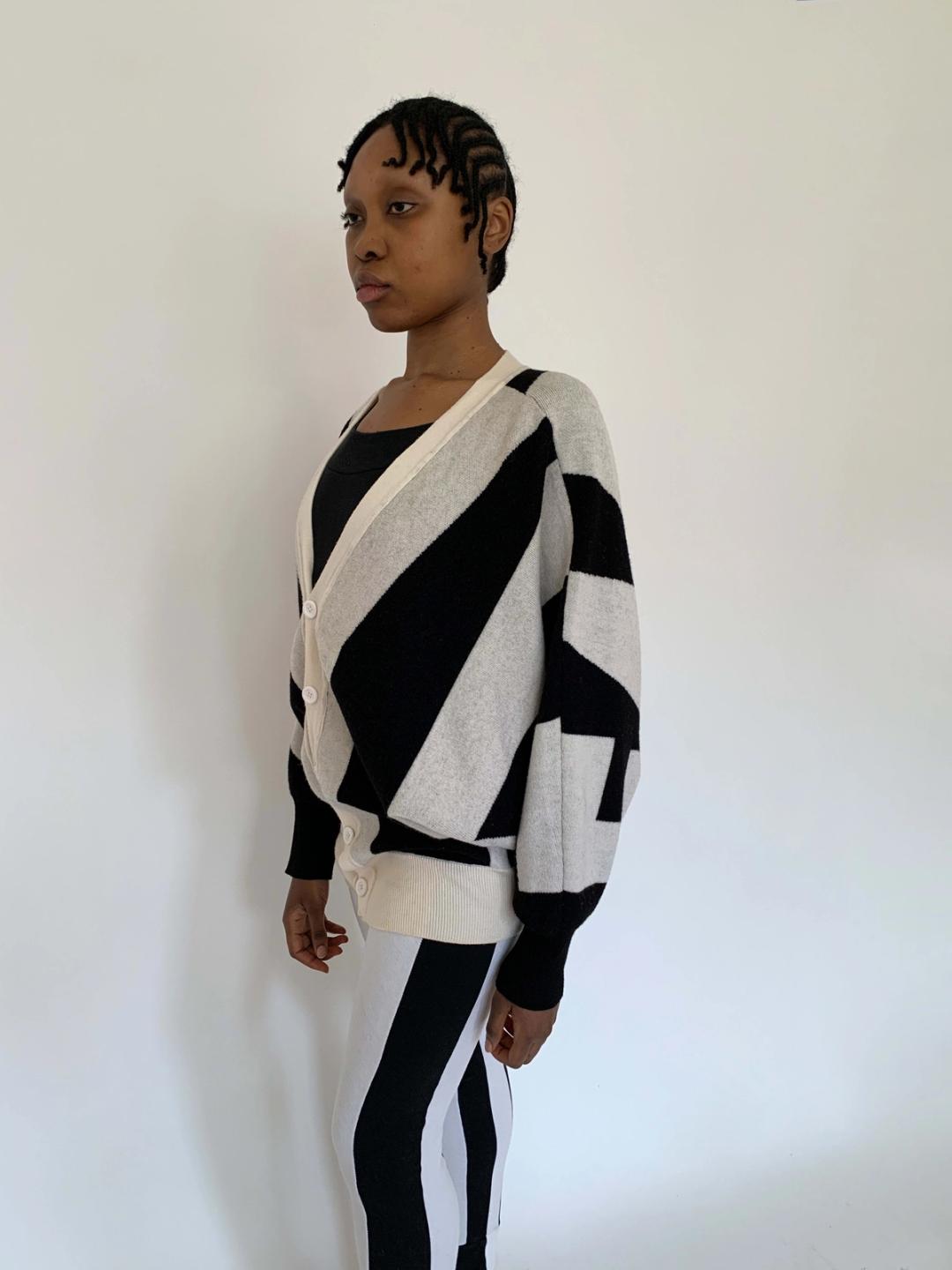 Rare sweater by Jeremy Scott from fall/winter 2010. The sweater spells "Style" in the front and "Fashion" in the back. The sweater has dramatic 80s style dolman sleeves and buttons down the front. It has a knit waist band for a slouchy fit when buttoned. Fairly free size.
