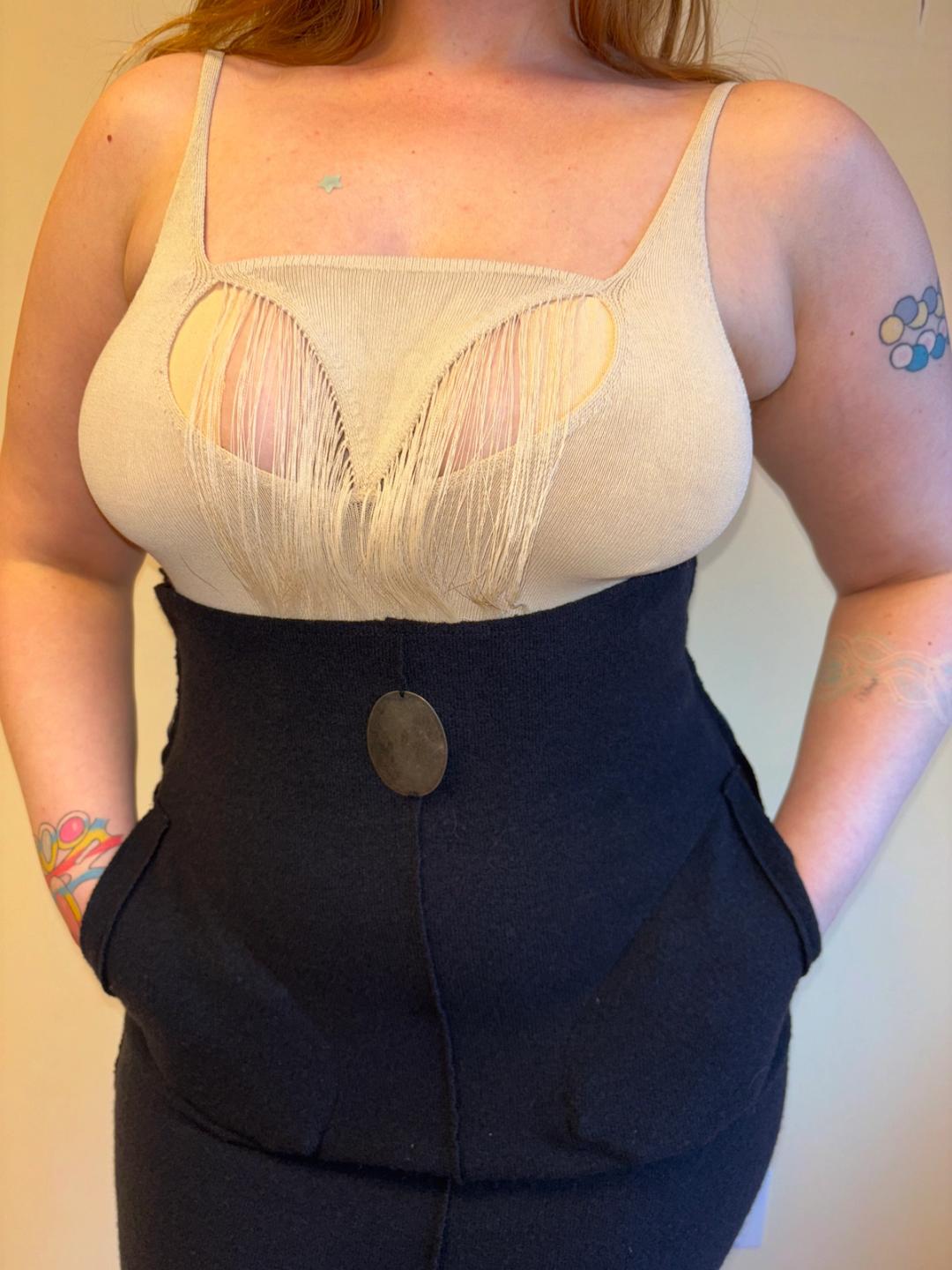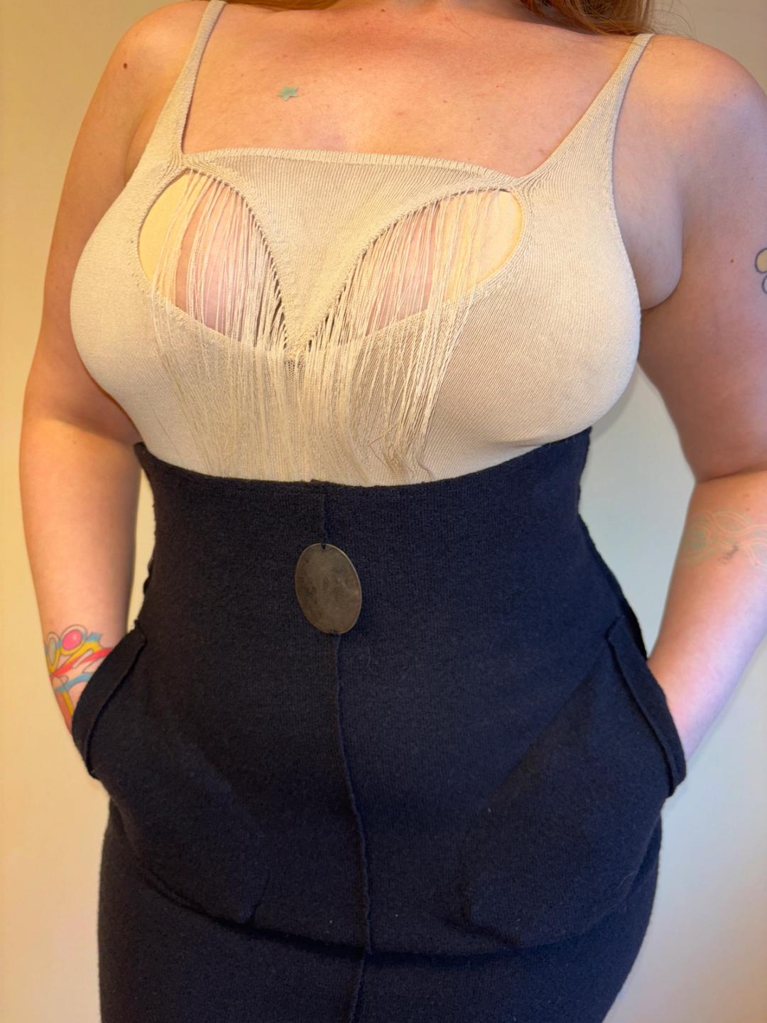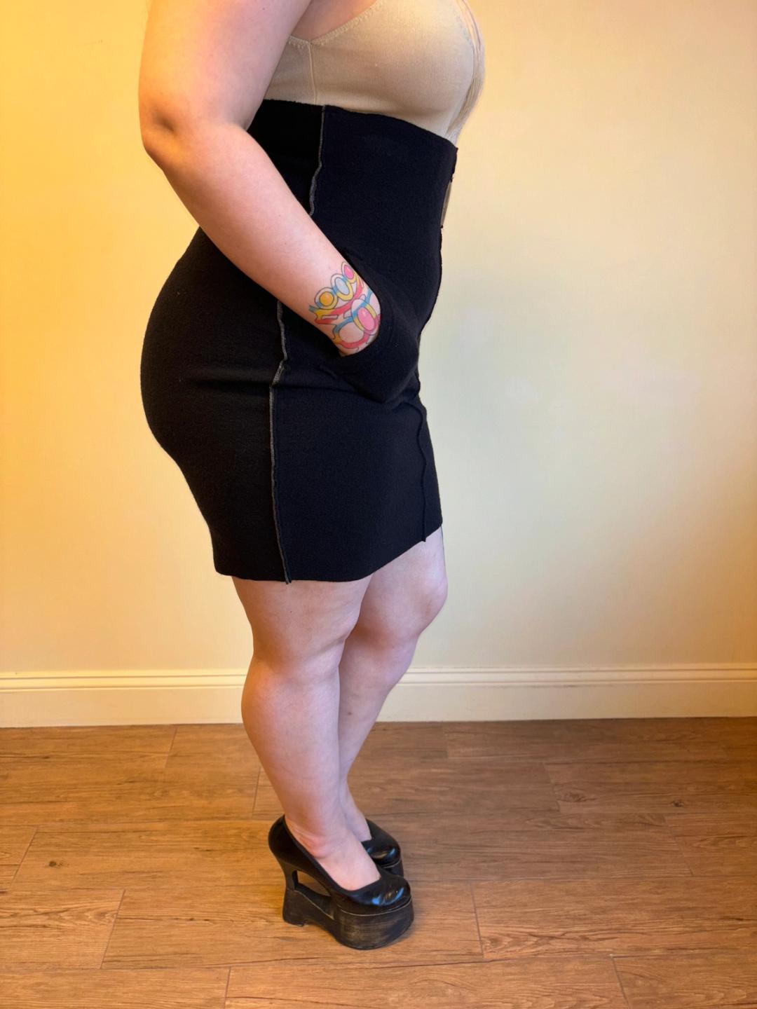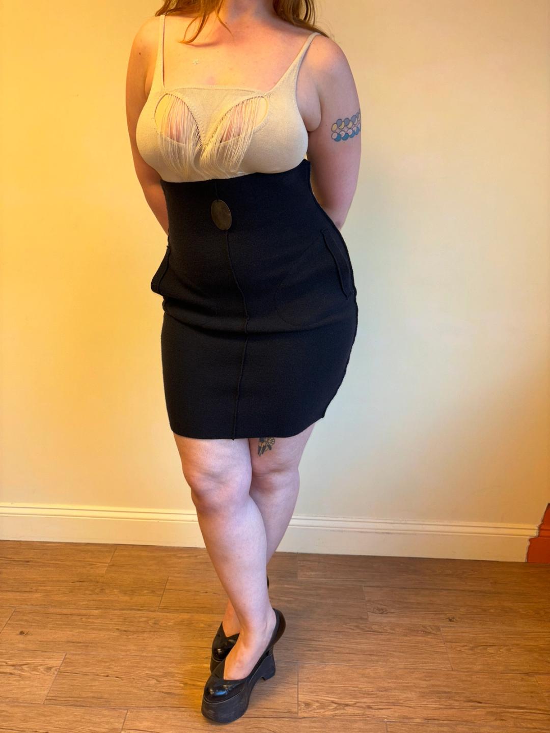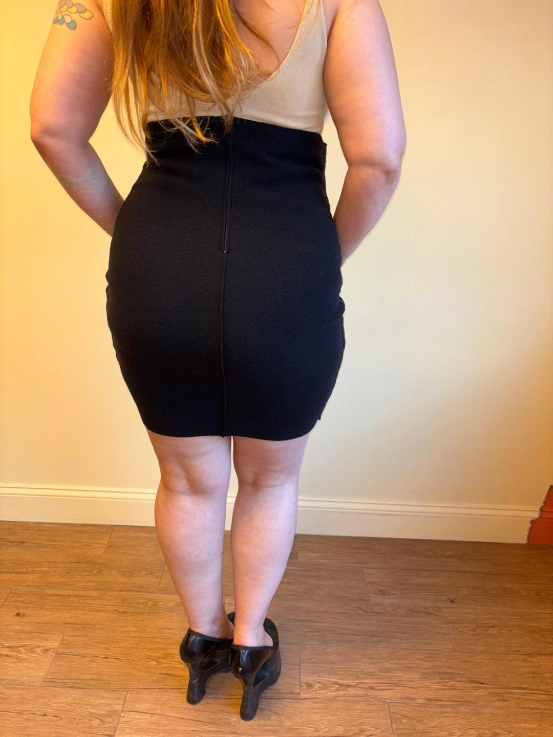 Krizia knit high waisted pencil skirt with pockets with metal plate accent at the high waist. Its lines contour to the body and it zips in the back. Excellent condition.