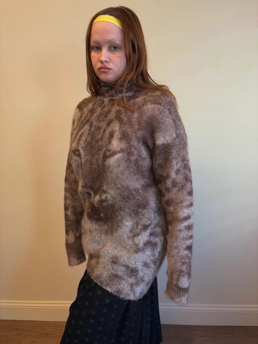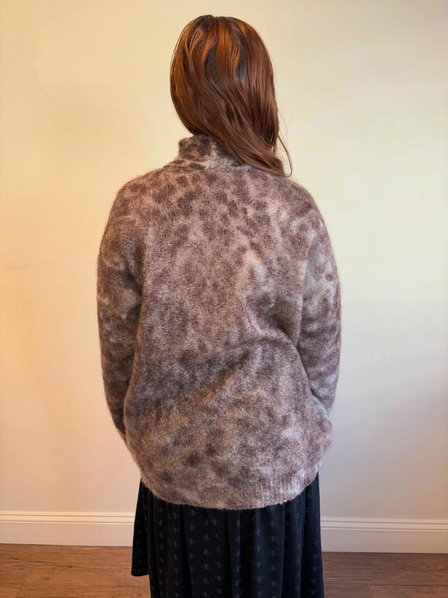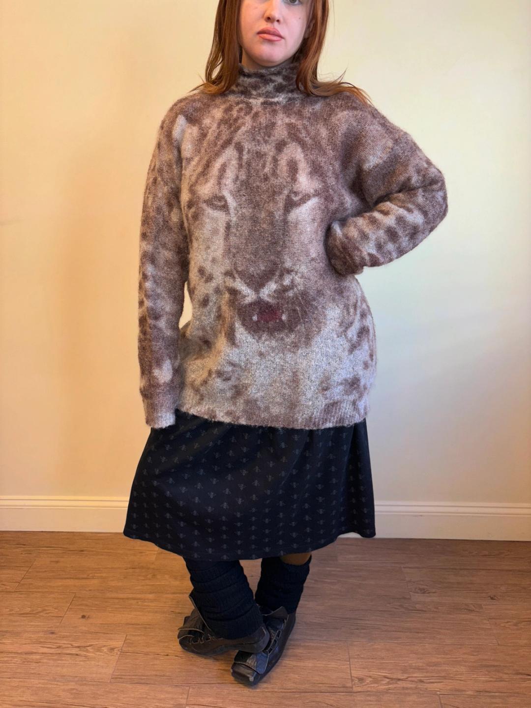 1980s Krizia Maglia lion/cheetah photographic portrait print transposed onto a knit fabric, beautiful technique. The fabric is a thin open knit made of angora and wool