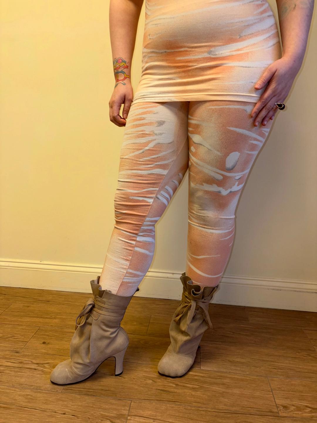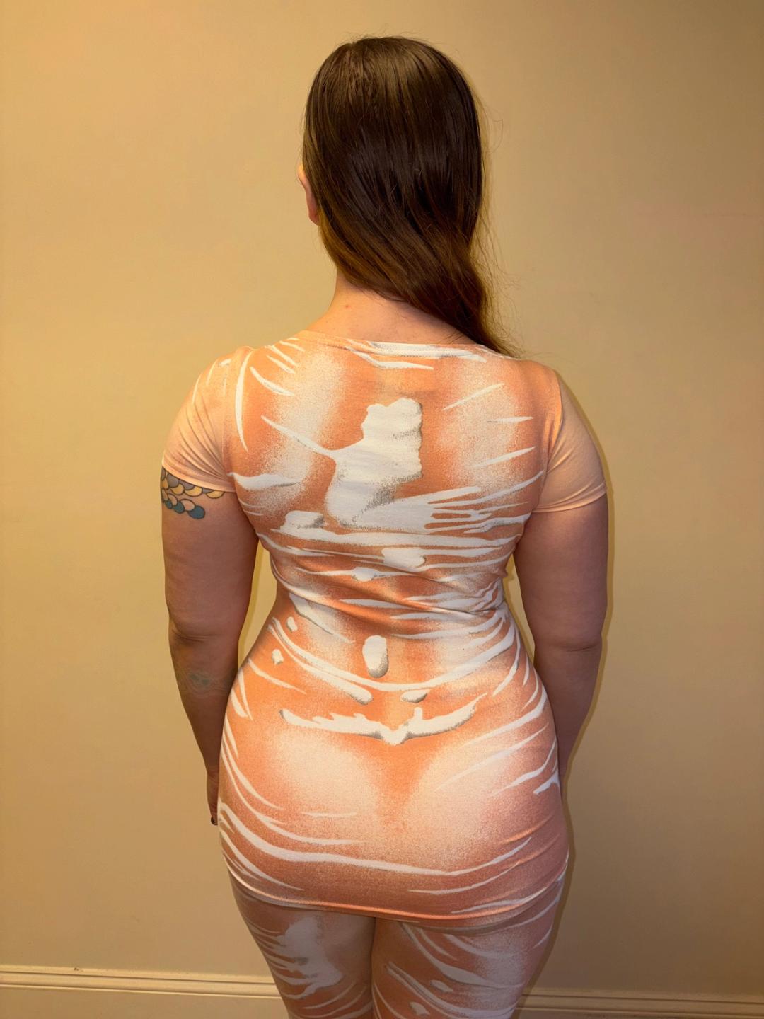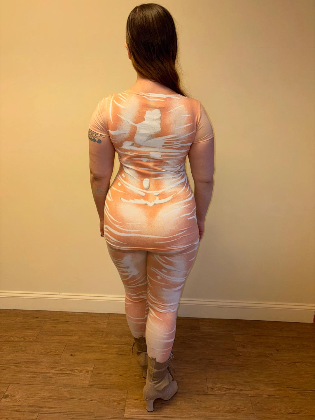 Amazing 1980s or early 90s Krizia Maglia two piece set with surreal animalic pink print throughout. It consists of a contoured t-shirt and leggings. The top is in excellent condition, while the leggings have more signs of use. They have some light scuff marks on the knees and wear between the legs with small repairs. Priced accordingly. Krizia often innovates on animal imagery throughout her designs, spanning decades.