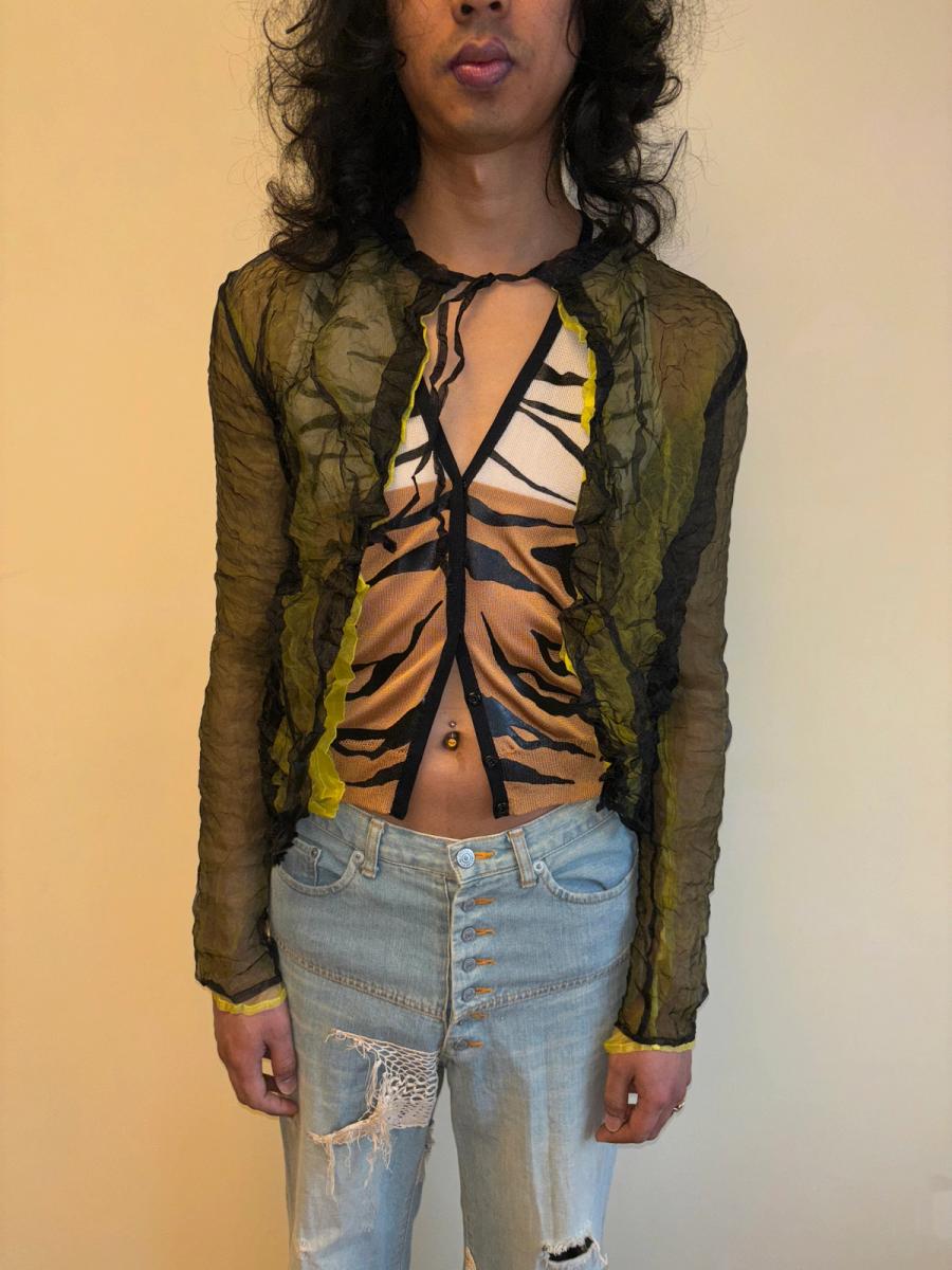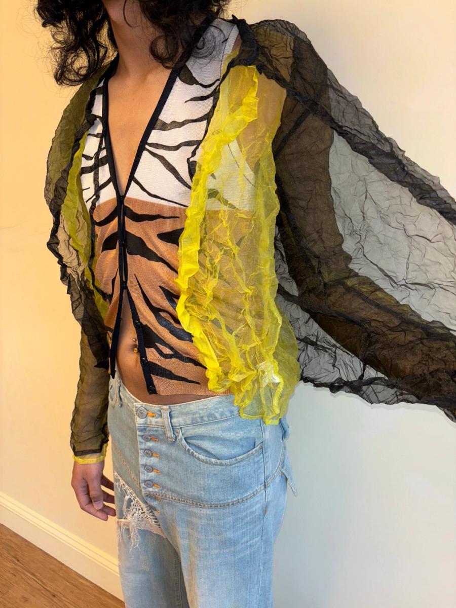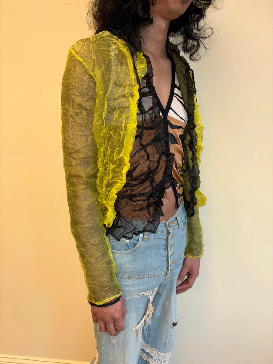 Late 90s Krizia wrinkle pleated over-shirt. Black and lime green 2 ply reversible jacket with delicate tie at the neck.